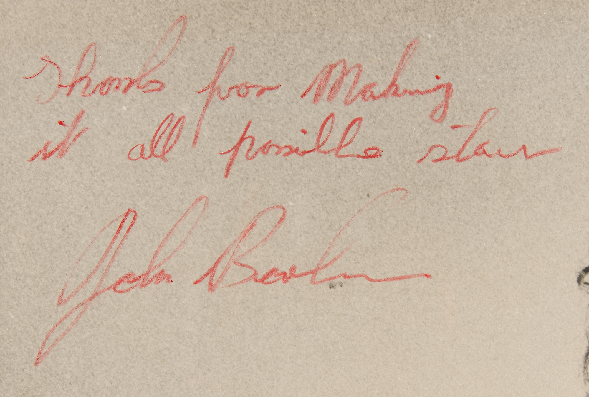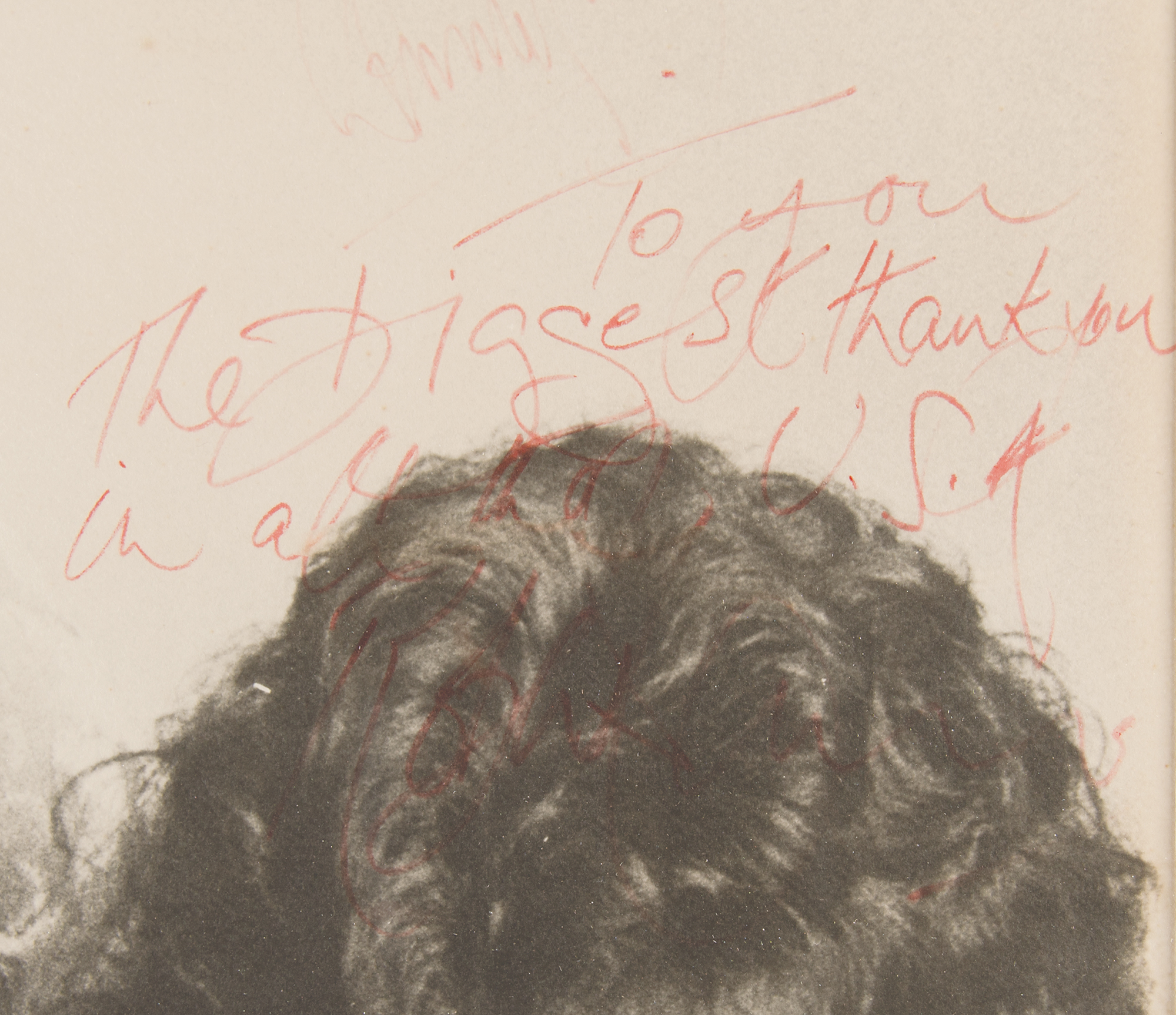 Massive vintage circa 1969 matte-finish 19.5 x 23.5 photo of Led Zeppelin, lovingly signed and inscribed by three in red felt tip to the band's management attorney Steve Weiss, "Thanks for making it all possible Steve, John Bonham," "To Steve, Thanks for everything, Jimmy Page," and "To you, the biggest thank you in all the U.S.A., Robert Plant.” Nicely matted and framed to an overall size of 26 x 29.5. In fine condition, with fading to Page's signature, and poor contrast to Plant's signature.