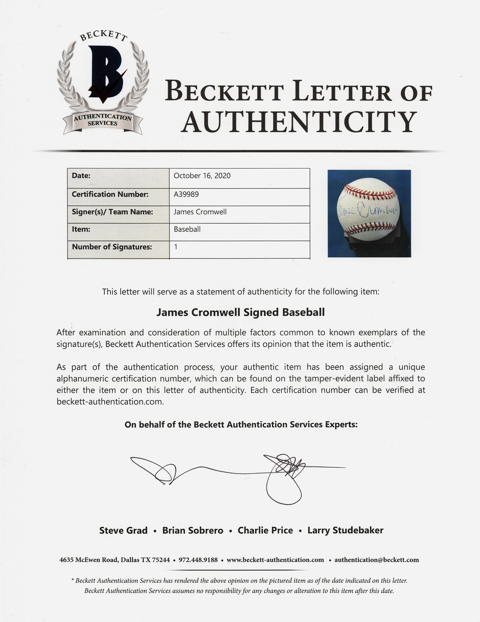 Official Rawlings American League (Budig) baseball signed in blue ballpoint on the sweet spot by James Cromwell. In very fine condition, with a Beckett label affixed to the rear. Accompanied by a full letter of authenticity from Beckett Authentication Services and an image of Cromwell signing the baseball.