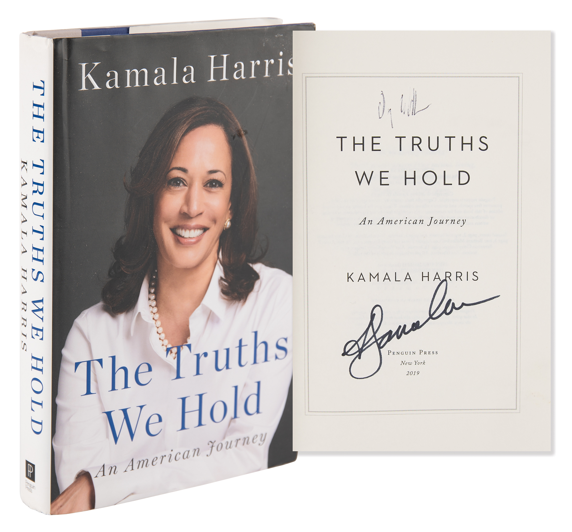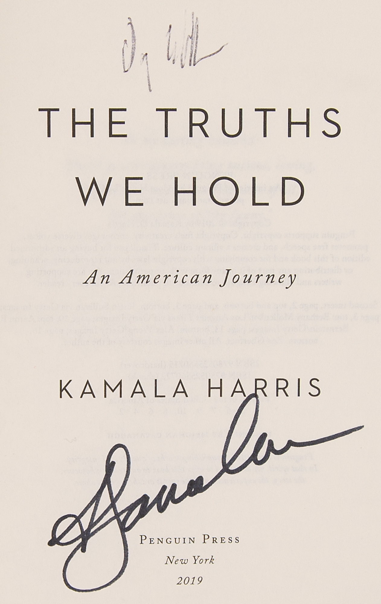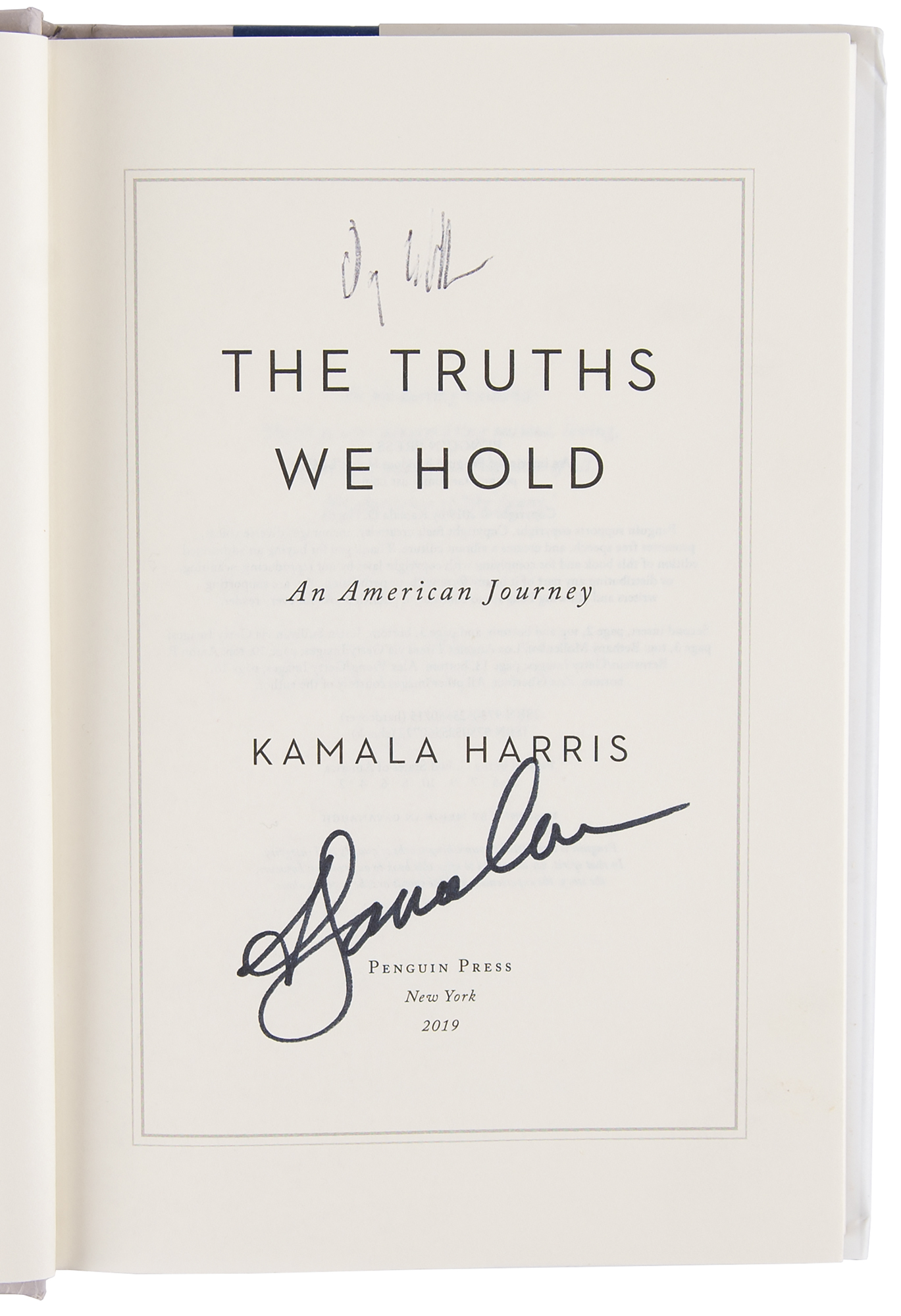 Signed book: The Truths We Hold. First edition. NY: Penguin Press, 2019. Hardcover with dust jacket, 6.25 x 9.5, 318 pages. Signed on the title page in black felt tip by Kamala Harris, and in black ballpoint by her husband, Doug Emhoff. In fine condition, with slightly bumped corners. Consignor notes that the autographs were obtained at a book signing in Los Angeles in 2019.