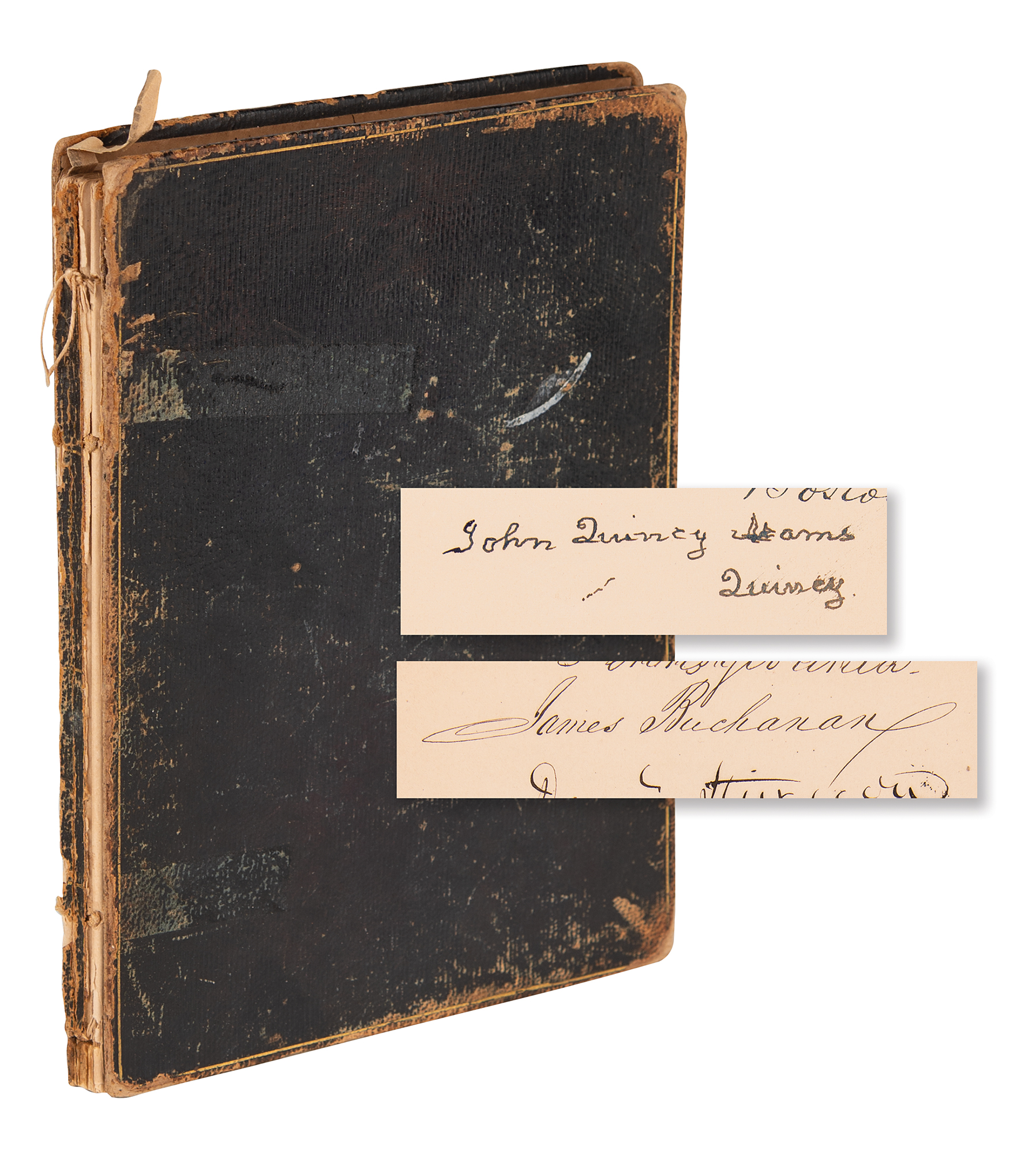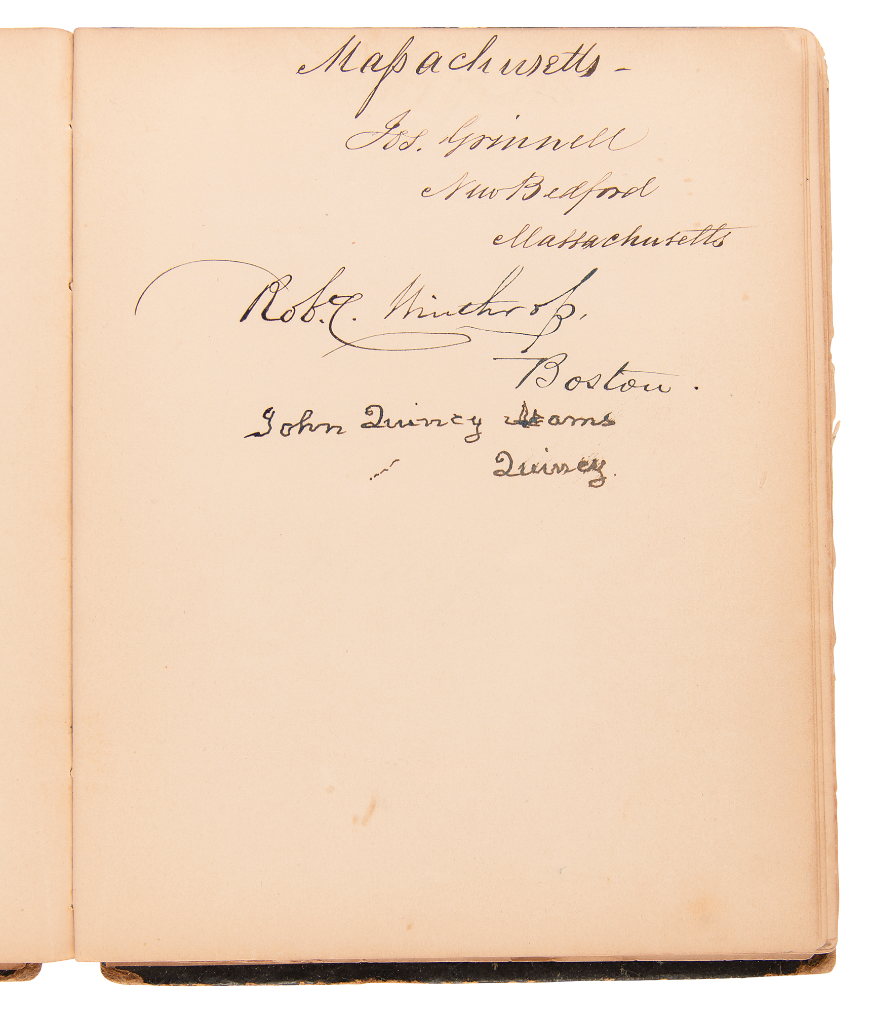 Autograph album from 1844 containing over 120 signatures of notable American politicians, 6.5 x 8.5, including several notable cabinet members of President John Tyler, in addition to a large number of senators and representatives from the 28th United States Congress. The album is highlighted by the signatures of John Quincy Adams and James Buchanan, who sign as a Massachusetts representative and as a Pennsylvania senator, respectively. Cabinet members include Secretary of States John C. Calhoun and Abel P. Upshur, Secretary of War William Wilkins, Secretary of the Navy John Y. Mason, Secretary of the Treasury George M. Bibb, Postmaster General Charles A. Wickliffe, and Attorney General John Nelson. Congressional figures include David Rice Atchison, Willie P. Mangum, Jabez W. Huntington, John M. Niles, Thomas Clayton, Richard H. Bayard, John J. Crittenden, George Evans, Rufus Choate, Isaac C. Bates, Levi Woodbury, John A. McClernand, Robert C. Winthrop, Joseph Grinnell, and more. The album contains five pages individually signed by a cabinet member, 12 pages signed by 54 senators, and 19 pages signed by 53 house representatives. In very good to fine condition, with the covers detached, and several pages loose, but interior pages are generally clean and fine.