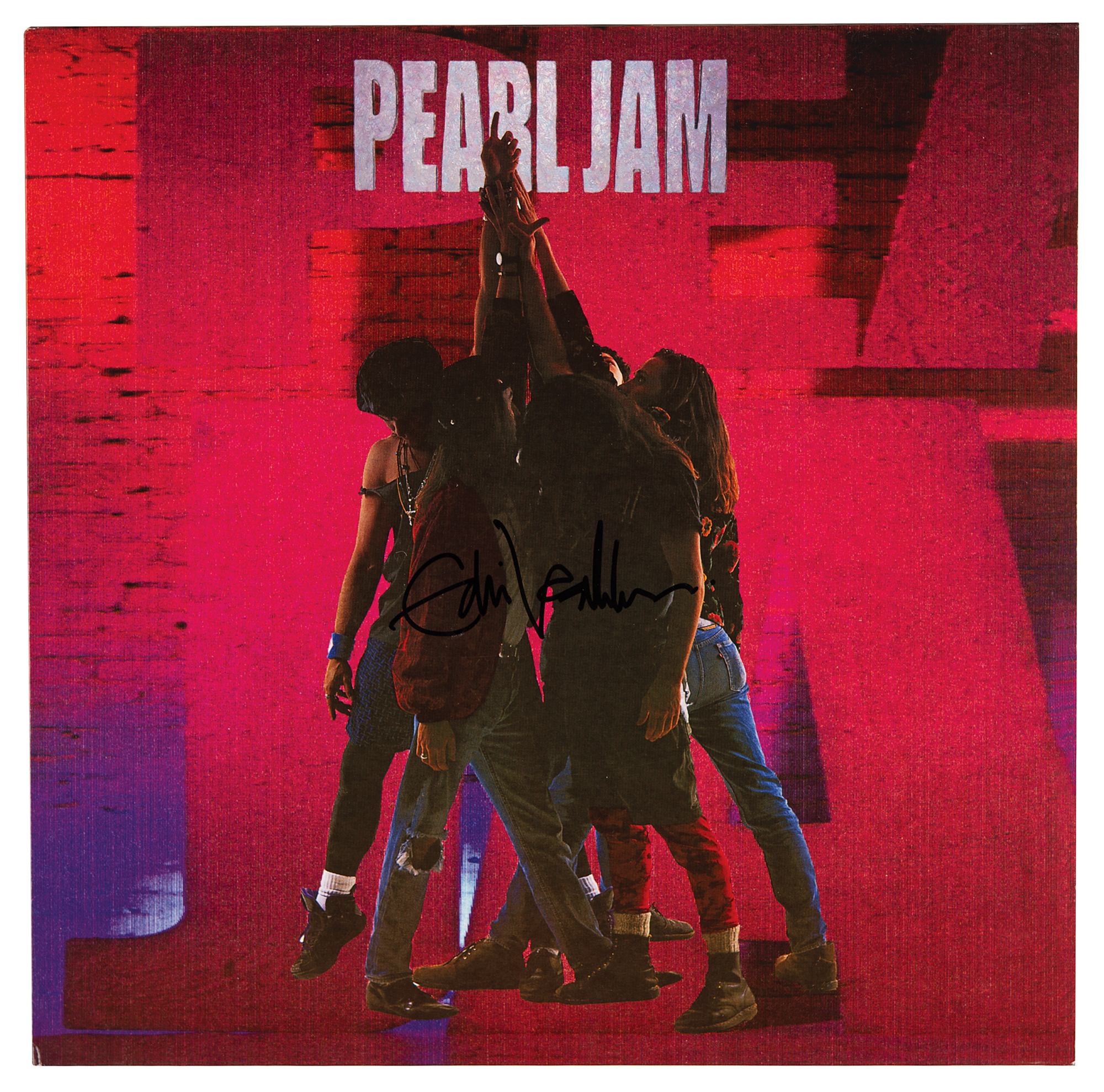 Ten album by Pearl Jam, signed on the front cover in black felt tip by Eddie Vedder. In very fine condition. The record is included. Accompanied by a full letter of authenticity from JSA.
