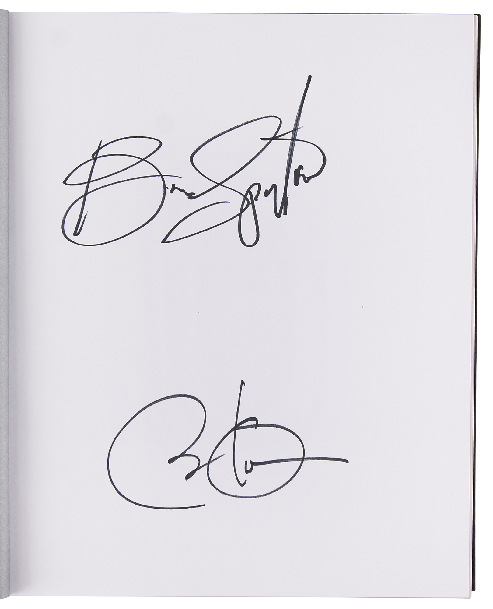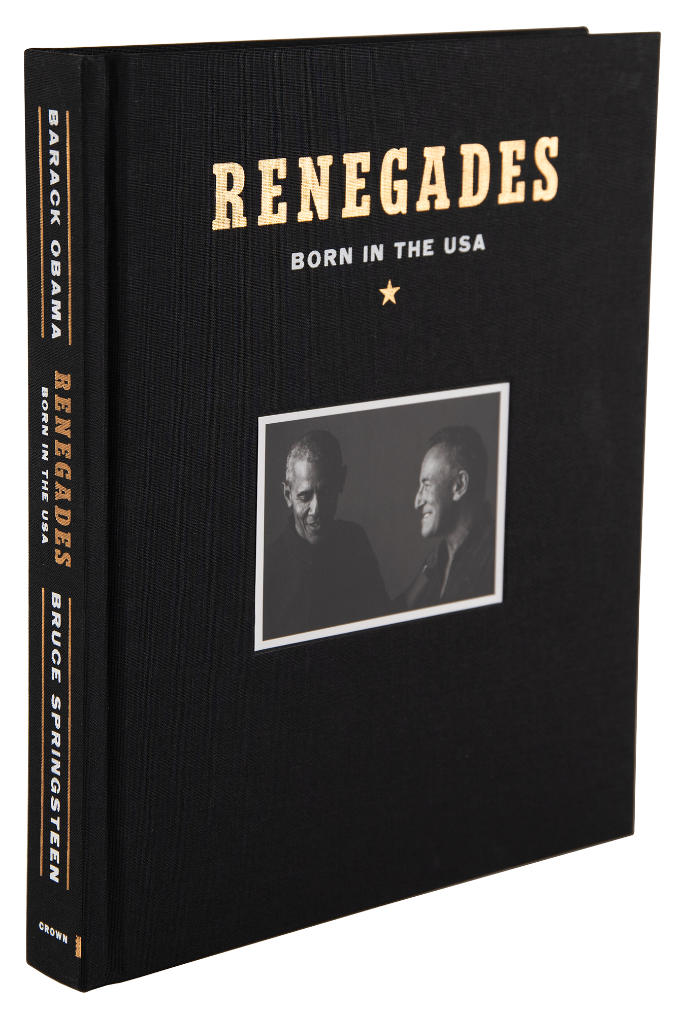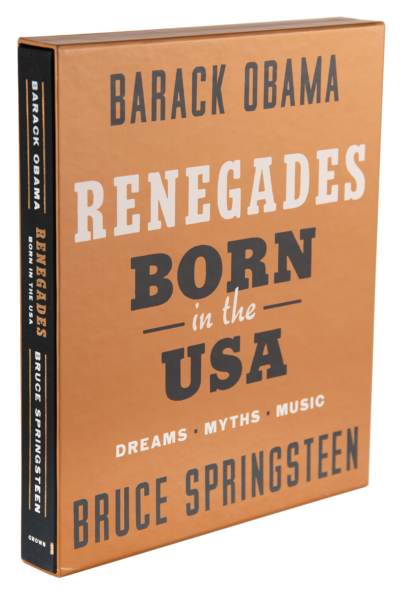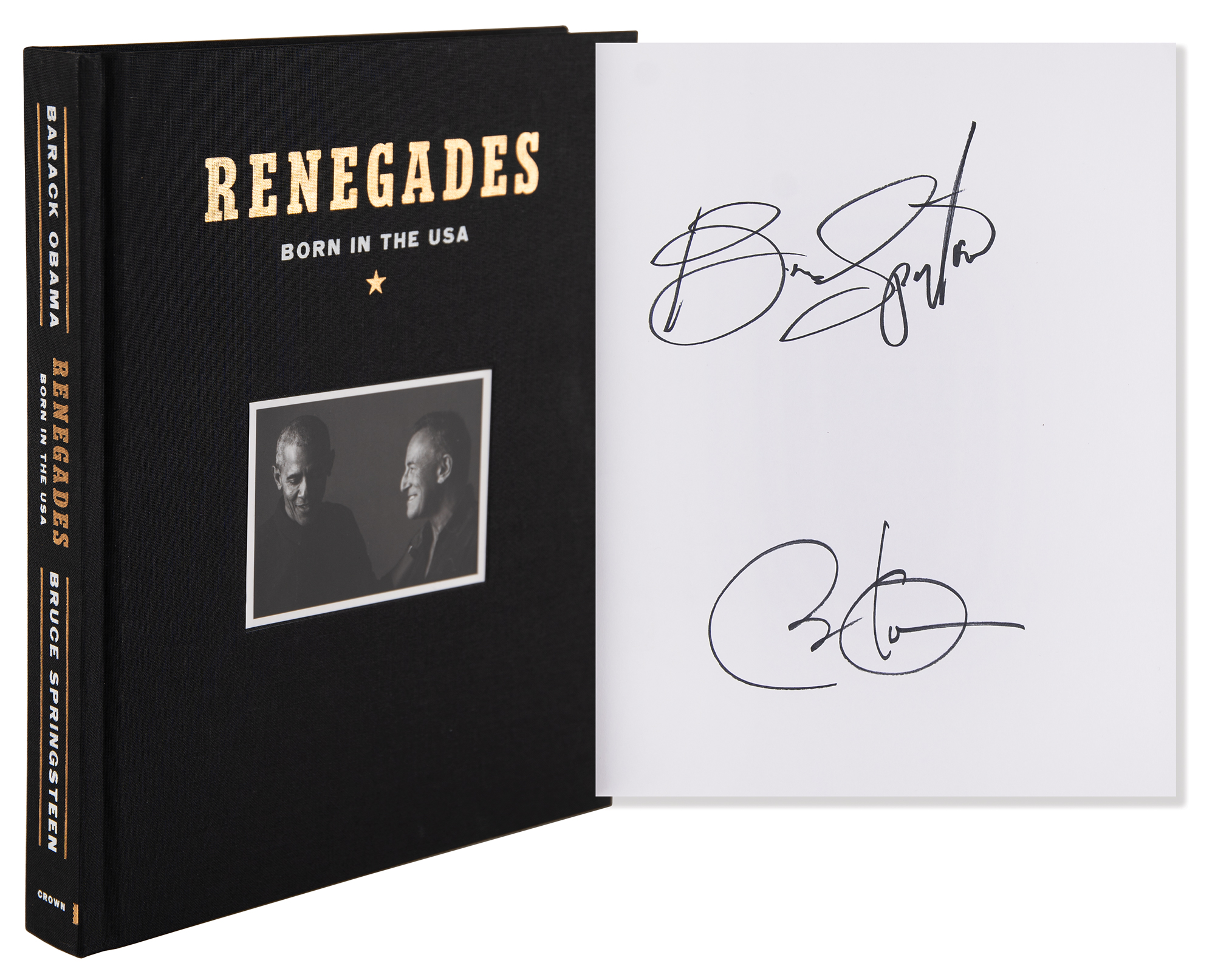 Signed book: Renegades: Born in the USA. Deluxe first edition. NY: Crown Publishing, 2021. Hardcover with slipcase, 9.5 x 11.5, 303 pages. Signed prominently on an opening page in black felt tip by Barack Obama and Bruce Springsteen. In very fine condition. A sought-after and beautifully produced expansion of their groundbreaking Higher Ground podcast, featuring more than 350 photographs, exclusive bonus content, and never-before-seen archival material.