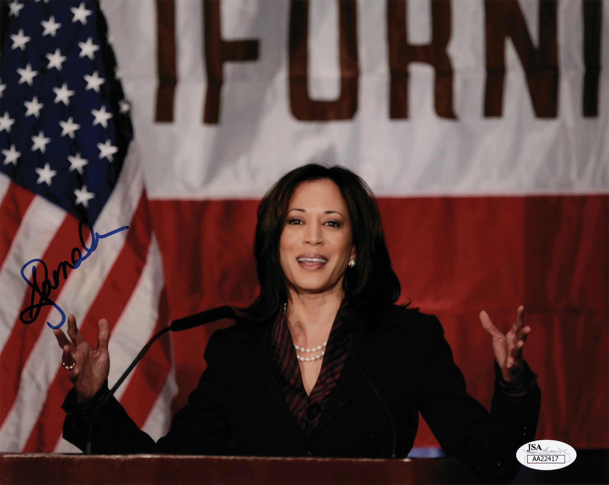 Color satin-finish 10 x 8 photo of Kamala Harris giving a speech, signed in blue felt tip, "Kamala." In very fine condition, with a JSA label affixed to the lower right corner. Accompanied by a certificate of authenticity from JSA.