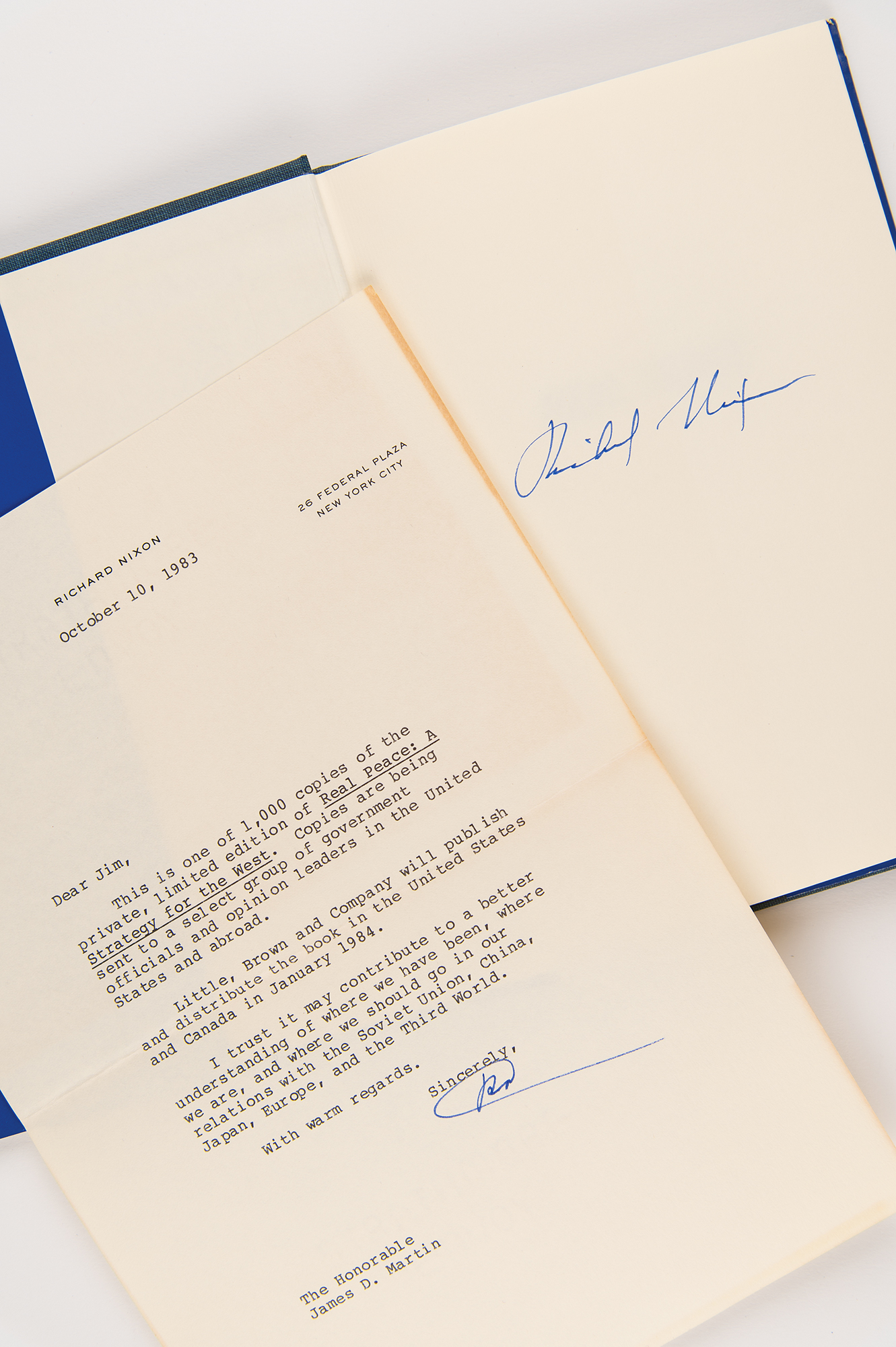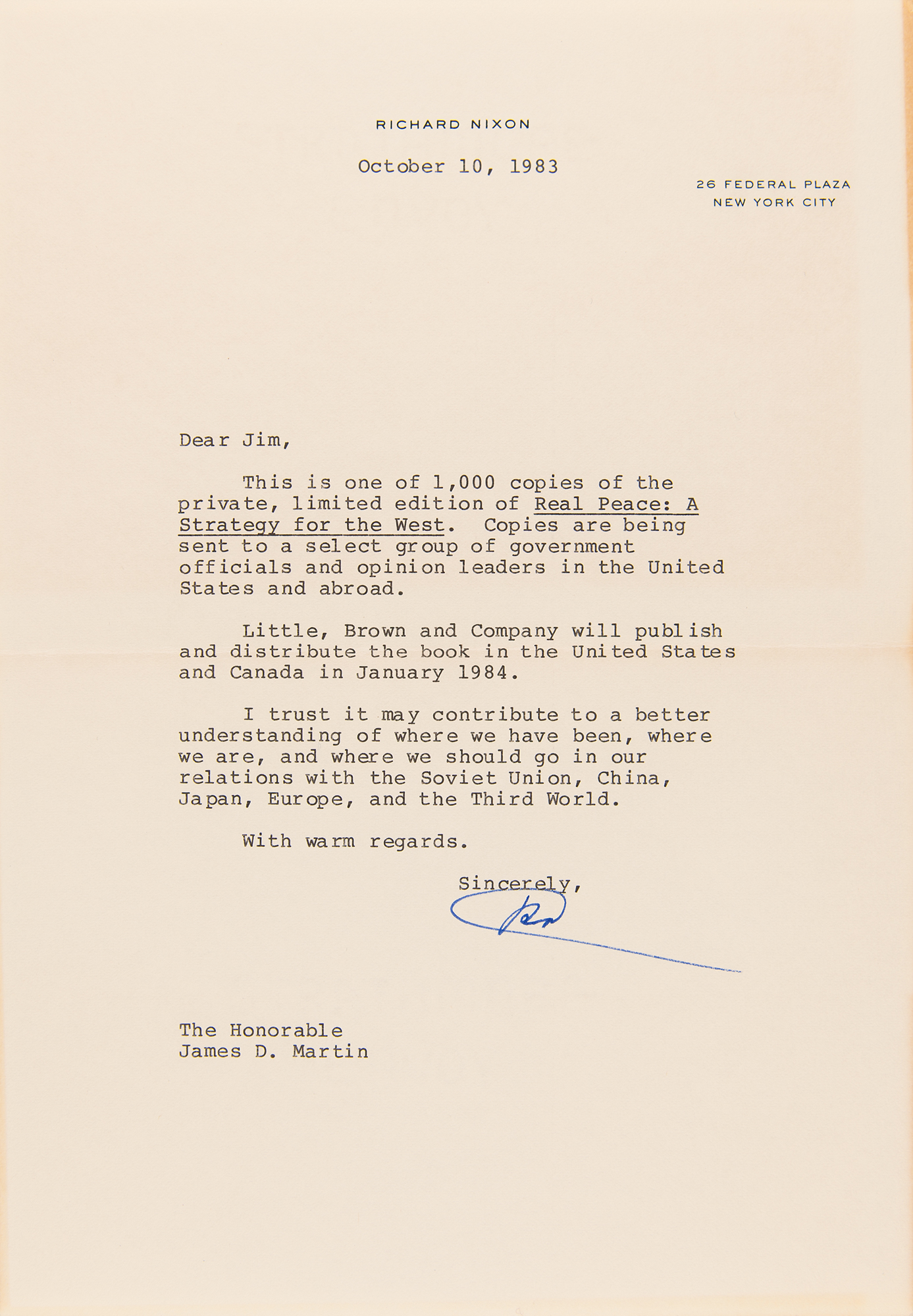 TLS signed “RN,” one page, 7.25 x 10.5, personal letterhead, October 10, 1983. Letter to former Alabama state representative James D. Martin, in full: “This is one of 1,000 copies of the private, limited edition of Real Peace: A Strategy for the West. Copies are being sent to a select group of government officials and opinion leaders in the United States and abroad. Little, Brown and Company will publish and distribute the book in the United States and Canada in January 1984. I trust it may contribute to a better understanding of where we have been, where we are, and where we should go in our relations with the Soviet Union, China, Japan, Europe, and the Third World.”