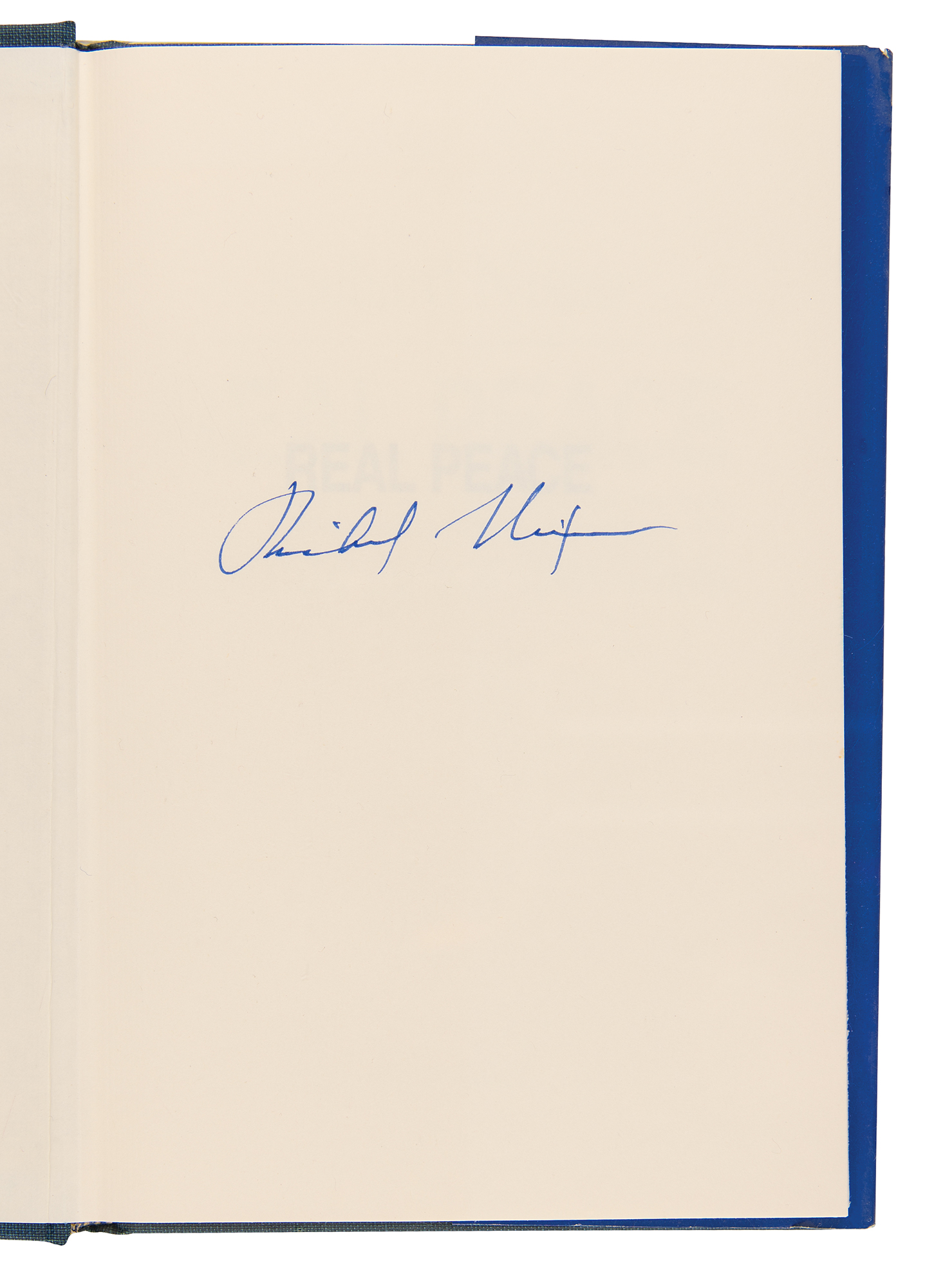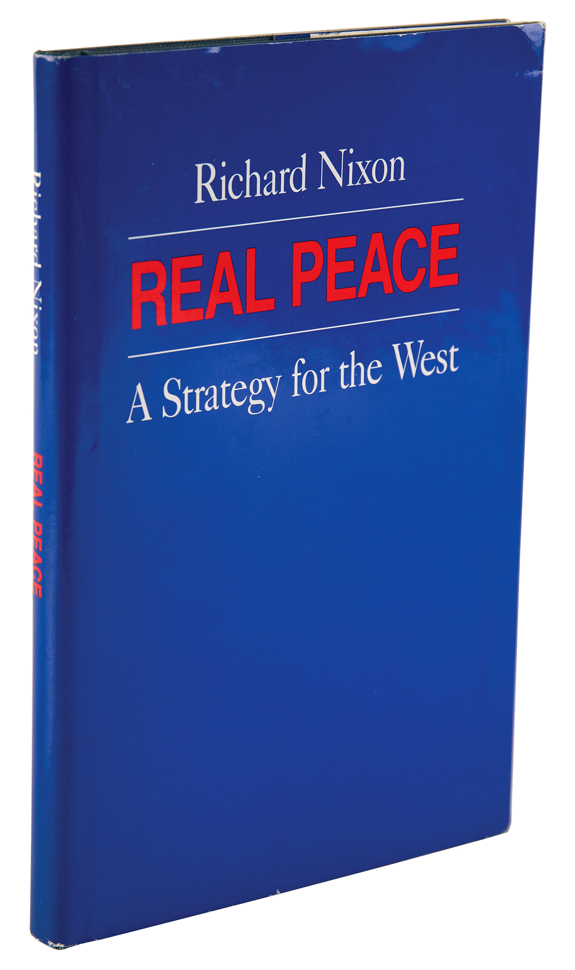 Signed book: Real Peace: A Strategy for the West. First edition, first printing. NY: Privately printed, 1983. Hardcover with dust jacket, 5.75 x 8.5, 106 pages. Signed nicely on the first free end page in thin blue felt tip, “Richard Nixon.”