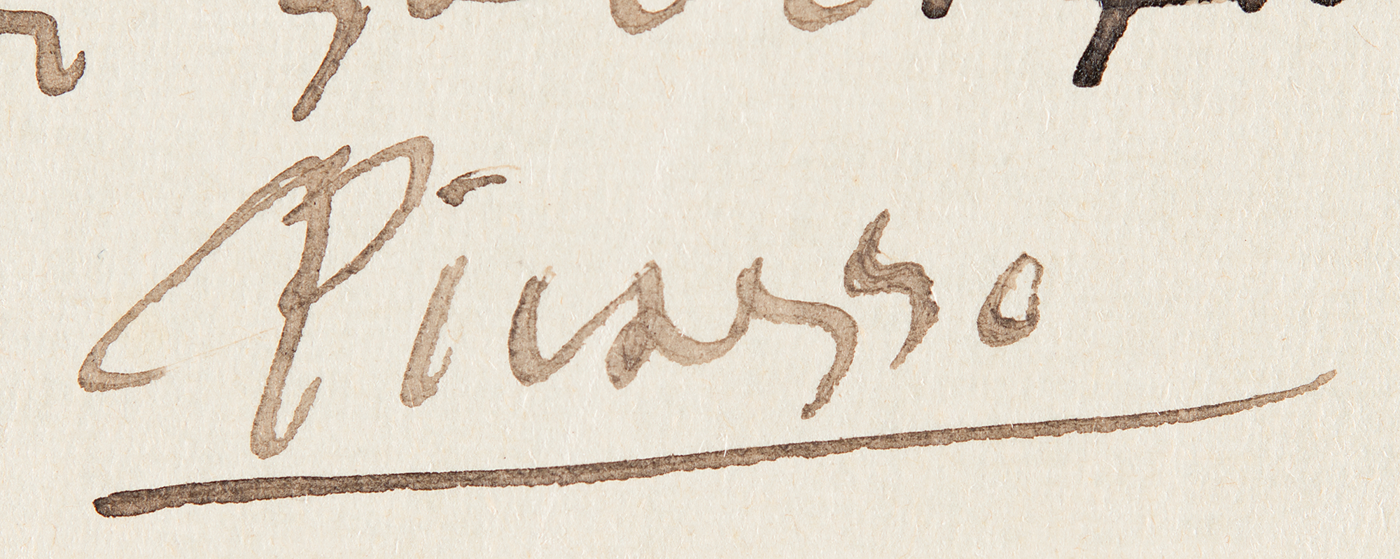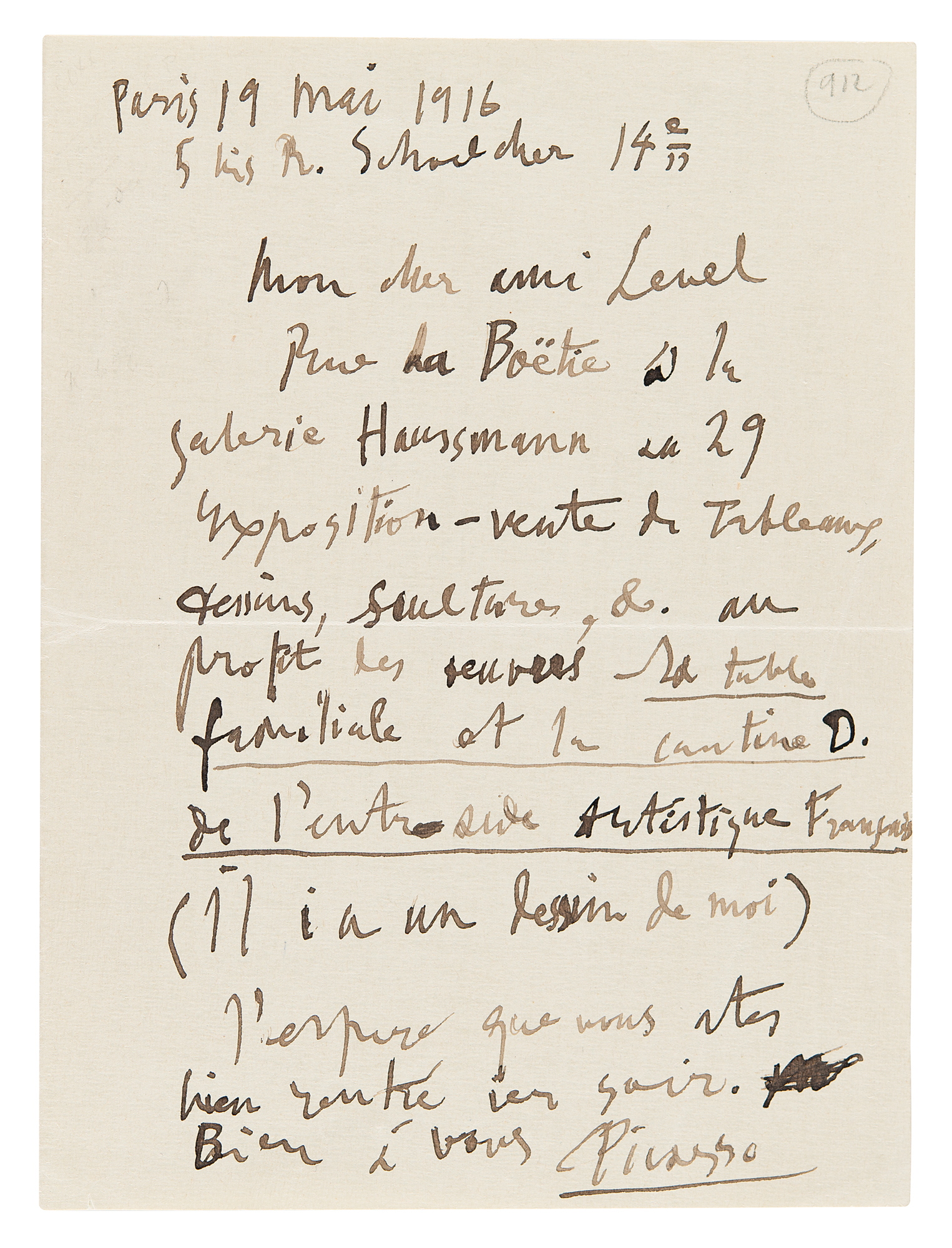 Rare ALS in French, signed “Picasso,” one page, 5.25 x 7, May 19, 1916. Addressed from “5 bis rue Victor Schoelcher” in Paris, a handwritten letter from Pablo Picasso to his friend André Level, in full (translated): “Rue la Boétie at the Haussmann gallery at 29 exhibition—sale of paintings, drawings, sculptures, &. for the benefit of the works La Table familiale and la Cantine D of the Entraide Artistique Française (there is a drawing by me). I hope you got home safely last night.” In fine condition.