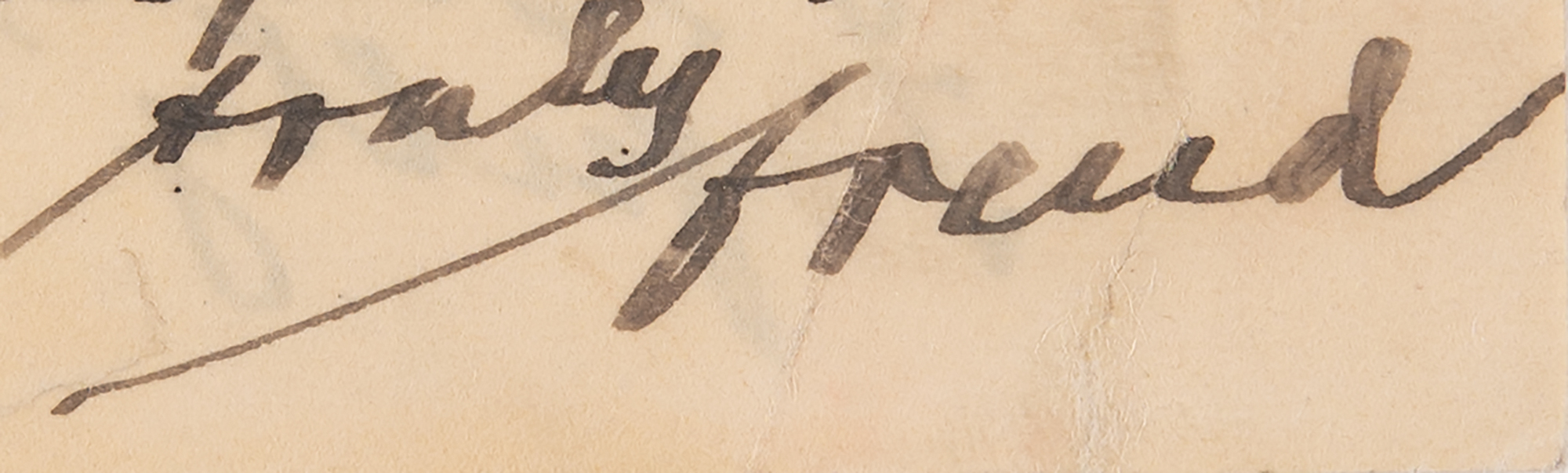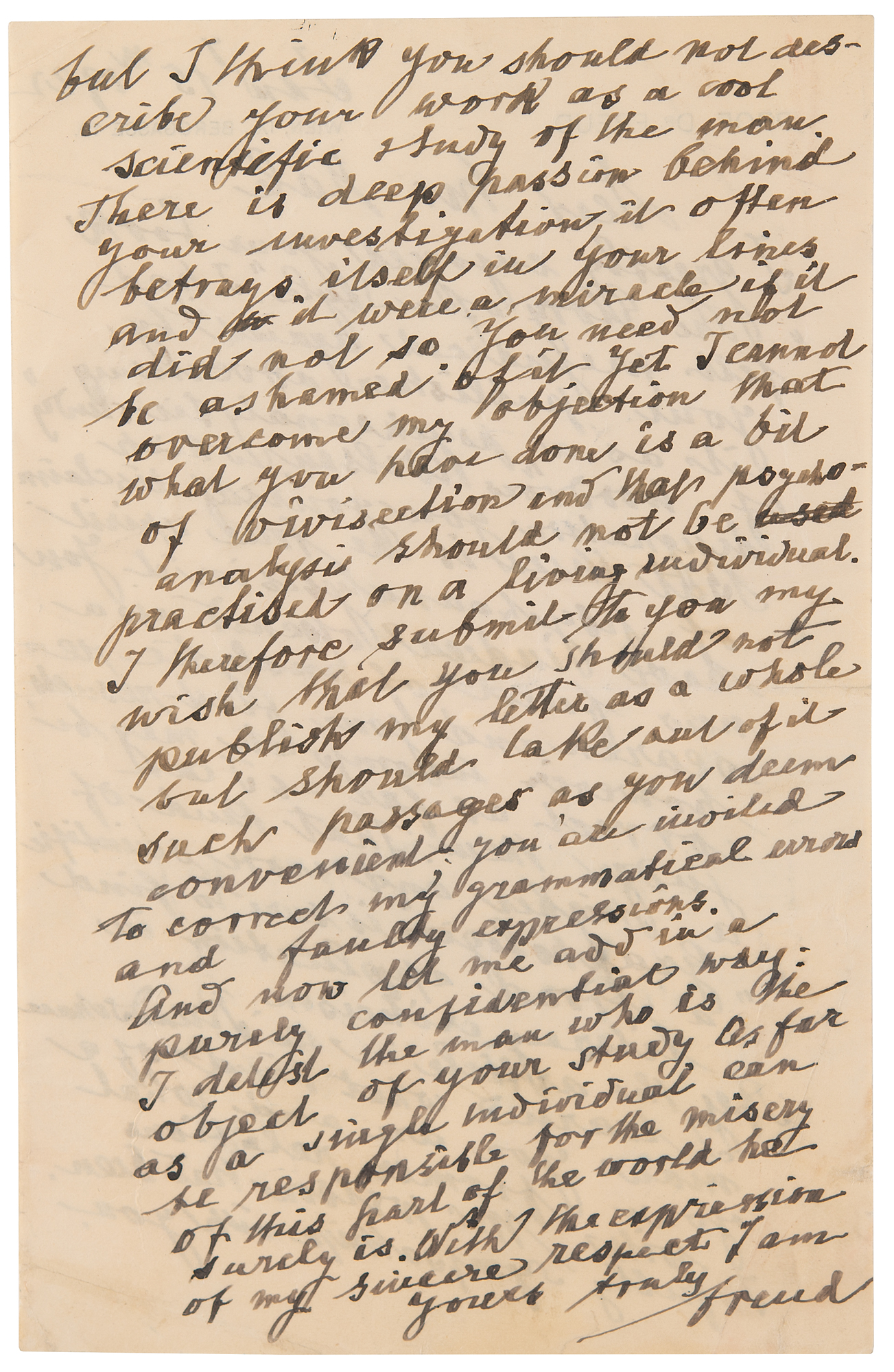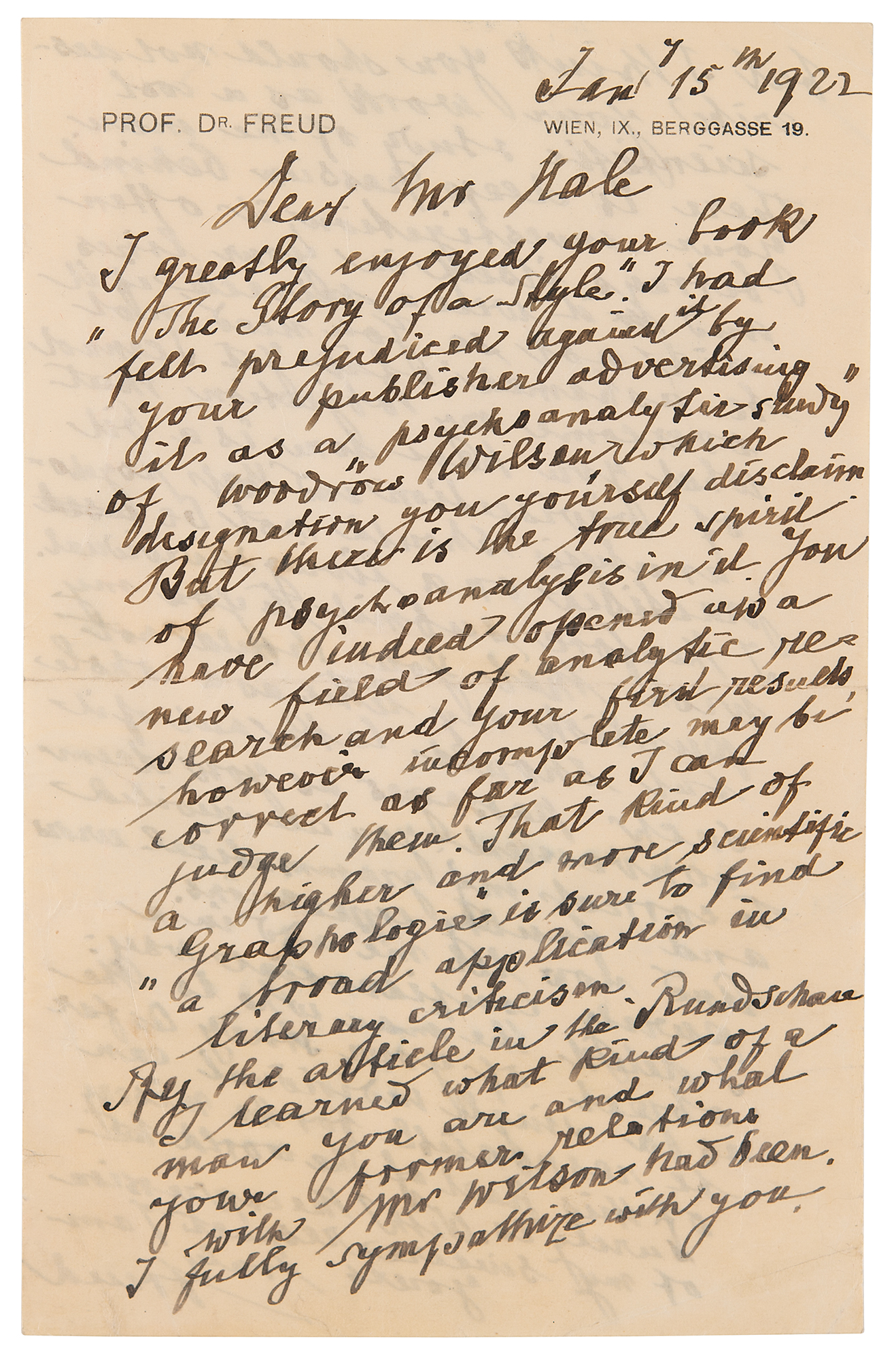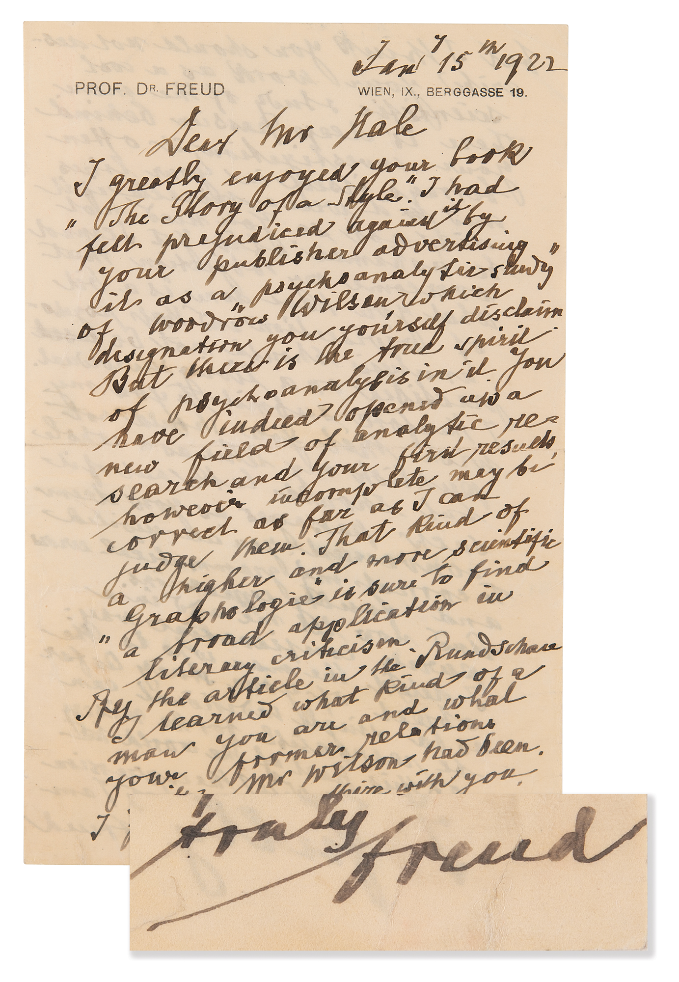 Rare English-language ALS signed “Freud,” one page both sides, 5.25 x 8.25, personal letterhead, January 15, 1922. Handwritten letter to American journalist William Bayard Hale, in full: “I greatly enjoyed your book, ‘The Story of a Style.’ I had felt prejudiced against it by your publisher advertising it as a ‘psychoanalytic study’ of Woodrow Wilson, which designation you yourself disclaim. But there is the true spirit of psychoanalysis in it. You have indeed opened up a new field of analytic research and your first results however incomplete may be correct as far as I can judge them. That kind of a higher and more scientific ‘graphologie’ is sure to find a broad application in literary criticism. By the article in the Rundschau I learned what kind of a man you are and what your former relations with Mr. Wilson had been. I fully sympathize with you but I think you should not describe your work as a cool scientific study of the man. There is a deep passion behind your investigation, it often betrays itself in your lines and it were a miracle if it did not so. You need not be ashamed of it, yet I cannot overcome my objection that what you have done is a bit of vivisection and that psychoanalysis should not be [used] practiced on a living individual. I therefore submit to you my wish that you should not publish my letter as a whole but should take out of it such passages as you deem convenient; you are invited to correct my grammatical errors and faulty impressions. And now let me add in a purely confidential way: I detest the man who is the object of your study. As far as a single individual can be responsible for the misery of this part of the world he surely is. With the expression of my sincere respect.” In fine condition.
