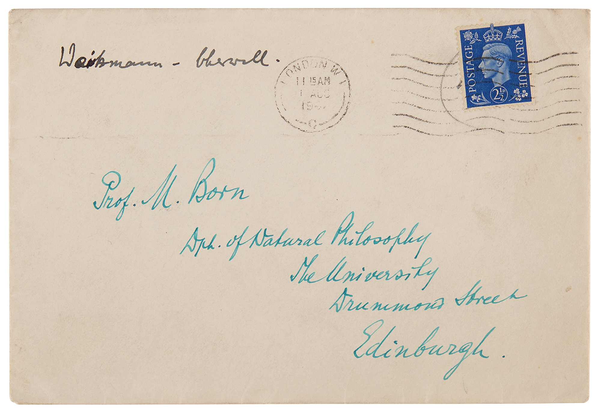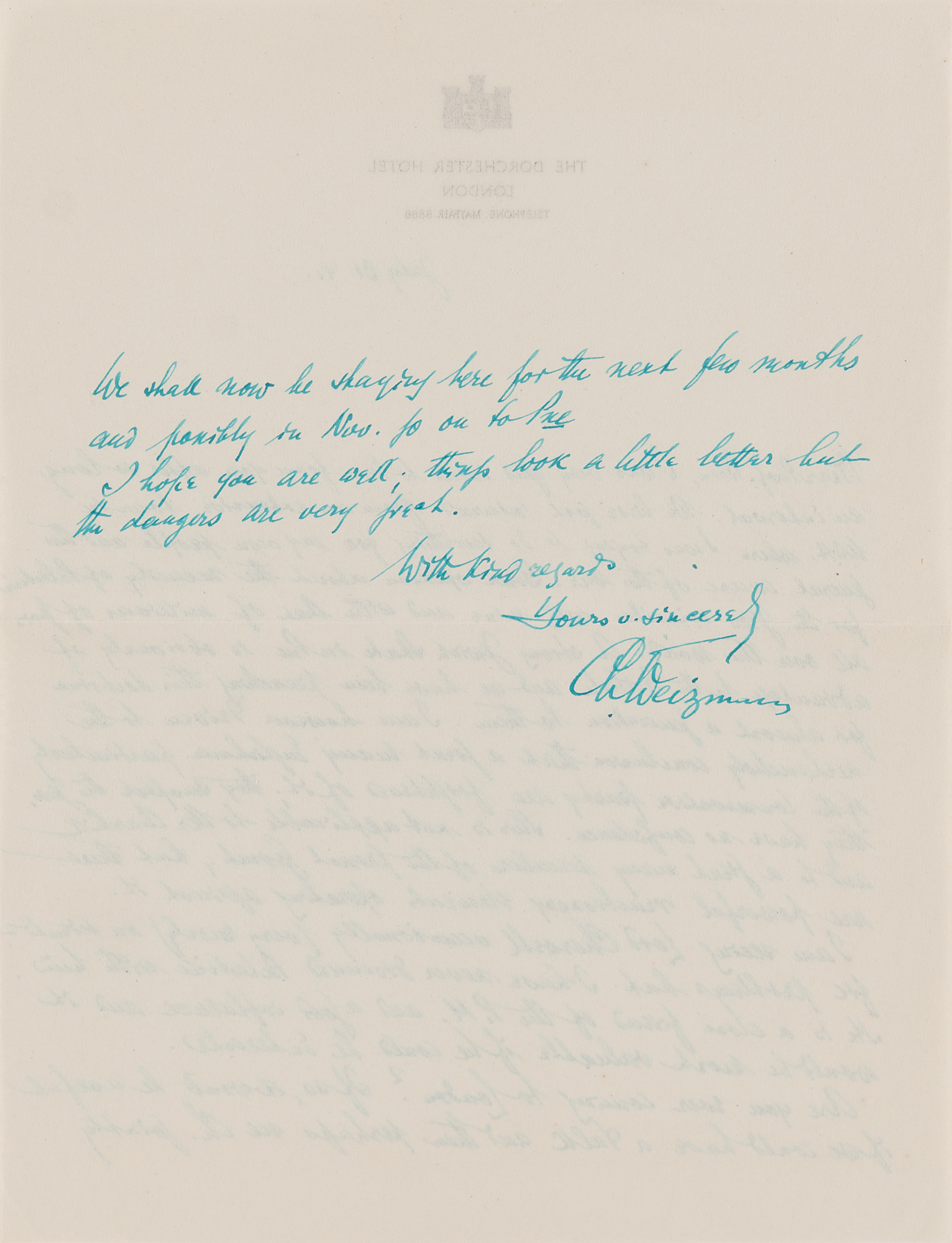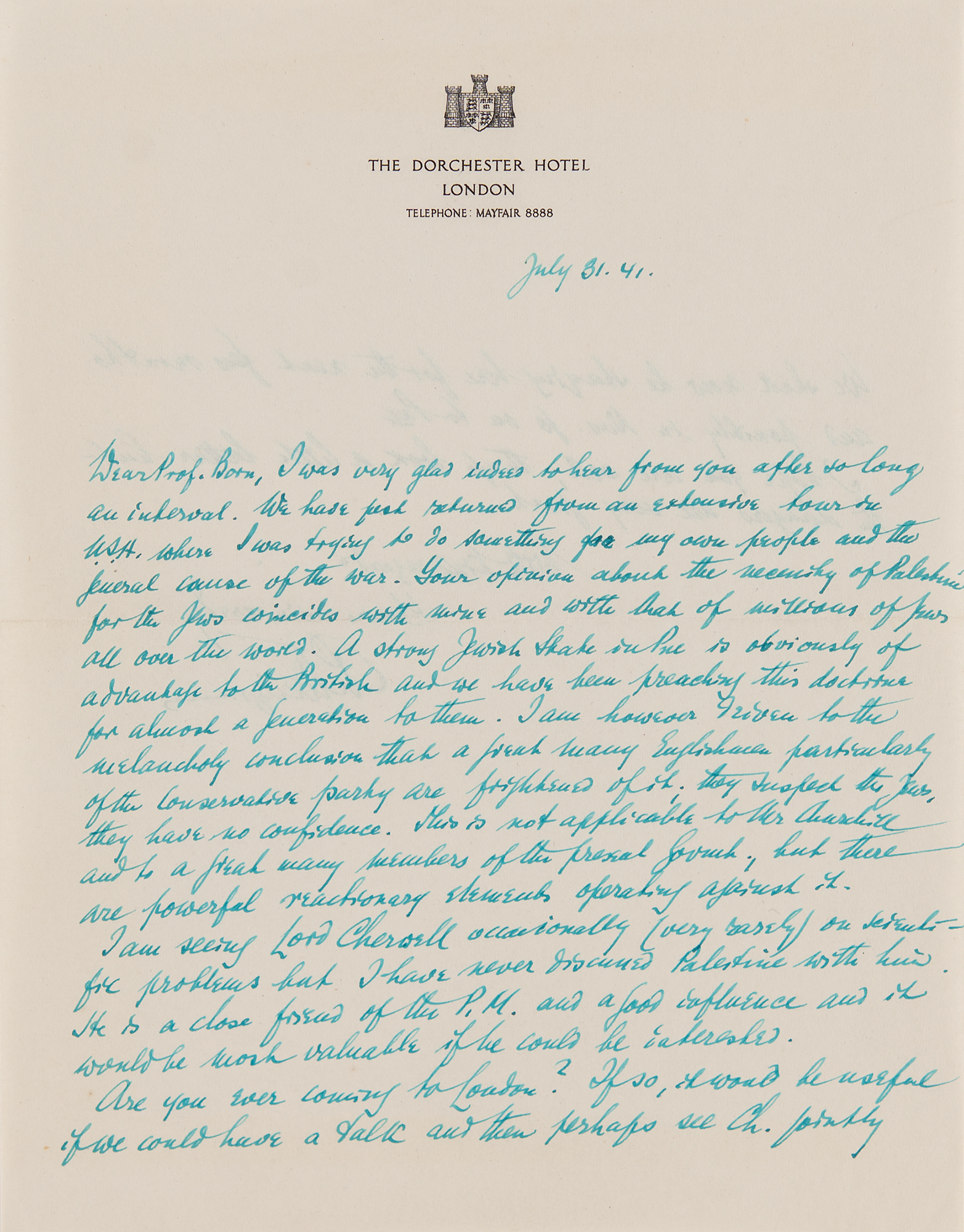 World War II-dated ALS signed “Ch. Weizmann,” one page both sides, 6 x 8, The Dorchester Hotel (London) letterhead, July 31, 1941. Content-rich handwritten letter to Nobel Prize-winning physicist Max Born in Edinburgh, discussing English resistance to the creation of a Jewish state in Palestine and asking Born to connect him with the influential physicist Frederick Lindemann, in full: “I was very glad indeed to hear from you after so long an interval. We have just returned from an extensive tour in the U.S.A., where I was trying to do something for my own people and the general cause of the war. Your opinion about the necessity of Palestine for the Jews coincides with mine and with that of millions of Jews all over the world. A strong Jewish State in P’ne is obviously of advantage to the British and we have been preaching this doctrine for almost a generation to them. I am however driven to the melancholy conclusion that a large number of Englishmen, particularly of the Conservative Party are frightened of it; they suspect the Jews, they have no confidence. This does not apply to Mr. Churchill and to a great many members of the present Govt, but there are powerful reactionary elements operating against it. I am seeing Lord Cherwell [Frederick Lindemann] occasionally (very rarely) on scientific problems but I have never discussed Palestine with him. He is a close friend of the P.M. and a good influence and it would be most valuable if he could be interested. Are you ever coming to London? If so, it would be useful if we could have a talk and then perhaps see Ch. jointly. We shall now be staying here for the next few months and possibly in Nov. & on to P’ne. I hope you are well; things look a little better but the dangers are very great.” In fine condition. Accompanied by the original hand-addressed mailing envelope.