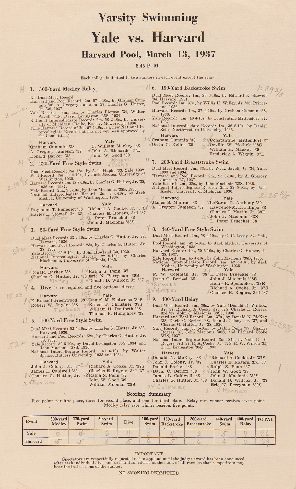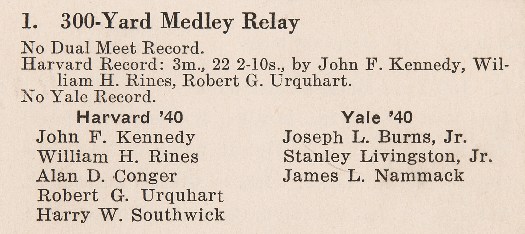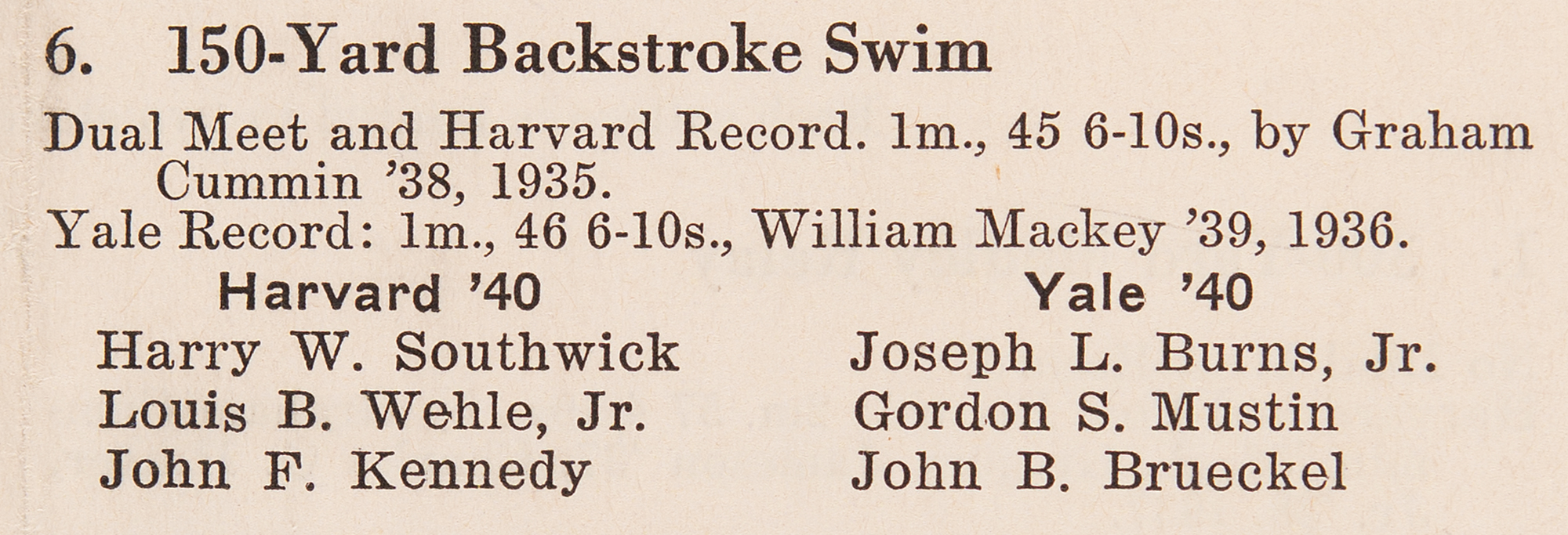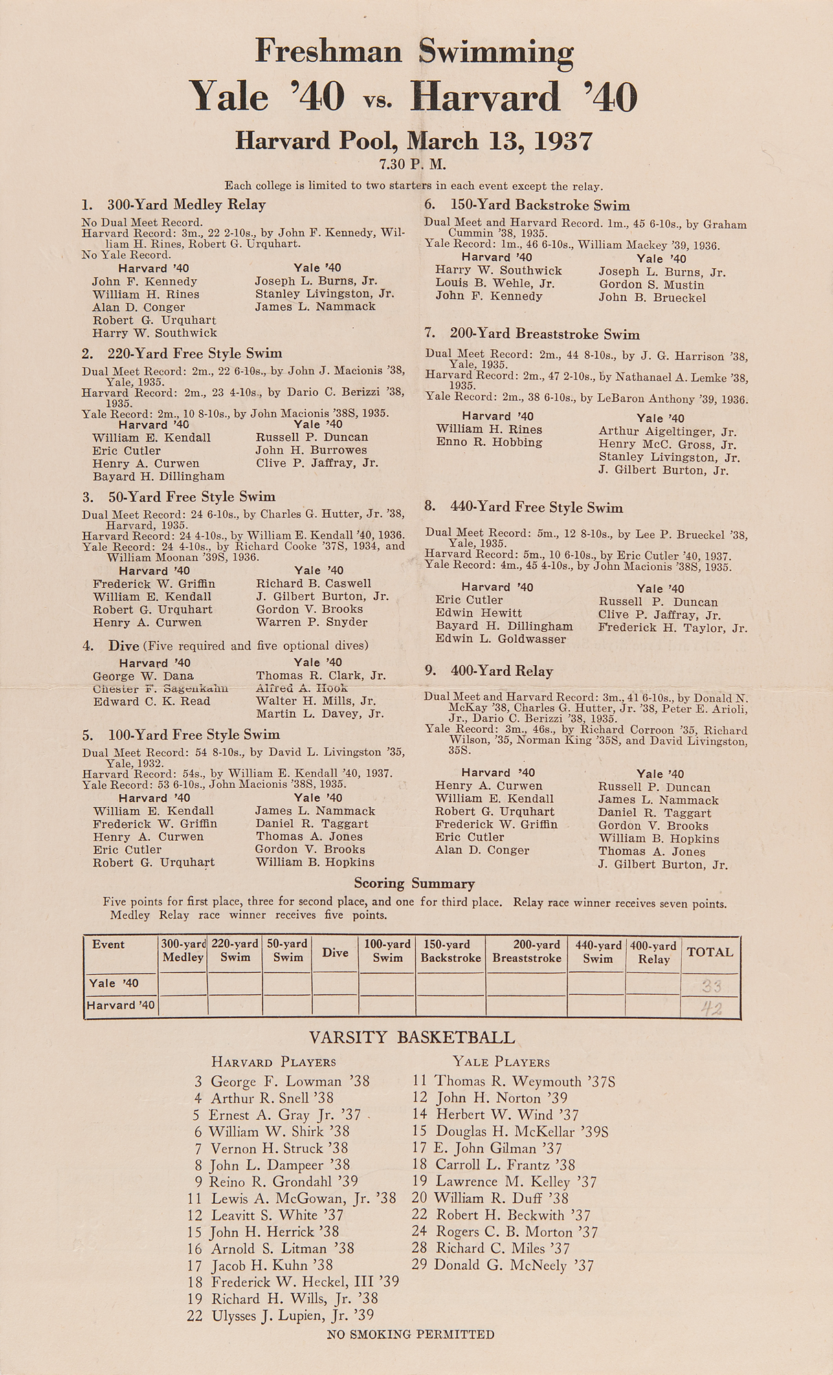 Scarce original 7.25 x 12.75 double-sided program sheet for "Freshman Swimming, Yale '40 vs. Harvard '40, Harvard Pool, March 13, 1937," listing Harvard's John F. Kennedy as a swimmer participating in the "300-Yard Medley Relay" and "150-Yard Backstroke Swim." The reverse is annotated in pencil with results from the races: Harvard finished in first place in both of JFK's events, and outscored Yale for the meet as a whole. In fine condition.