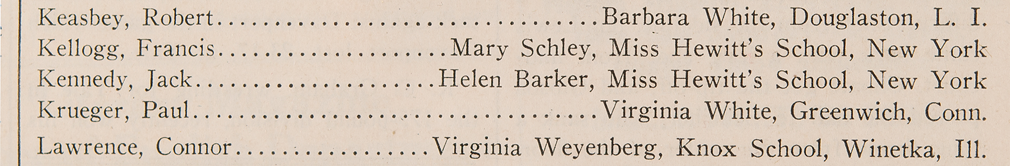 Complete "Festivities Issue" of The Choate News (Vol. XXIX, No. 16) from February 22, 1935, 13 x 17.75, eight pages, listing "Jack Kennedy" and his date for a dance, "Helen Barker, Miss Hewitt's School, New York," in a list of "Festivities Guests and Escorts" on the fourth page. In very good to fine condition, with light handling wear and unobtrusive tape reinforcement to small edge tears.