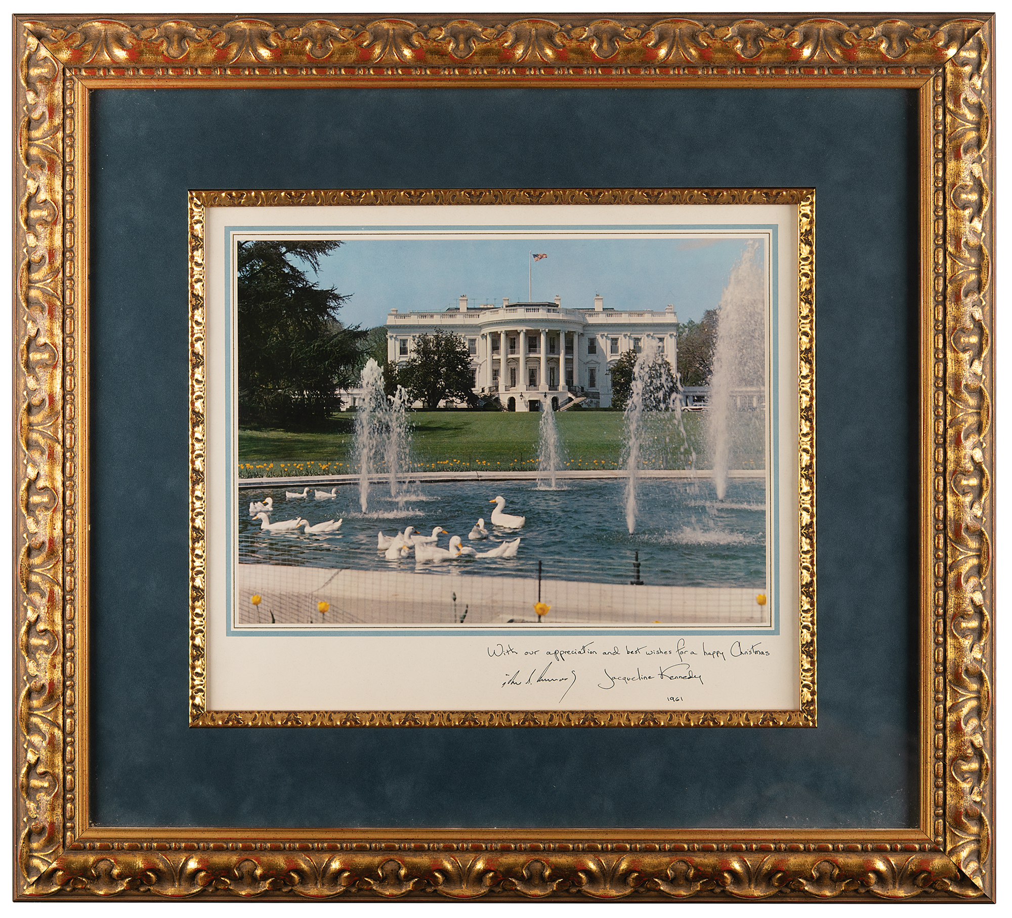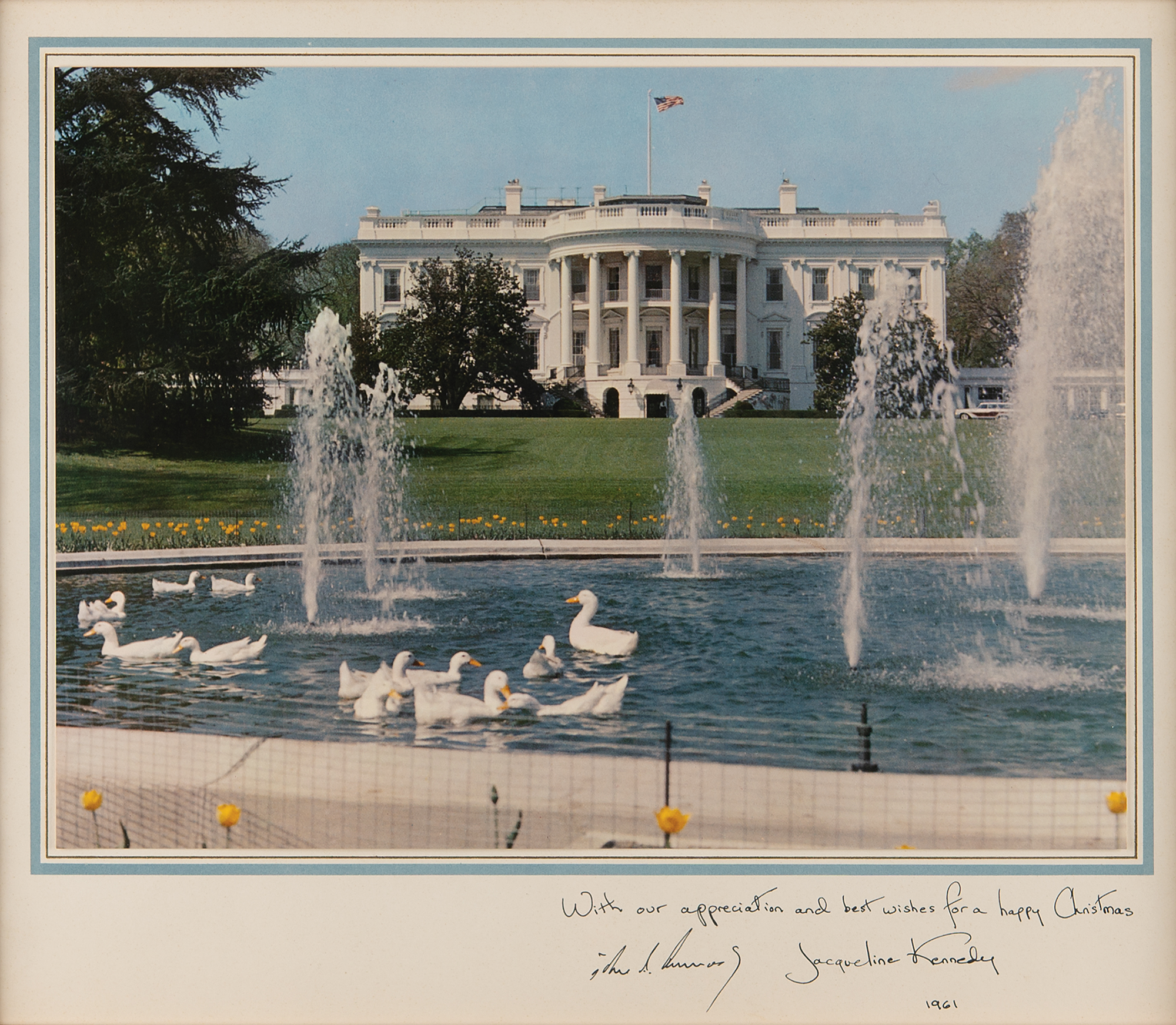 Gorgeous color glossy 14.75 x 12.75 mounted photo by famed White House photographer Cecil Stoughton, showing Caroline's ducks in the fountain on the South Lawn, with "With our appreciation and best wishes for a happy Christmas, John F. Kennedy, Jacqueline Kennedy, 1961" printed in facsimile below. Attractively suede-matted and ornately framed to an overall size of 24.75 x 22.5. In fine condition.