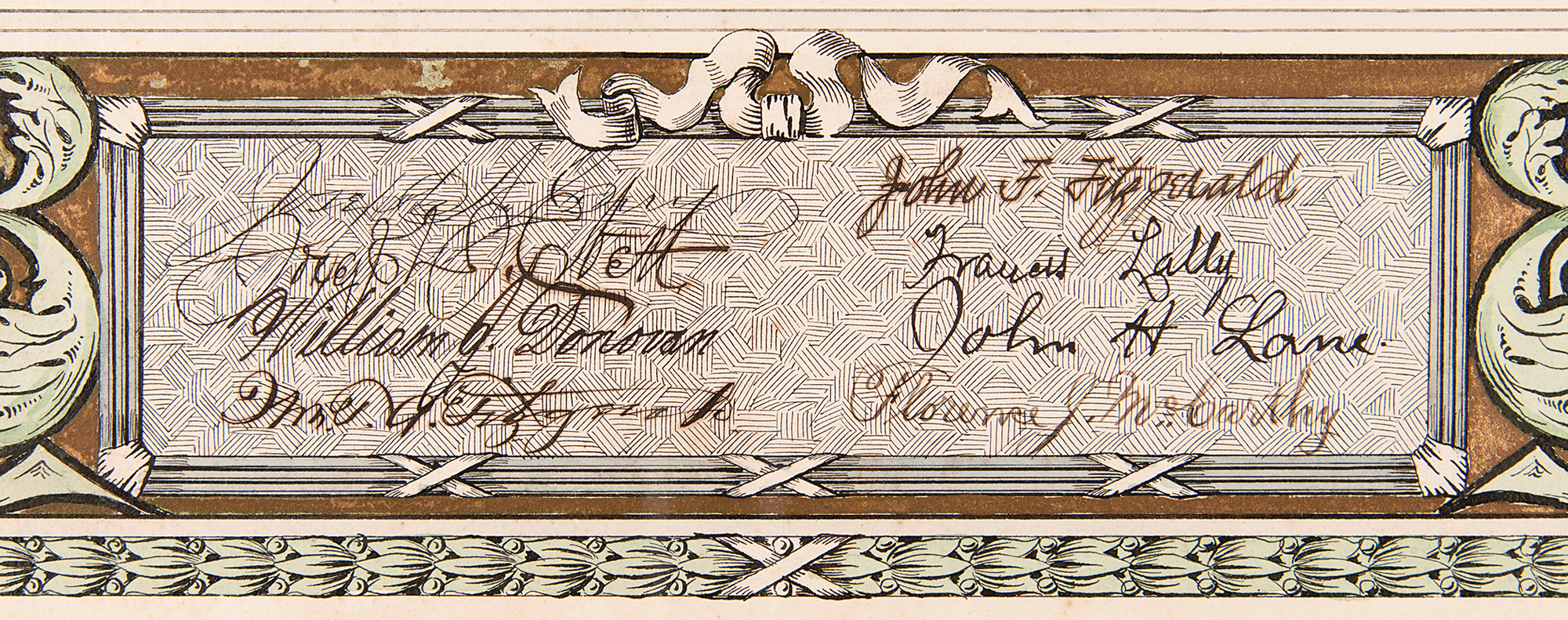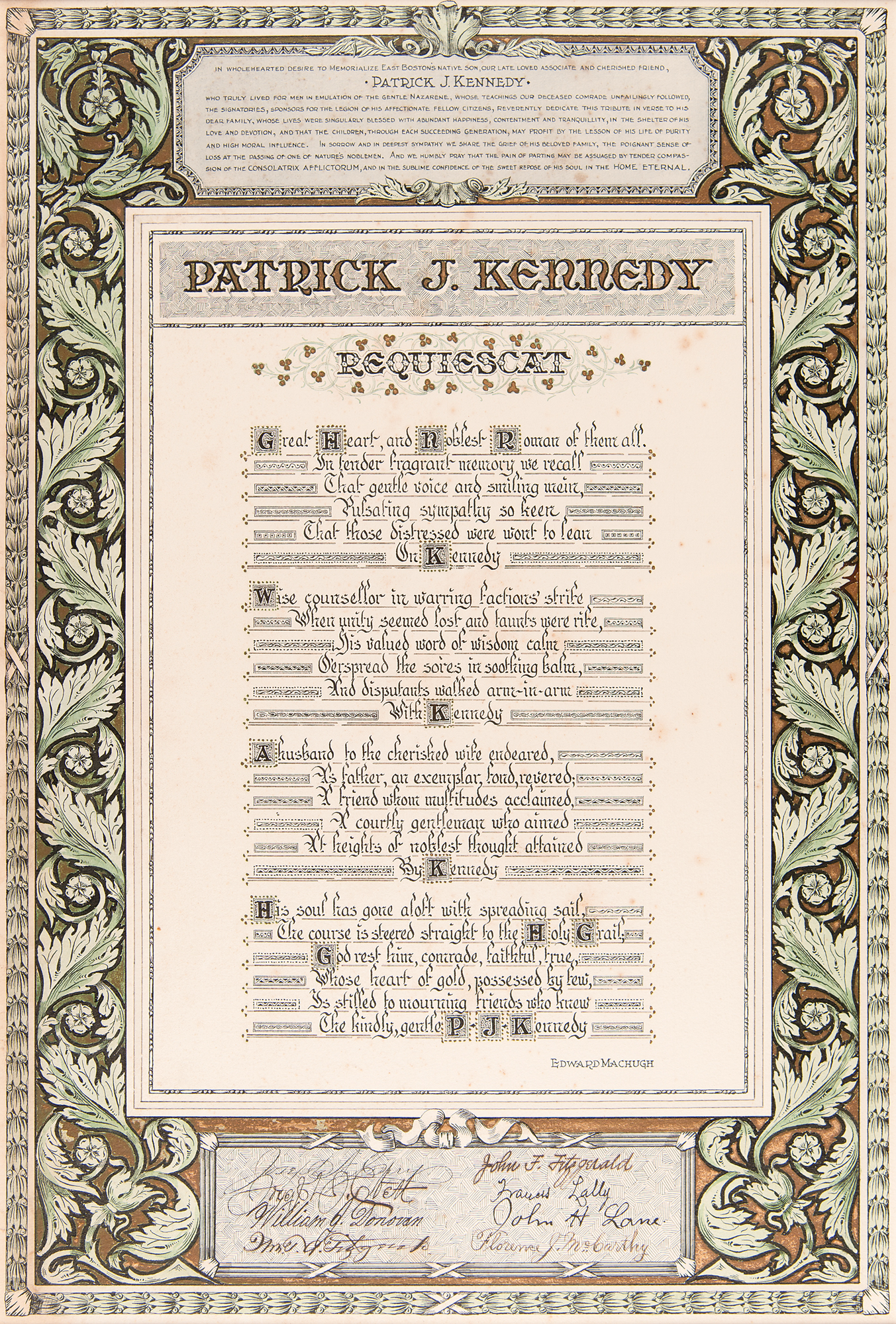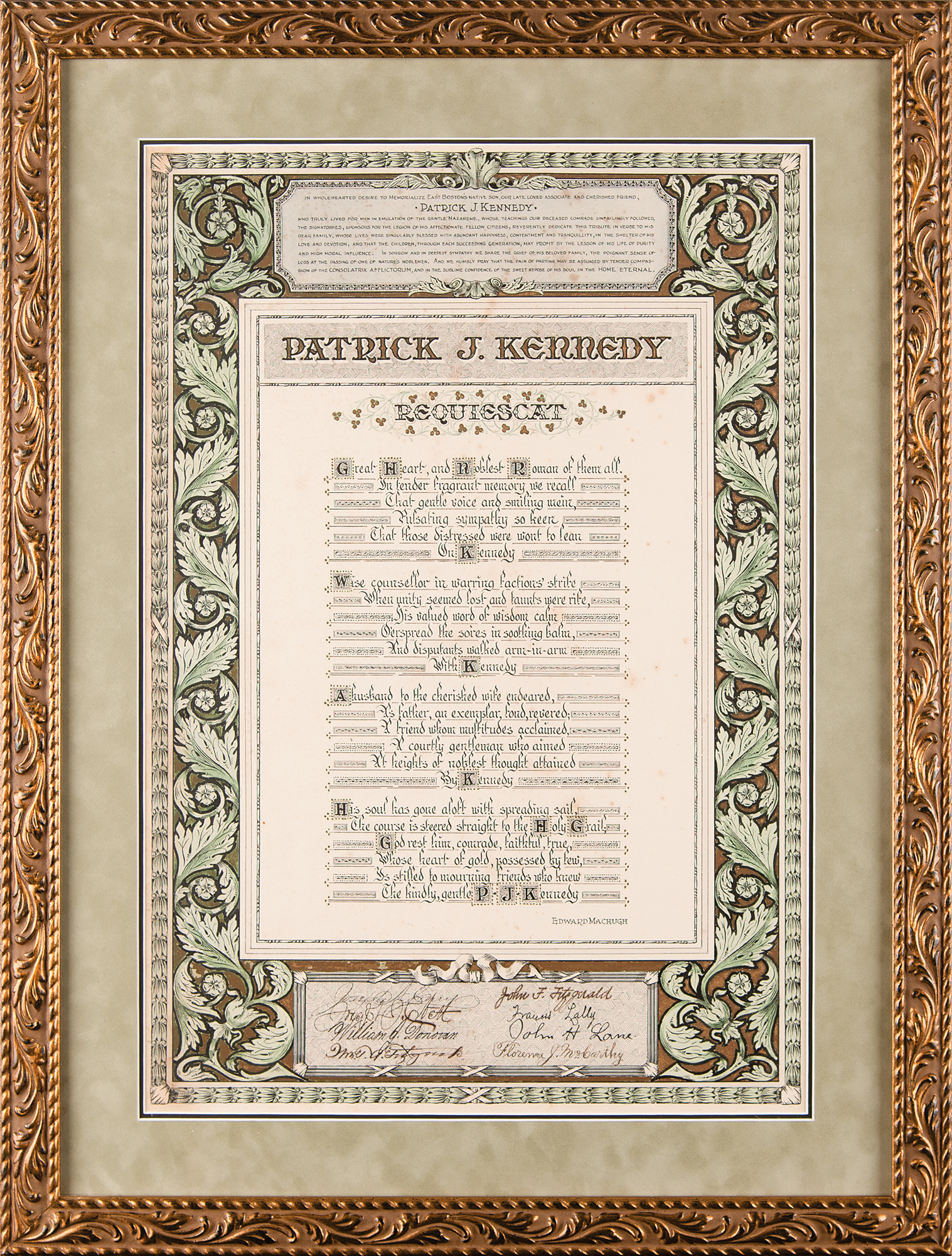 Hand-illuminated mourning poem honoring the memory of Patrick J. Kennedy, the paternal grandfather of President John F. Kennedy, one page, 14 x 20.5, no date but circa 1929. Commissioned by leaders of the Democratic Party in Boston, the poem is headed: "In wholehearted desire to memorialize East Boston's native son, our late, love associate and cherished friend, Patrick J. Kennedy, who truly lived for men in emulation of the Gentle Nazarene, whose teachings our deceased comrade unfailingly followed." The first verse reads: "Great Heart and Noblest Roman of them all, / in tender fragrant memory we recall / that gentle voice and smiling mien / pulsating sympathy so keen / that those distressed were wont to lean / on Kennedy." Signed at the conclusion in ink by eight prominent Boston Democrats, including John F. 'Honey Fitz' Fitzgerald, the maternal grandfather of President John F. Kennedy. Archivally double-matted and framed to an overall size of 20 x 26.5. In fine condition, with a bit of scattered foxing.