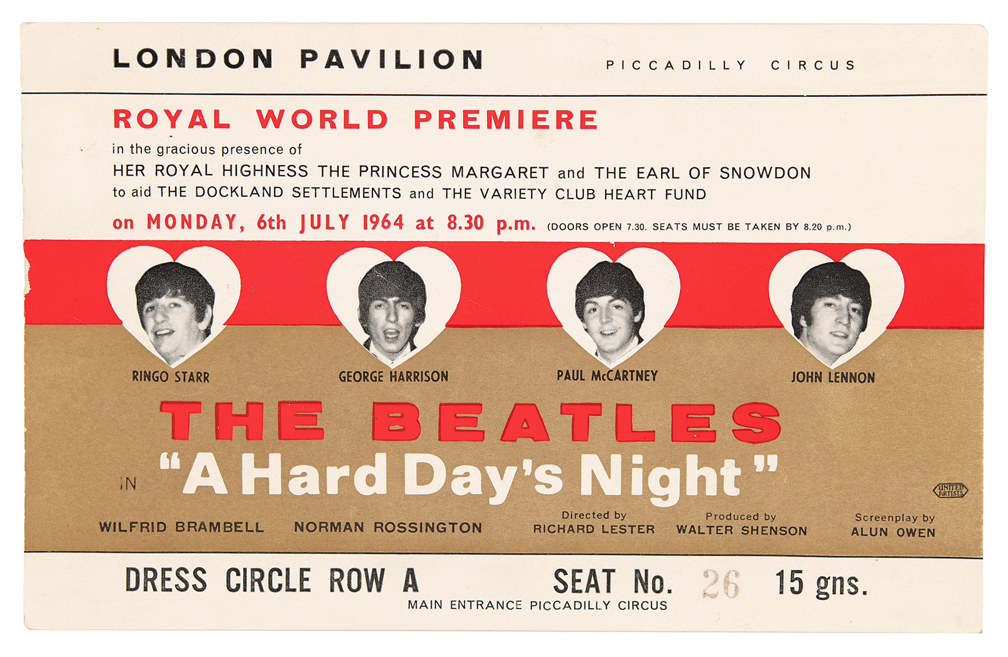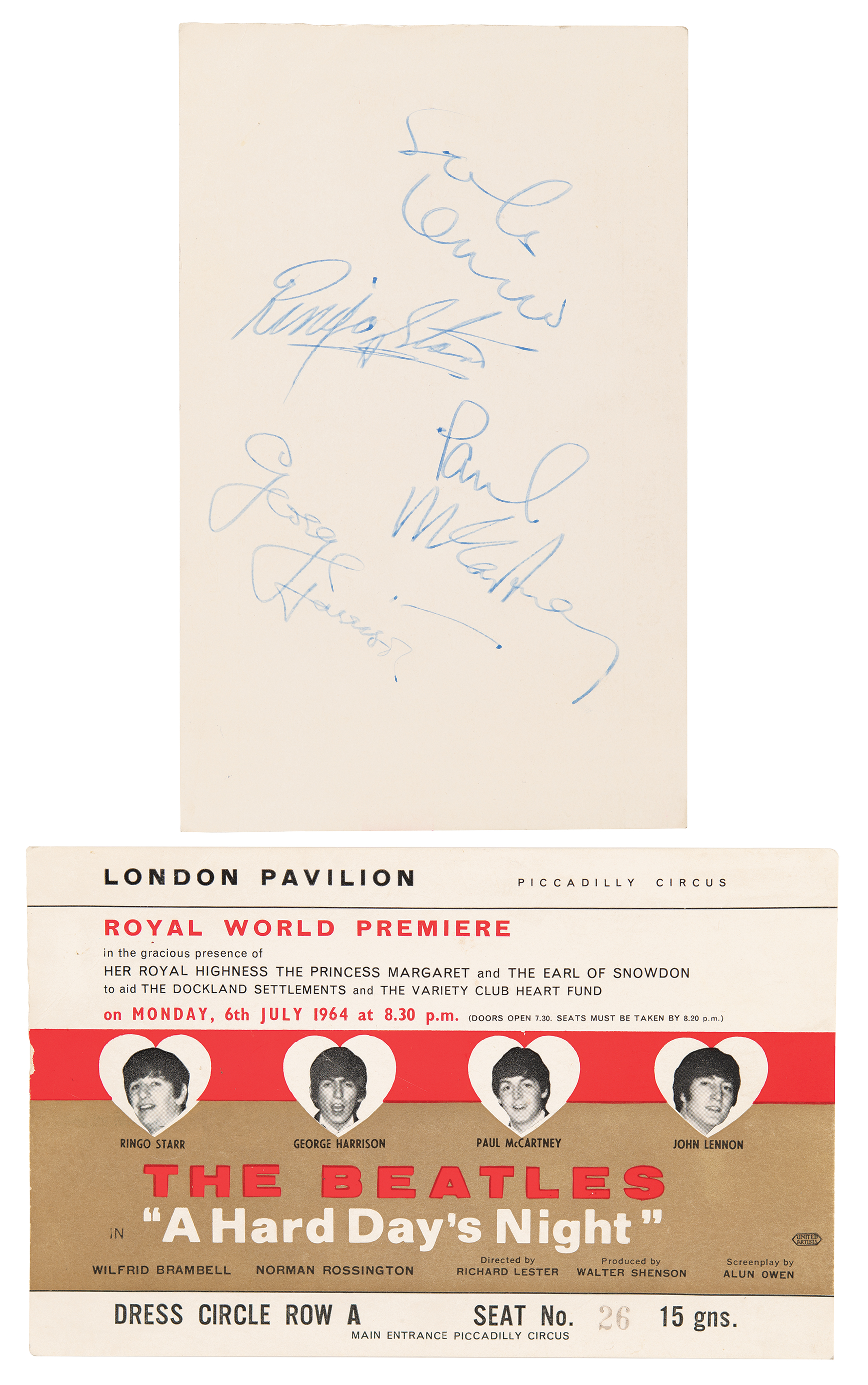 Incredibly rare color 7.25 x 4.5 large-format ticket for the royal world premiere of the Beatles’ first film, the classic 1964 musical comedy A Hard Day's Night, which was held at London's Pavilion Theatre on July 6, 1964, signed beautifully on the reverse in blue ink by John Lennon, George Harrison, Paul McCartney, and Ringo Starr. Issued for Seat No. 26 in Dress Circle Row A, the ticket features heart-shaped portraits of each Beatle and notes the attendance of Princess Margaret and the Earl of Snowdon. In fine condition, with light handling wear.