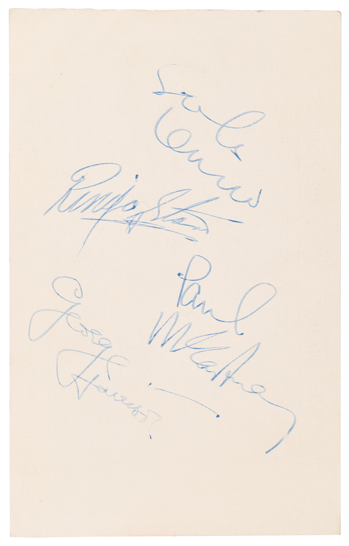 Accompanied by a certificate of authenticity from Tracks and by a letter of provenance from the daughter of the original recipient: "The Royal World Premiere of 'A Hard Day's Night' was held at the Royal Pavilion Theatre Piccadilly, London on Monday 6th July 1964. Princess Margaret and Lord Snowden attended. Afterwards, a champagne supper dinner was held at The Dorchester Hotel, Park Lane, London. My father, Mr. Brian Howitt, was a senior chef on duty that night at The Dorchester Hotel and he asked one of the waiting staff to obtain The Beatles autographs on his behalf. All four signed the reverse side of the ticket.” To date, this is the only known fully signed ‘A Hard Day’s Night’ premiere ticket to have surfaced at auction.