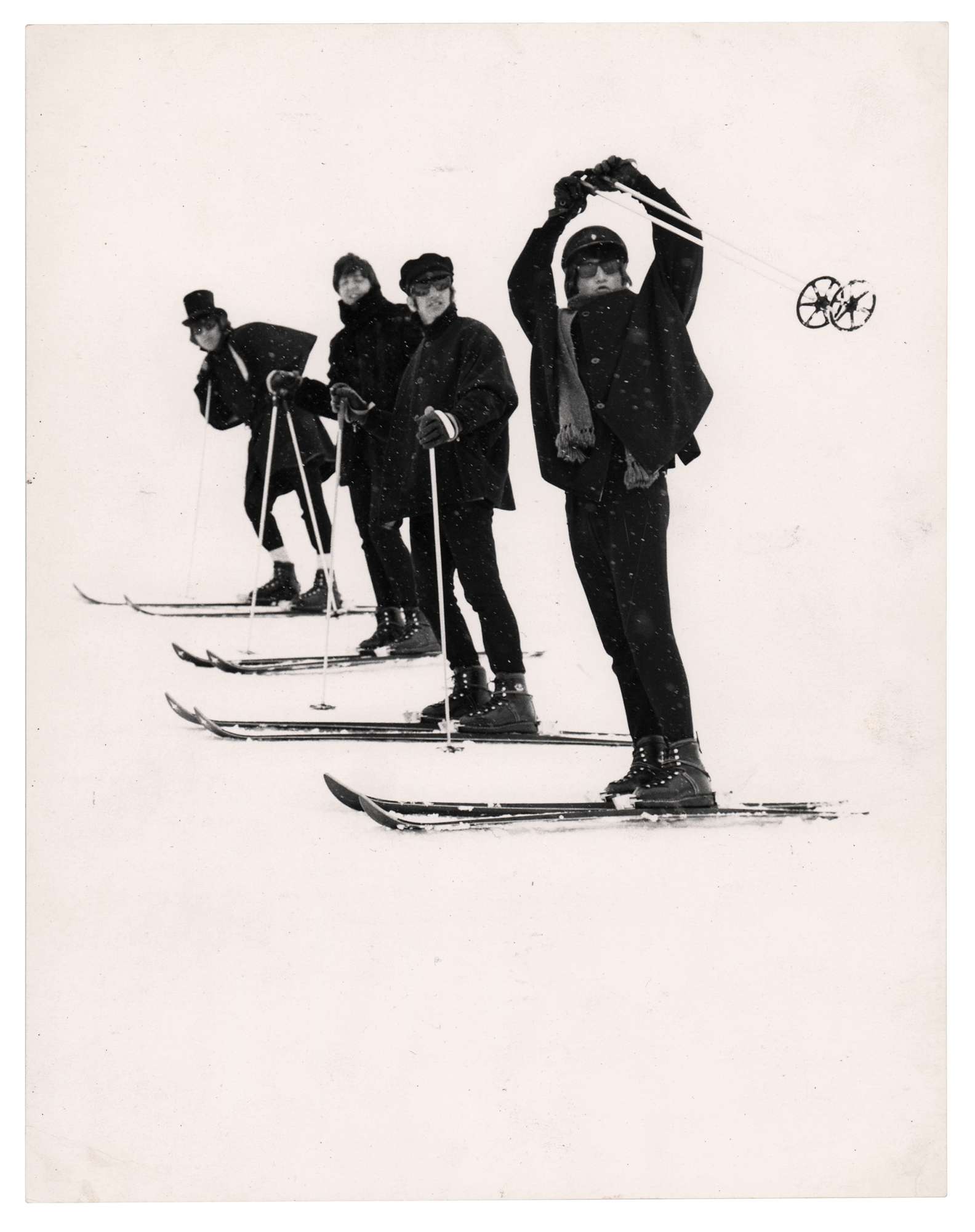 Original vintage semi-glossy 7.5 x 9.5 silver gelatin photo of the Beatles skiing while shooting scenes for their second feature film Help! in Obertauern, Austria, between March 14–20, 1965. The photo was taken by Beatles book photographer Leslie Bryce and bears his credit stamp on the reverse. In fine condition. Accompanied by a certificate of authenticity from Tracks.