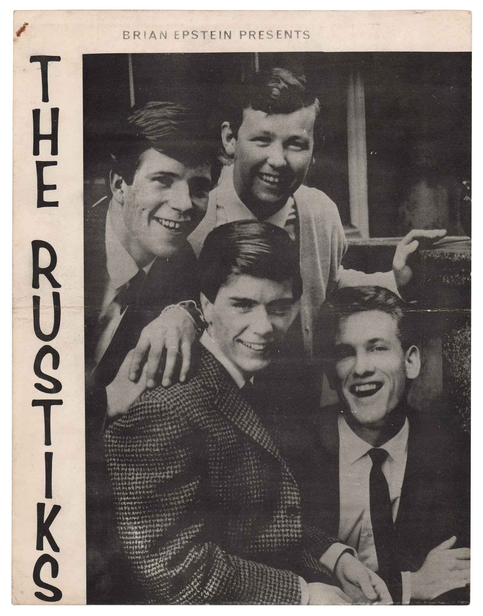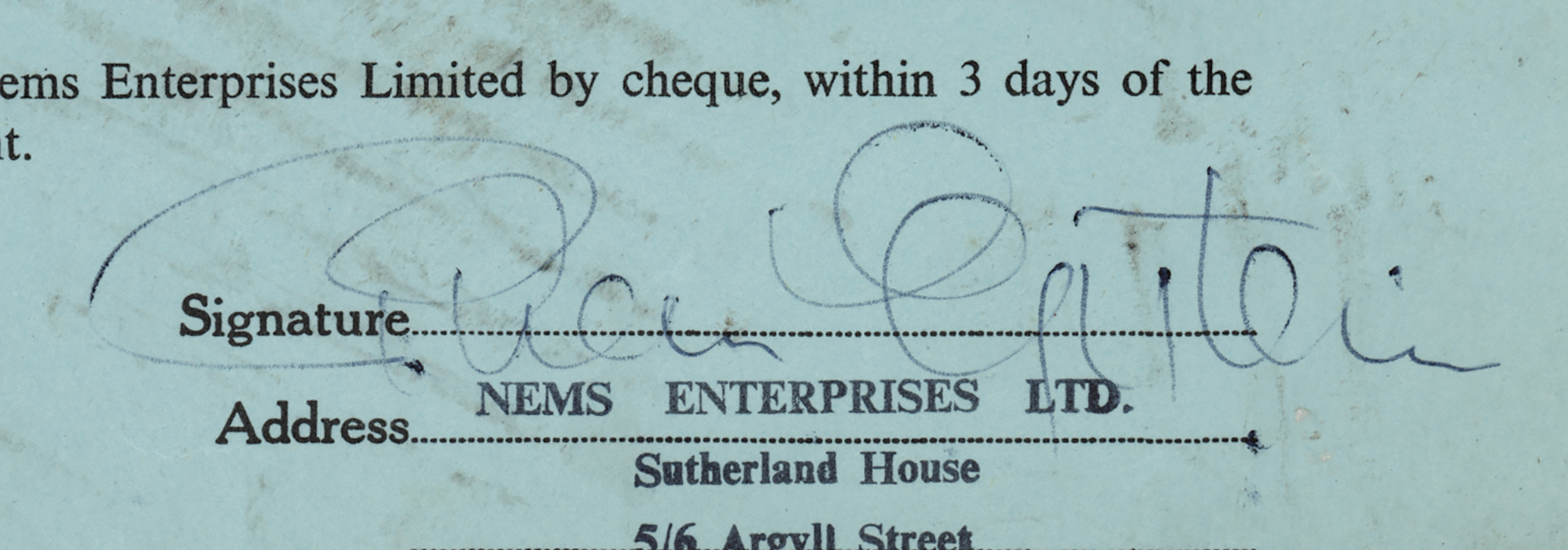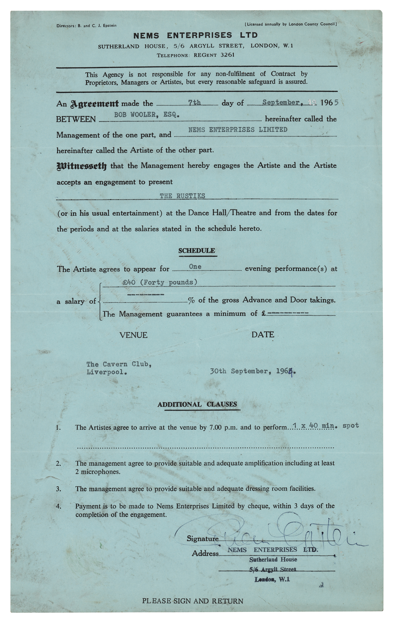 DS, one page, 8 x 13, September 7, 1965. NEMS Enterprises Ltd. contract between Bob Wooler, compere of the Cavern Club, and NEMS regarding a performance by The Rustiks at the Cavern Club in Liverpool, England, on September 30, 1964. Signed at the conclusion in black ballpoint by NEMS owner and Beatles manager Brian Epstein. In very good to fine condition, with light scuffing and soiling. Accompanied by a certificate of authenticity from Tracks, an oversized “Brian Epstein Presents The Rustiks” promotional card, and a label demo of The Rustiks single ‘What a Memory Can Do.’