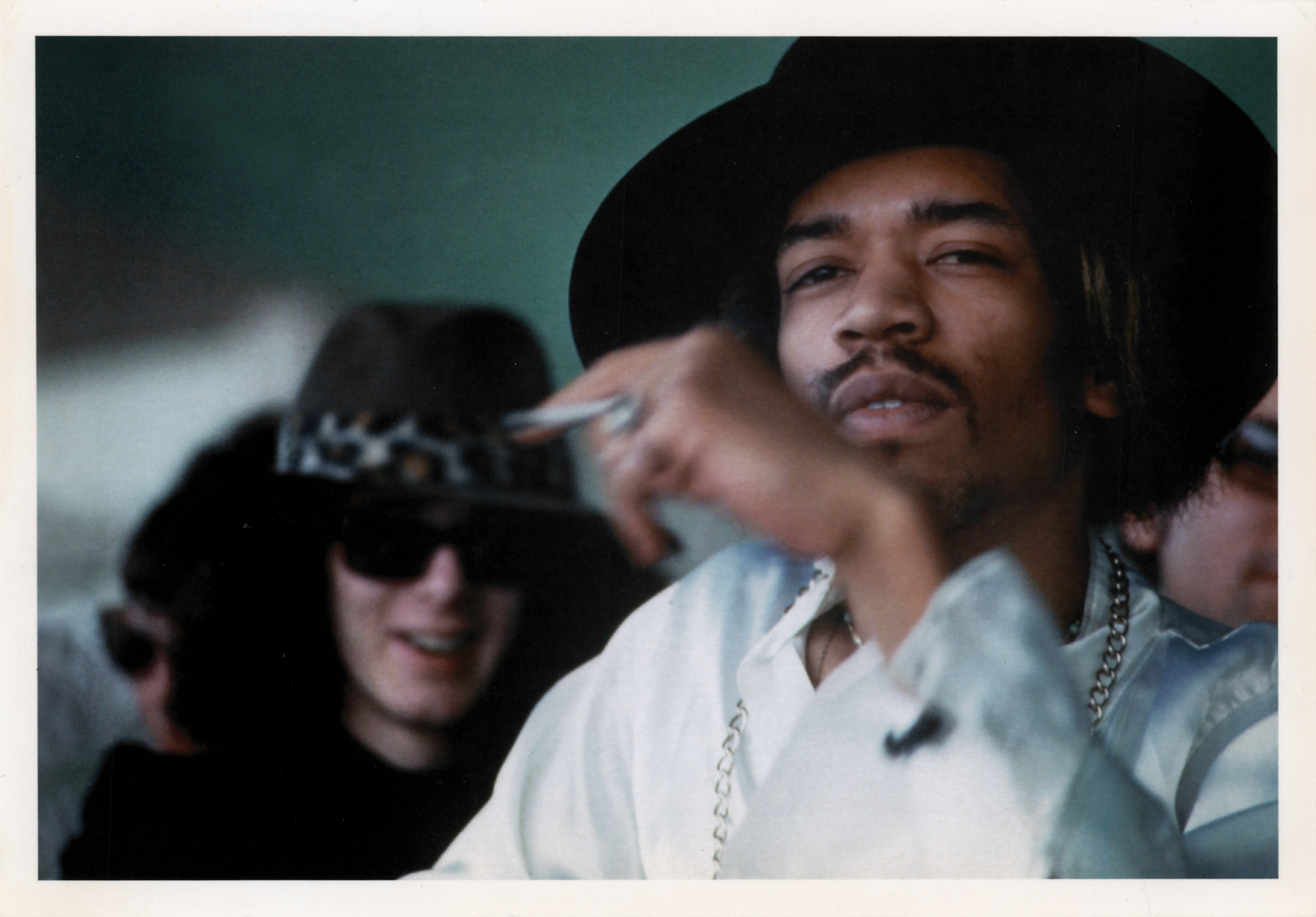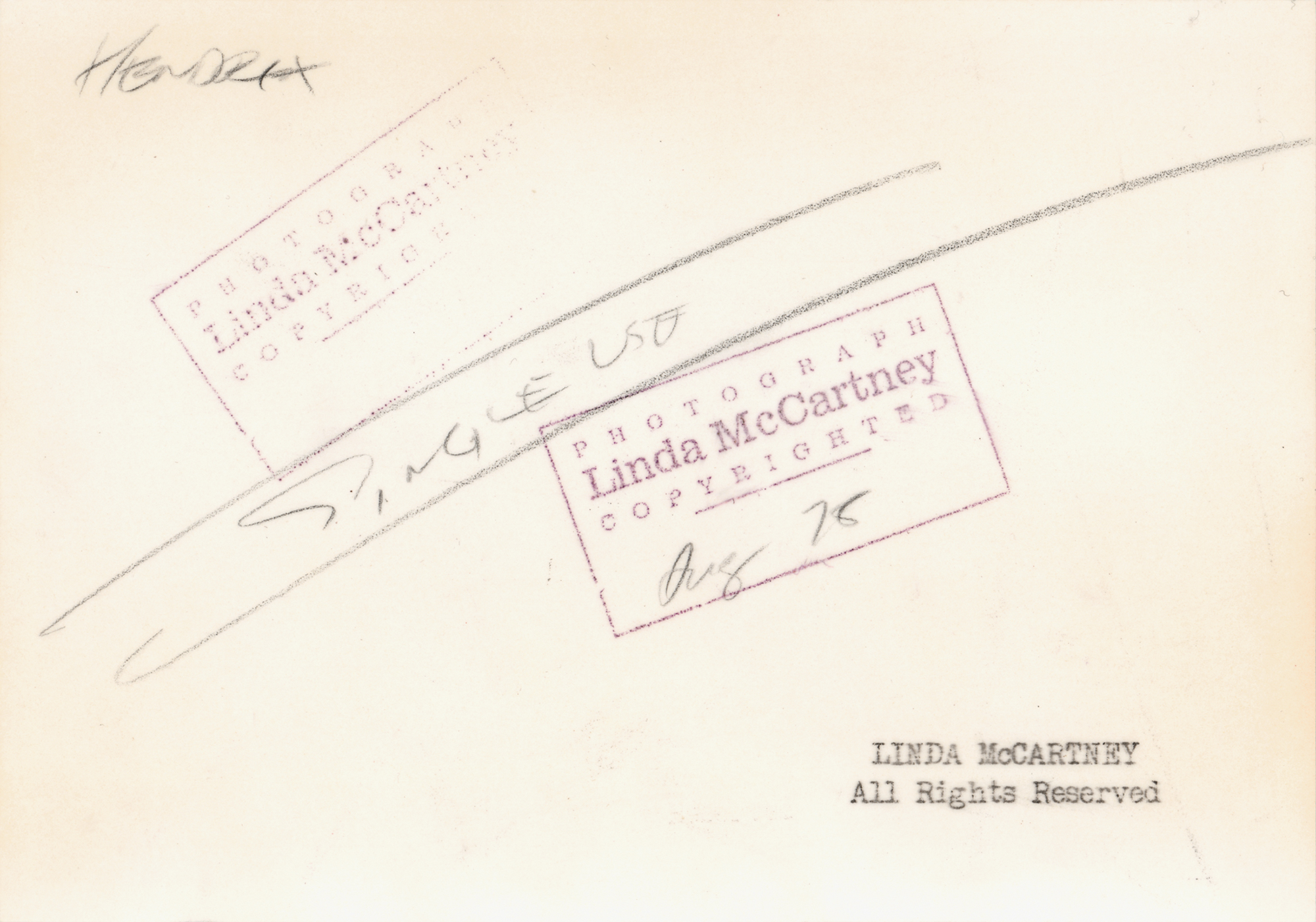 Modern color 7.5 x 5.25 photo of Jimi Hendrix backstage at the Miami Pop Festival, an image originally taken by Linda McCartney on either May 18 or 19, 1968. The reverse bears two copyrighted ‘Linda McCartney’ photography stamps. In very fine condition. Accompanied by a certificate of authenticity from Tracks.