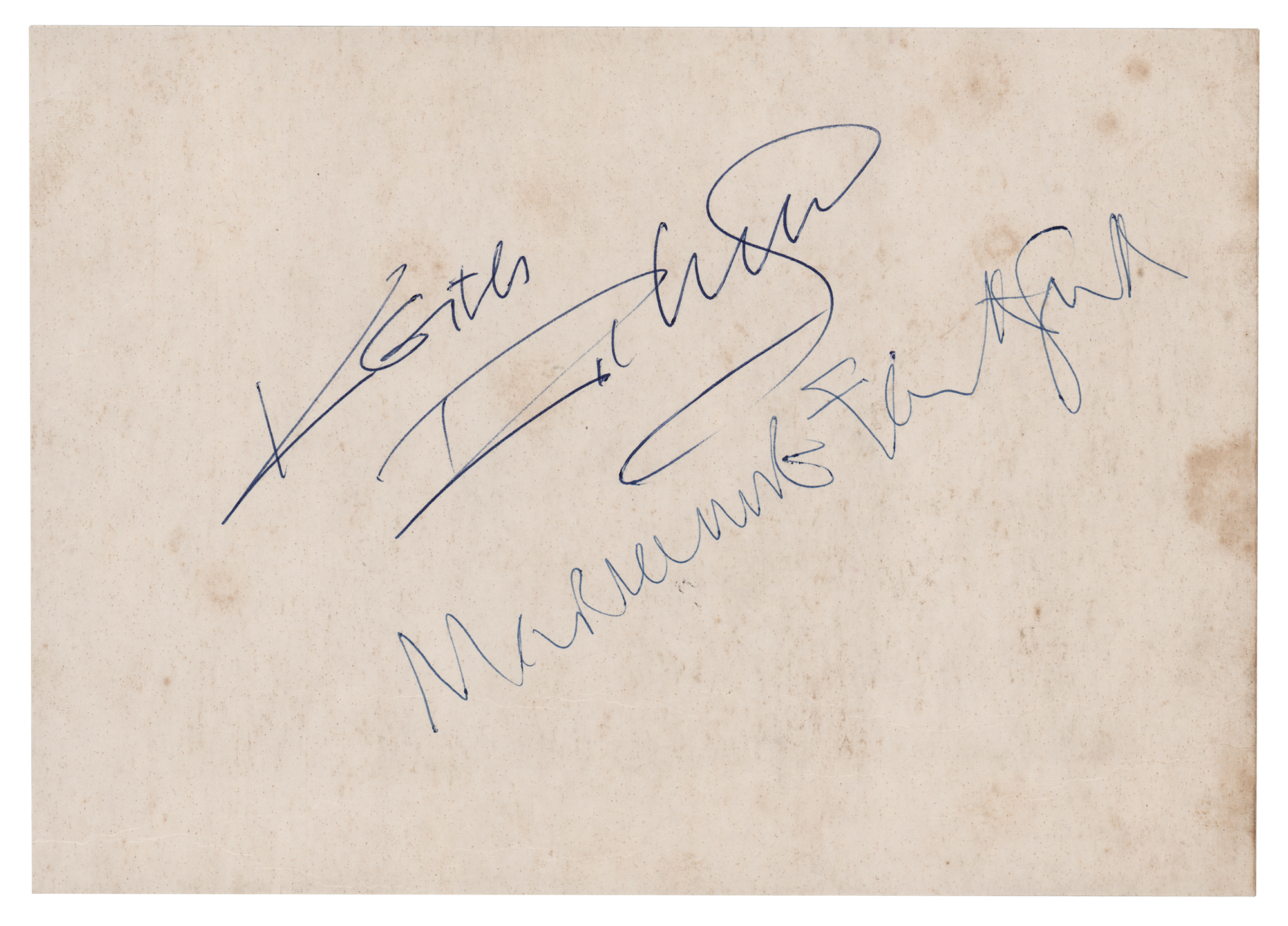 Vintage ballpoint signatures of Keith Richards and Marianne Faithfull on an off-white 8.75 x 6.25 cardstock sheet. The consignor notes that the signatures date to the late 1960s. In fine condition, with some scattered light stains. Accompanied by a certificate of authenticity from Tracks.