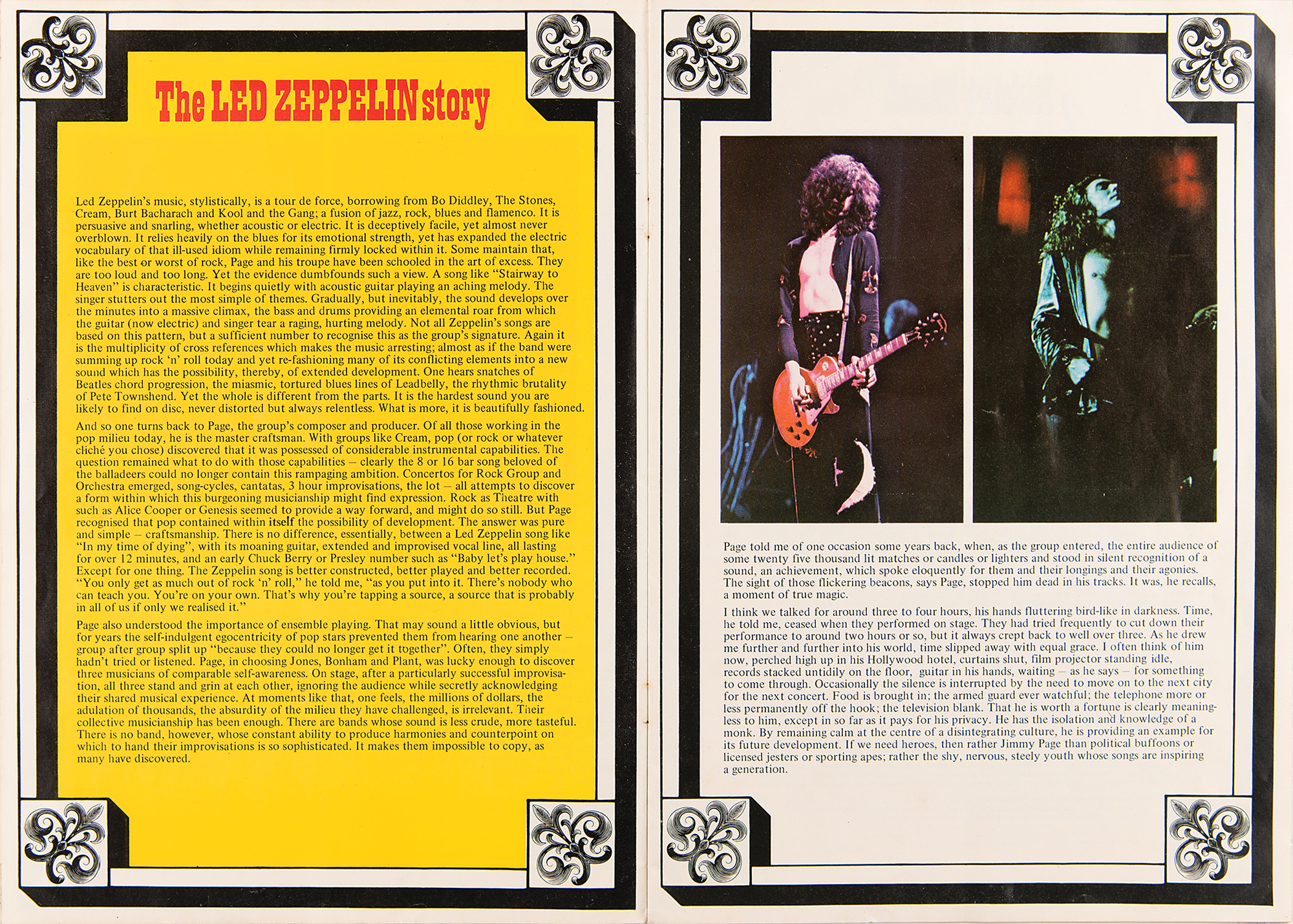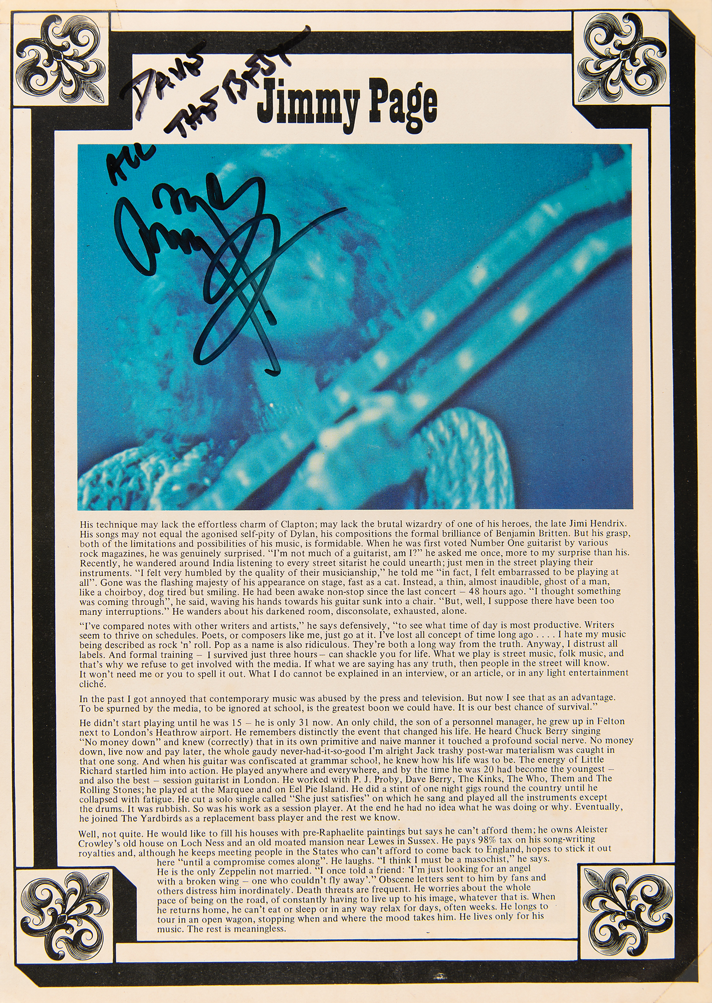 Original program for Led Zeppelin’s concert series at Earl’s Court in London, England, between May 17 and 25, 1975, 12 pages, 8.25 x 11.75, signed and inscribed inside on their respective page in black felt tip, “To Dave, Robert Plant” and “Dave, All the best, Jimmy Page.” In fine condition, with light handling wear. Accompanied by a certificate of authenticity from Tracks and by a letter of provenance from the original owner: “My good friend Benji Lefevre (Zeppelin’s former sound engineer & tour manager) got [the program] signed for me on 25th July 1995, during rehearsals for the Page & Plant Unledded Tour at Wembley Arena.” In celebration of the release of their sixth album, Physical Graffiti, Led Zeppelin arranged a five night residency at Earls Court from May 17–25, 1975, with the first two shows added due to unprecedented public demand. These were the only Led Zeppelin concerts in the country during this year, and so the events sold out their entire run of 85,000 tickets.