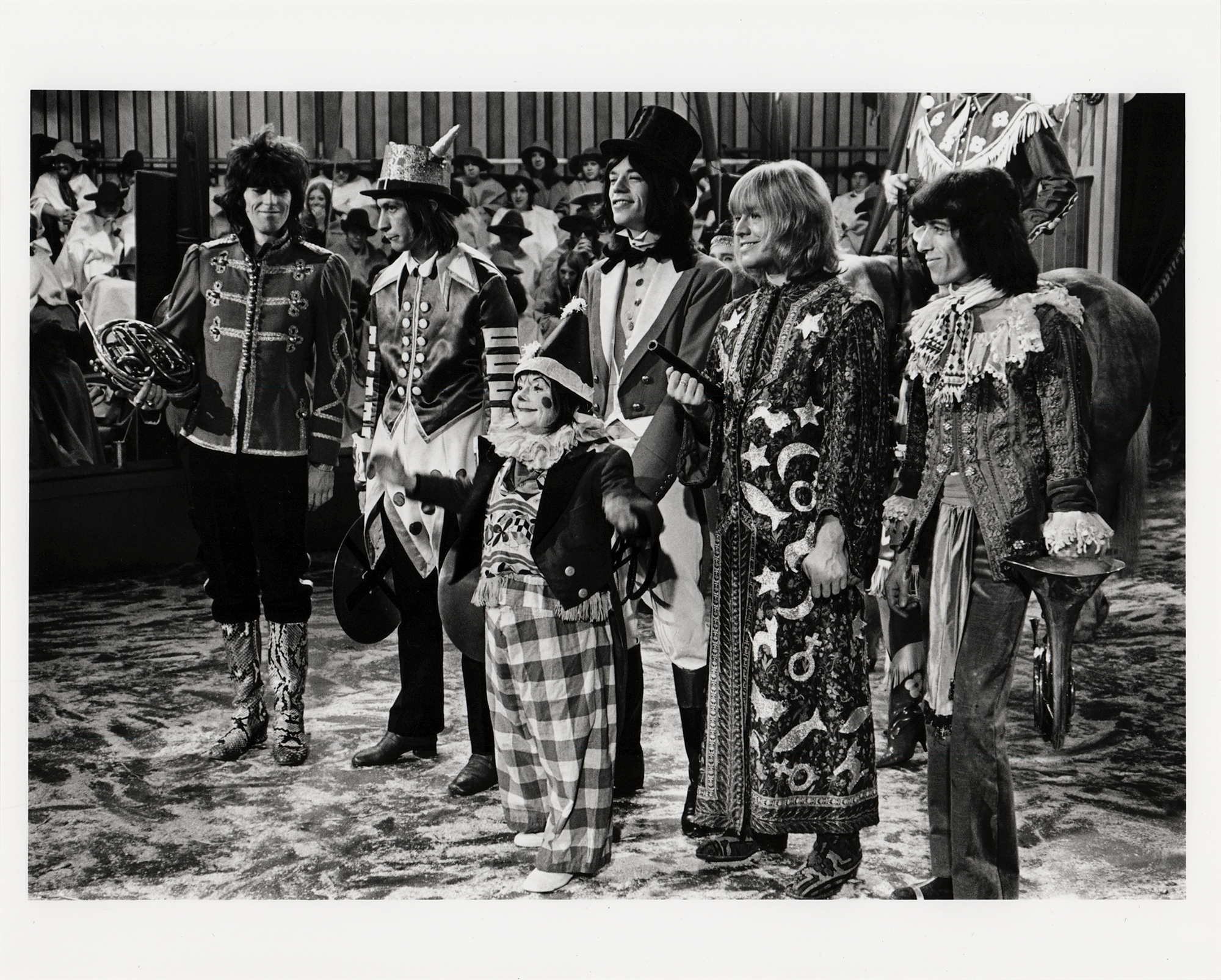 Modern glossy 10 x 8 photo of the Rolling Stones by Mike Randolph, depicting the band in full attire at the band's ‘Rock and Roll Circus,’ which took place at Intertel Television Studios in Stonebridge Park, London, on December 11, 1968. The reverse bears a ‘Mike Randolph Copyright’ stamp. In very fine condition. Accompanied by a certificate of authenticity from Tracks. The Rolling Stones Rock and Roll Circus show featured performances by the Rolling Stones, John Lennon, Yoko Ono, The Who, Eric Clapton, Jethro Tull, Taj Mahal, and Marianne Faithfull. During the show, Lennon performed with his temporary supergroup ‘The Dirty Mac,’ which was comprised of Lennon, Ono, Clapton, Keith Richards, and Mitch Mitchell. All of the performances were filmed and recorded under the direction of Michael Lynsey-Hogg and recorded on a mobile four-track machine with Glynn Johns and Jimmy Miller engineering.