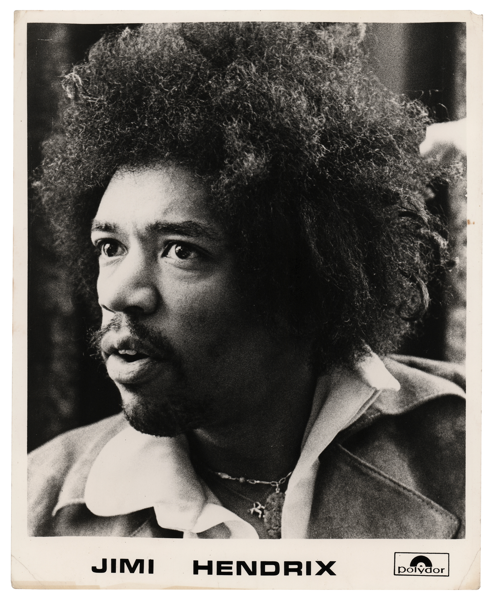 Vintage late 1960s glossy 8 x 10 Polydor Records promotional photo of Jimi Hendrix in a wonderful up-close pose. An unknown hand has annotated “Melody Maker” on the reverse. In fine condition, with small creases to the corner tips. Accompanied by a certificate of authenticity from Tracks.