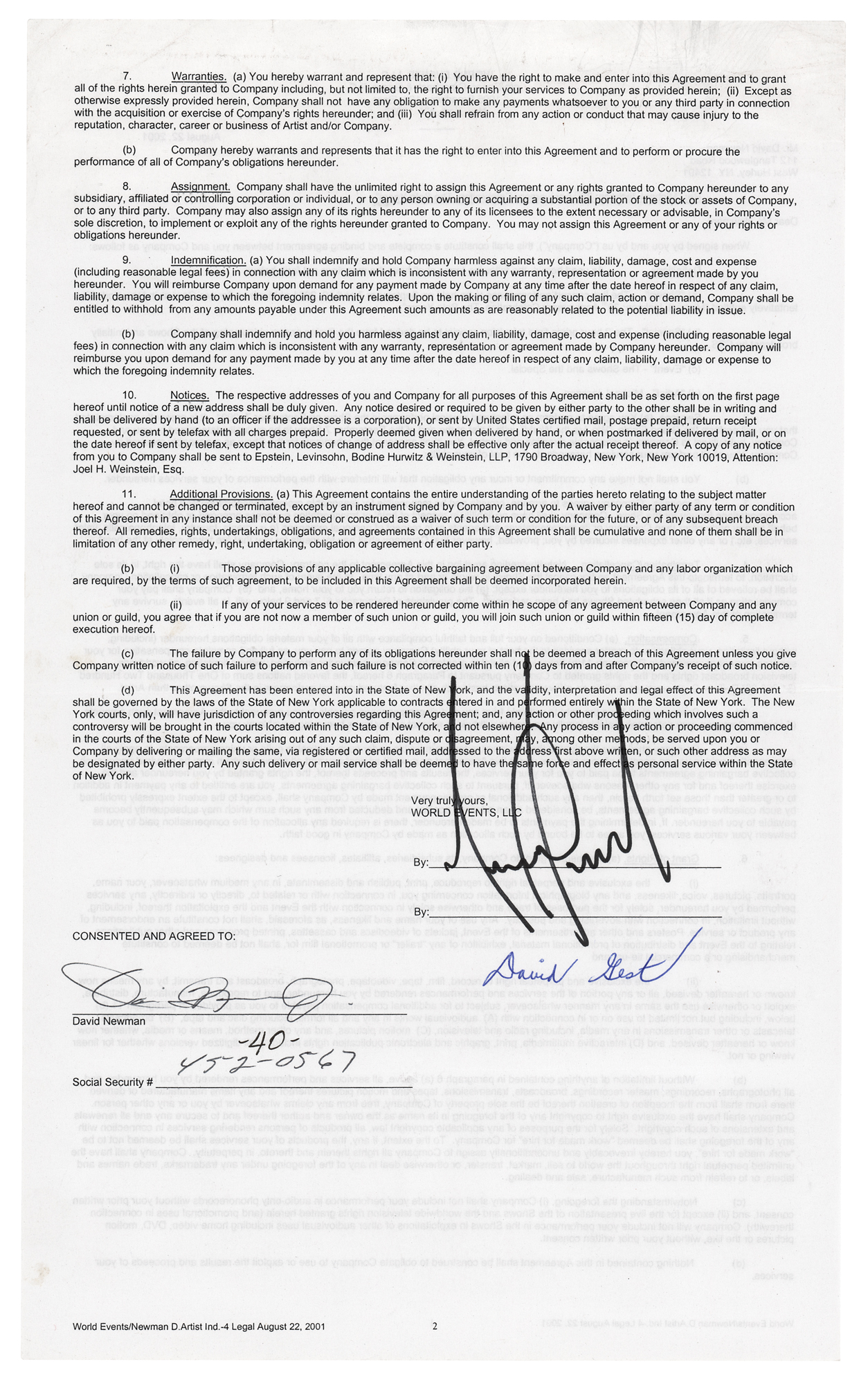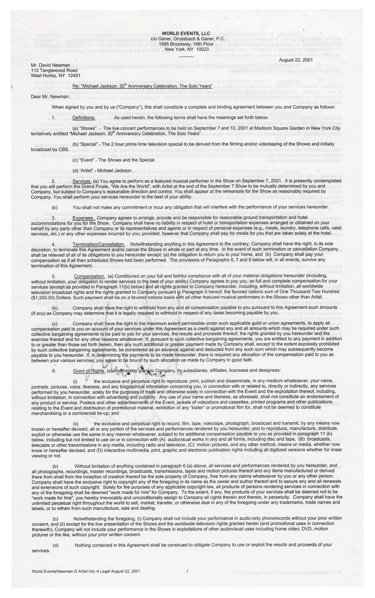 DS, one page, both sides, 8.5 x 14, August 22, 2001. An agreement between World Events, LLC and saxophonist David ‘Fathead’ Newman for the latter to perform for a “2 hour prime time television special…tentatively entitled ‘Michael Jackson: 30th Anniversary Celebration, The Solo Years,” which is to be held on September 7 and 10, 2001, at Madison Square Garden in New York City. Signed at the conclusion in black felt tip by Michael Jackson, in blue ballpoint by producer David Gest, and in black ballpoint by Newman. In fine condition. Accompanied by a certificate of authenticity from Tracks.