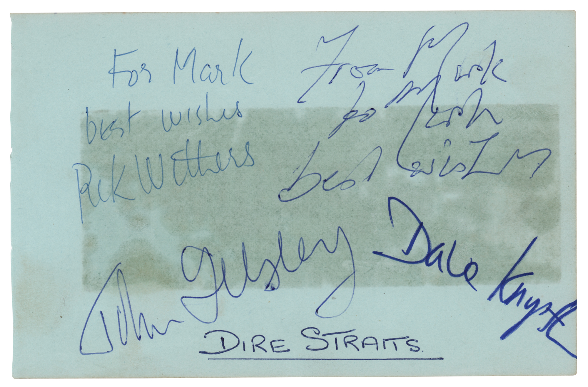 Ballpoint and felt tip signatures of Dire Straits — David Knopfler, John Illsley, Pick Withers, and Mark Knopfler, with the latter two adding inscriptions to “Mark” — on a light blue 6 x 4 album page. The consignor notes that the signatures were obtained in England in either 1979 or 1980. In very good to fine condition, with a block of staining affecting only appearance. Accompanied by a certificate of authenticity from Tracks.
