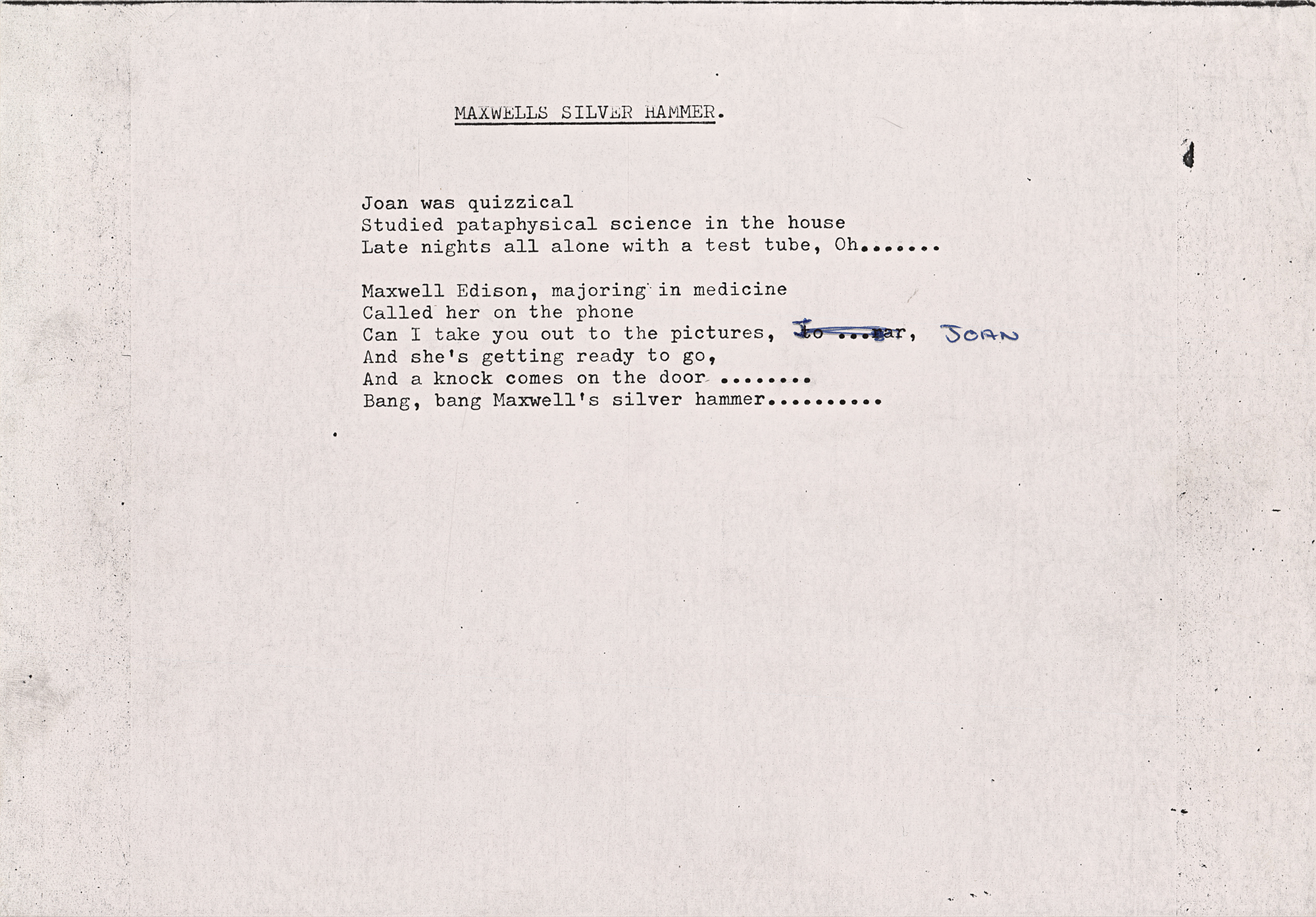 Vintage studio-used photocopy of typed lyrics to the verse first of the 1968 Beatles song ‘Maxwell’s Silver Hammer,’ one page, 10 x 7, featuring ballpoint annotations in the hand of Mal Evans, the band’s longtime road manager and personal assistant. This lyric sheet would have been used at EMI Studios when the group recorded the song in July 1969. In fine condition. Accompanied by a certificate of authenticity from Tracks.