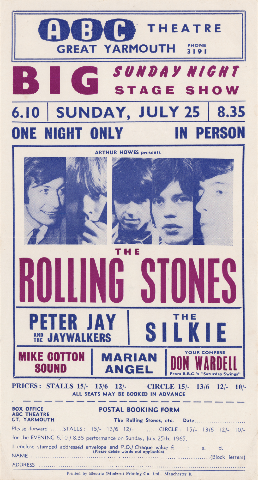 Original vintage 5.5 x 10.25 handbill for a Rolling Stones concert held at the ABC Theatre in Great Yarmouth, England, on July 25, 1965, featuring a central image of the five band members and listing supporting acts Peter Jay and the Jaywalkers, The Silkie, Mike Cotton Sound, and Marian Angel. The postal booking form remains intact below. In fine condition, with a central horizontal fold. Accompanied by a certificate of authenticity from Tracks.
