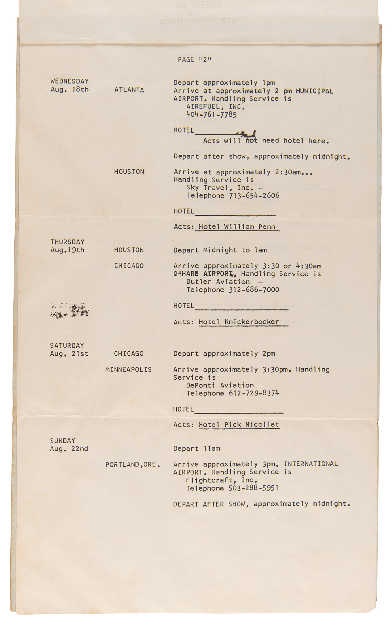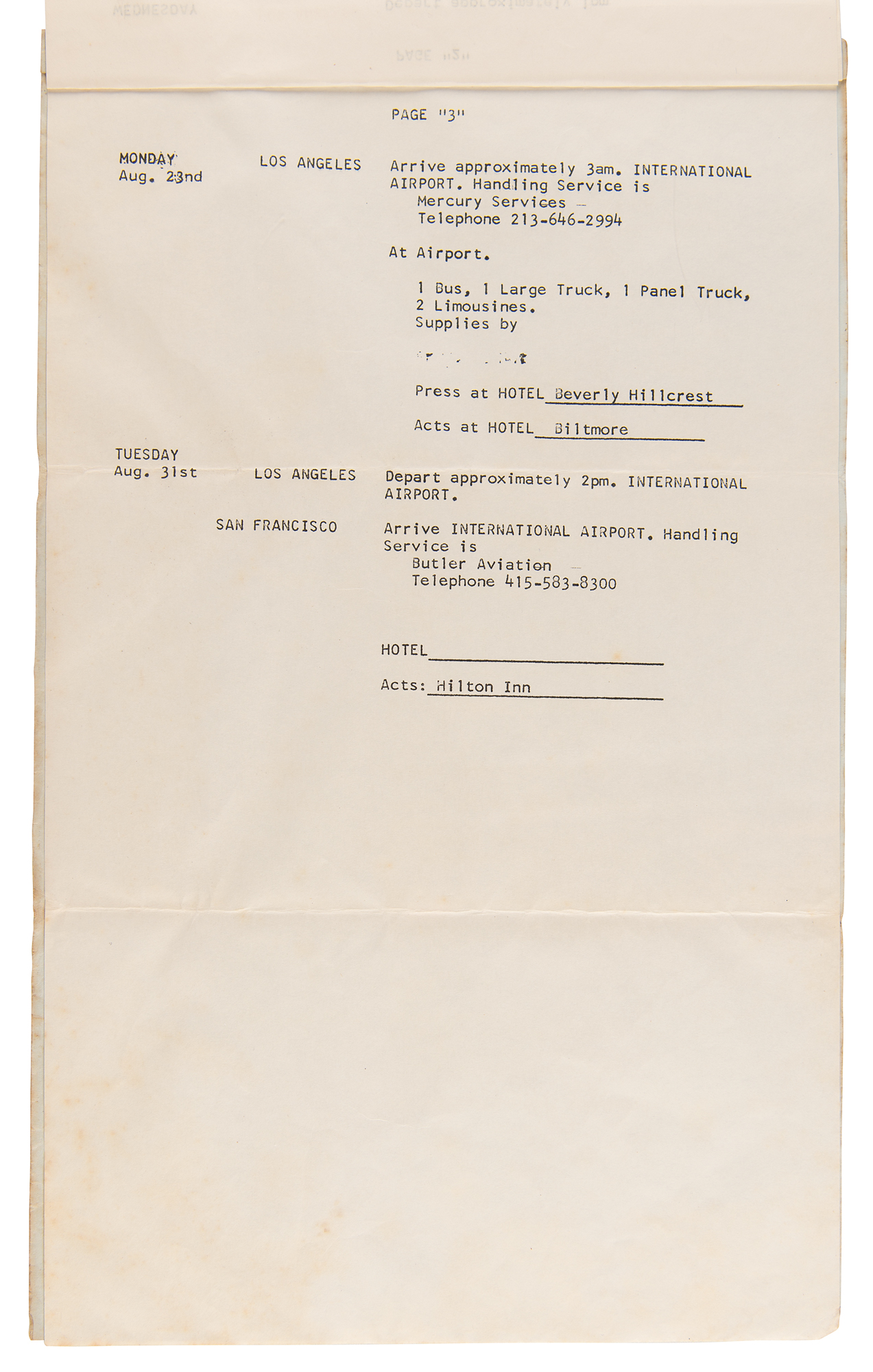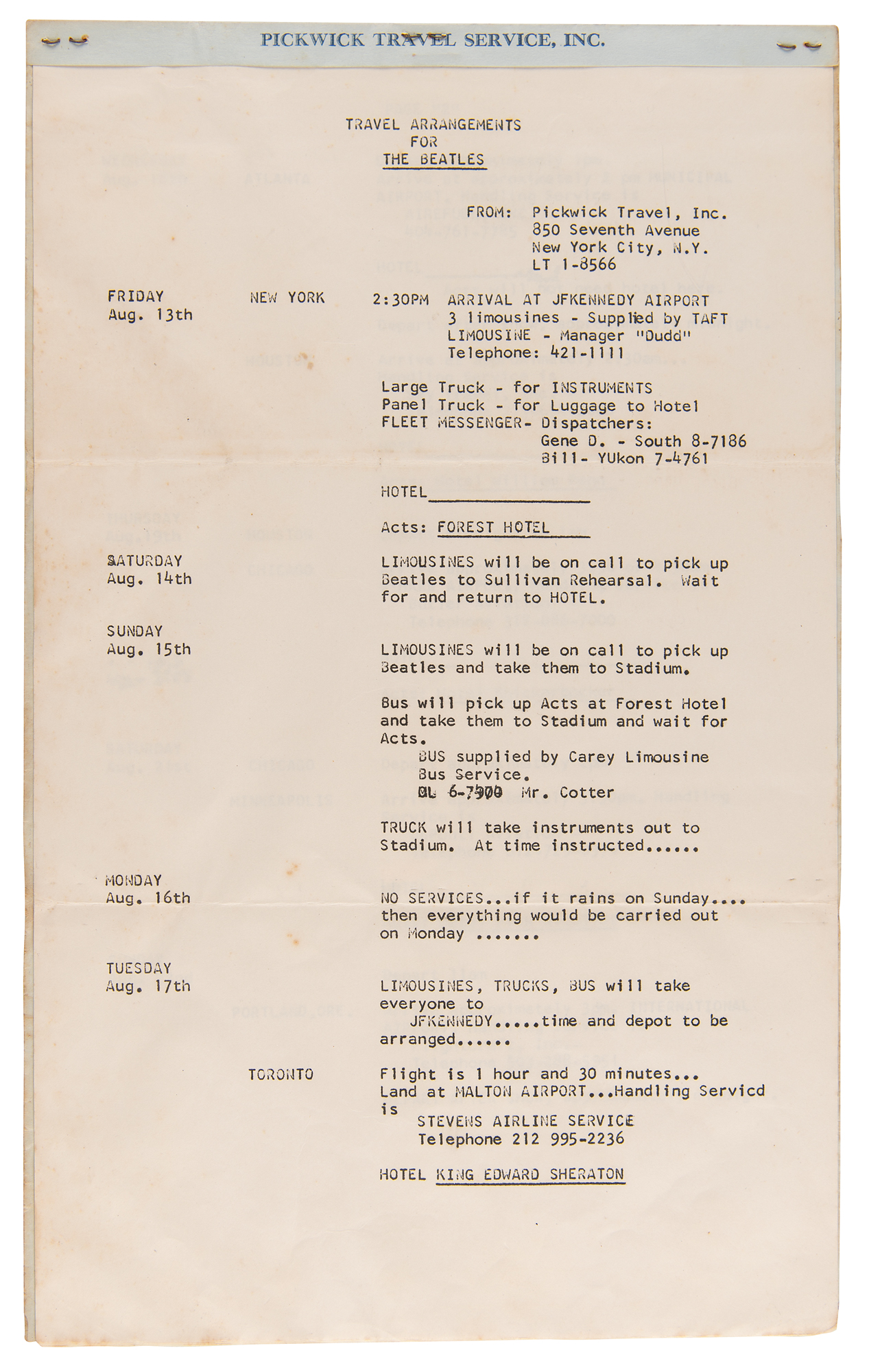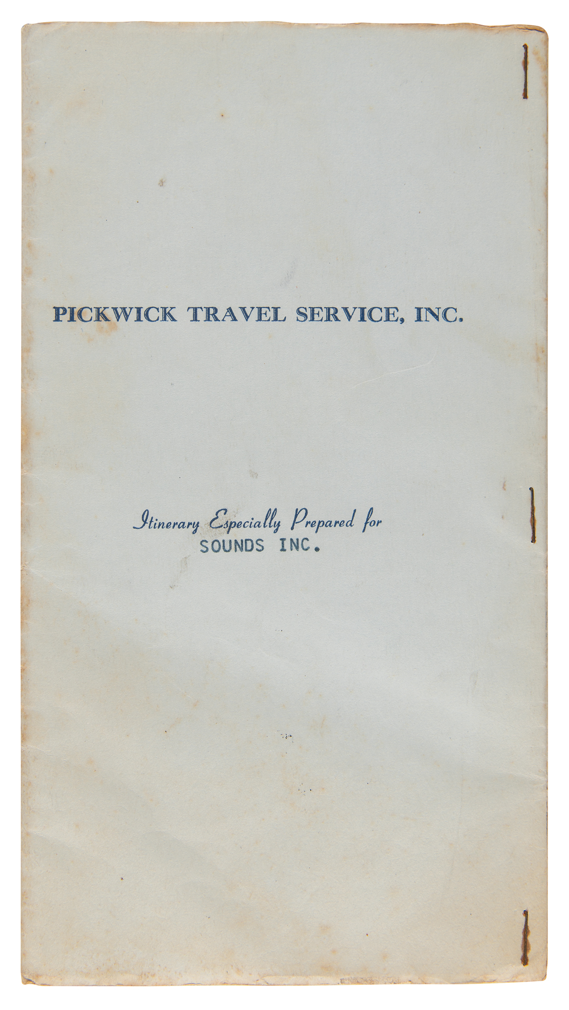 Original stapled Pickwick Travel Services, Inc. itinerary booklet for the Beatles’ 1965 North American Tour, three pages, measures 8.75 x 14 unfolded, with the front cover indicating that the booklet was prepared for an issued to a member of “Sounds Inc.,” a British instrumental pop/rock group that served as the Beatles’ opening act between the years 1964 and 1966. Of note is the itinerary’s opening three dates, which all correlate to the band’s historic concert at New York’s Shea Stadium on August 15, 1965. In very good to fine condition, with toning along folds and evident signs of use. The consignor notes that the itinerary originates from the collection of Alan Holmes, saxophonist of Sounds Incorporated. Accompanied by a certificate of authenticity from Tracks.