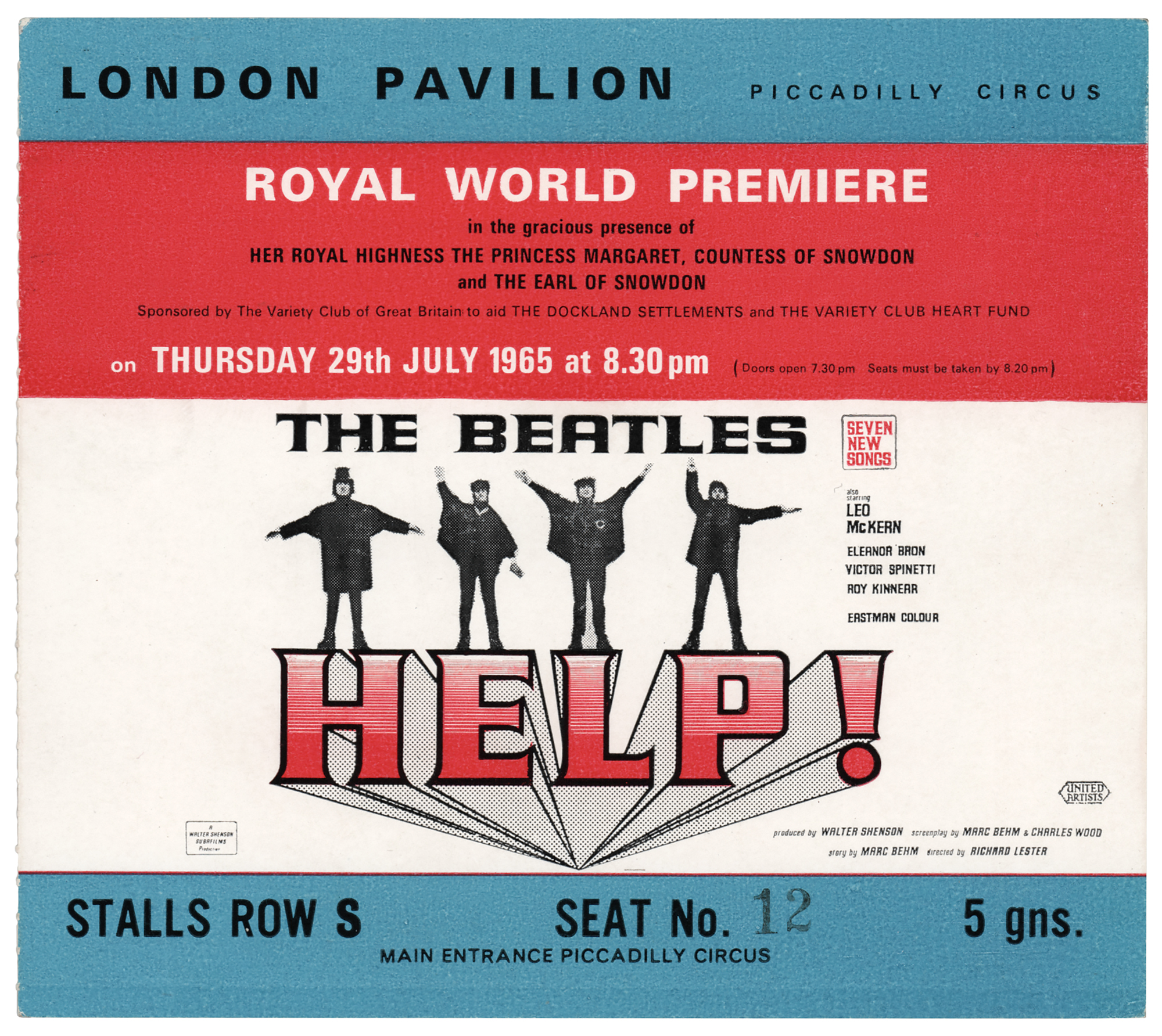 Colorful large format movie ticket for the royal world premiere of the Beatles' 1965 film Help!, which was held at the London Pavilion in Piccadilly Circus on July 29, 1965, at 8:30 p.m., measuring 5.5 x 4.75, issued for “Stalls Row S, Seat No. 12,” for a price of “5 gns,” and noting the special attendance of Princess Margaret, Countess of Snowdon, and the Earl of Snowdon. In fine condition. Accompanied by a certificate of authenticity from Tracks.