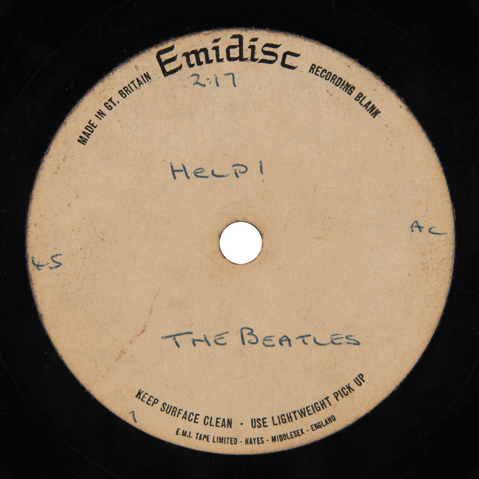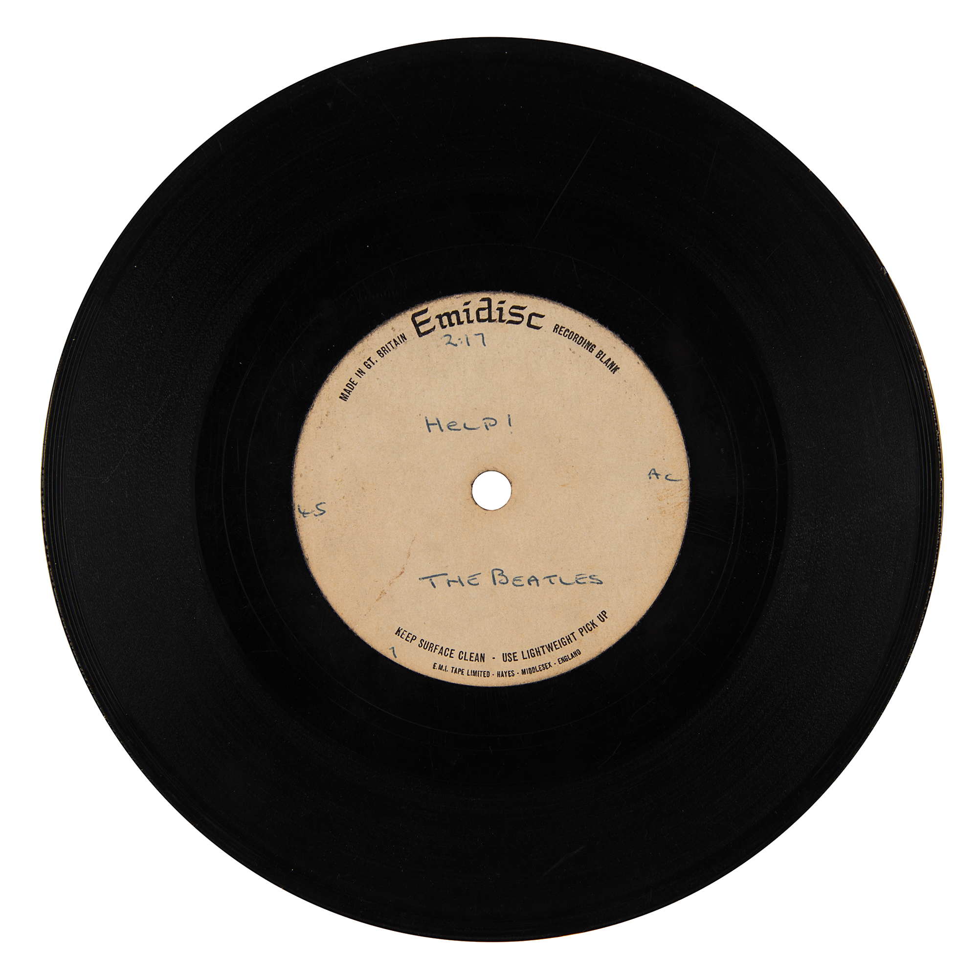 Rare 7˝ EMI acetate pressing of the Beatles song ‘Help!,’ which was recorded at London’s EMI Studios on April 13, 1965. The acetate disc bears an Emidisc label annotated with track and band name, “Help! The Beatles,” the run time, “2:17,” and “45, AC,” the latter the initials of EMI engineer Anthony Clark. In very good to fine condition, with scattered scuffs and scratches. Accompanied by a certificate of authenticity from Tracks. An exceedingly rare original acetate for an all-time Beatles song—the title song for the 1965 film and the band's accompanying soundtrack album, ‘Help!’ was released as a single in July 1965 and was number one for three weeks in the United States and the United Kingdom. In 2008, the 1965 Capitol Records recording of ‘Help!’ was inducted into the Grammy Hall of Fame.