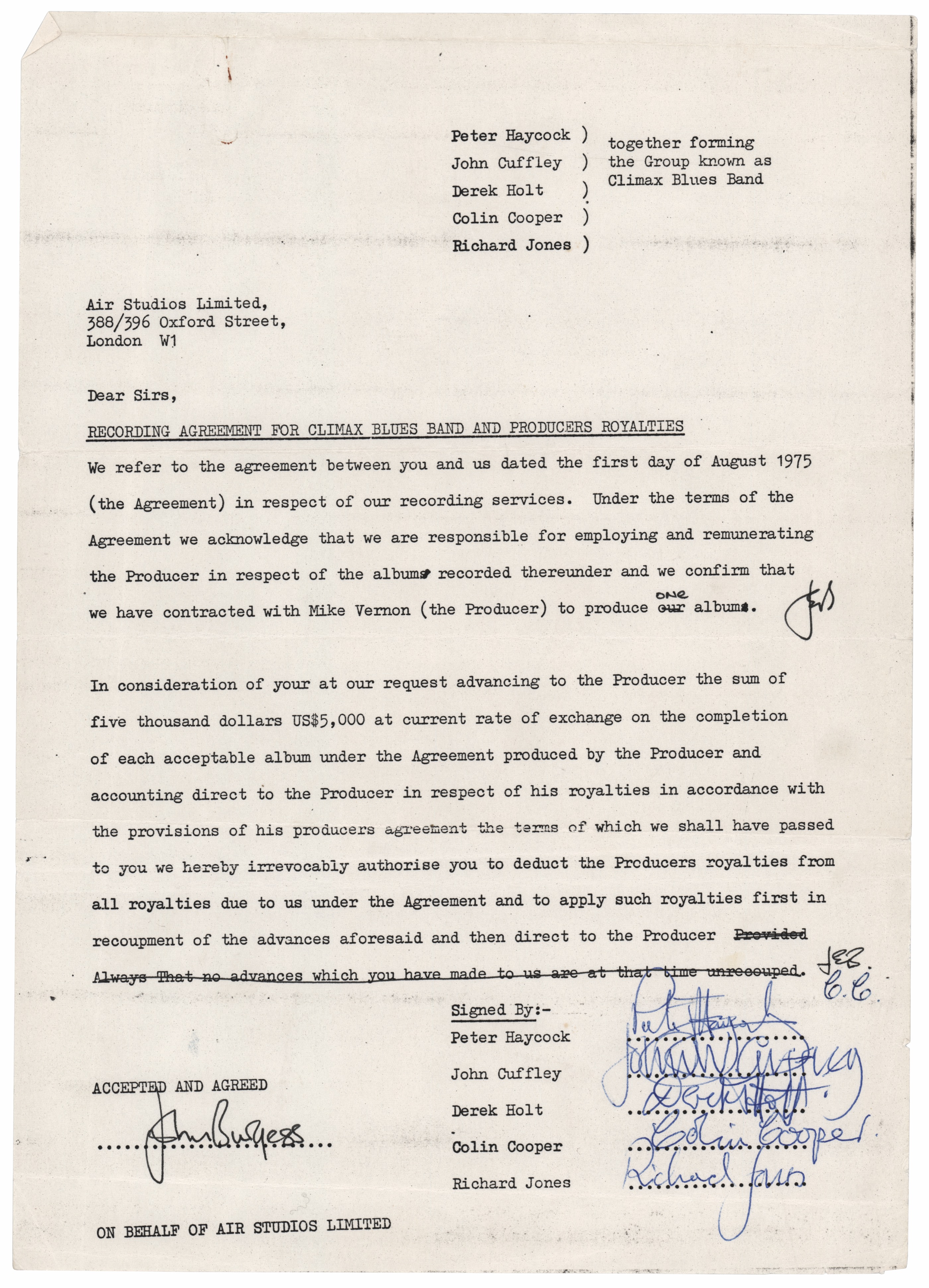 DS, one page, 8.25 x 11.75, August 1, 1975. A recording agreement between London’s Air Studios and the Climax Blues Band, signed at the conclusion in blue ballpoint by the band: Peter Haydock, John Cuffley, Derek Holt, Colin Cooper, and Richard Jones. The document is countersigned by John Burgess on behalf of Air Studios. In fine condition, with horizontal folds and light edgewear. Accompanied by a certificate of authenticity from Tracks.