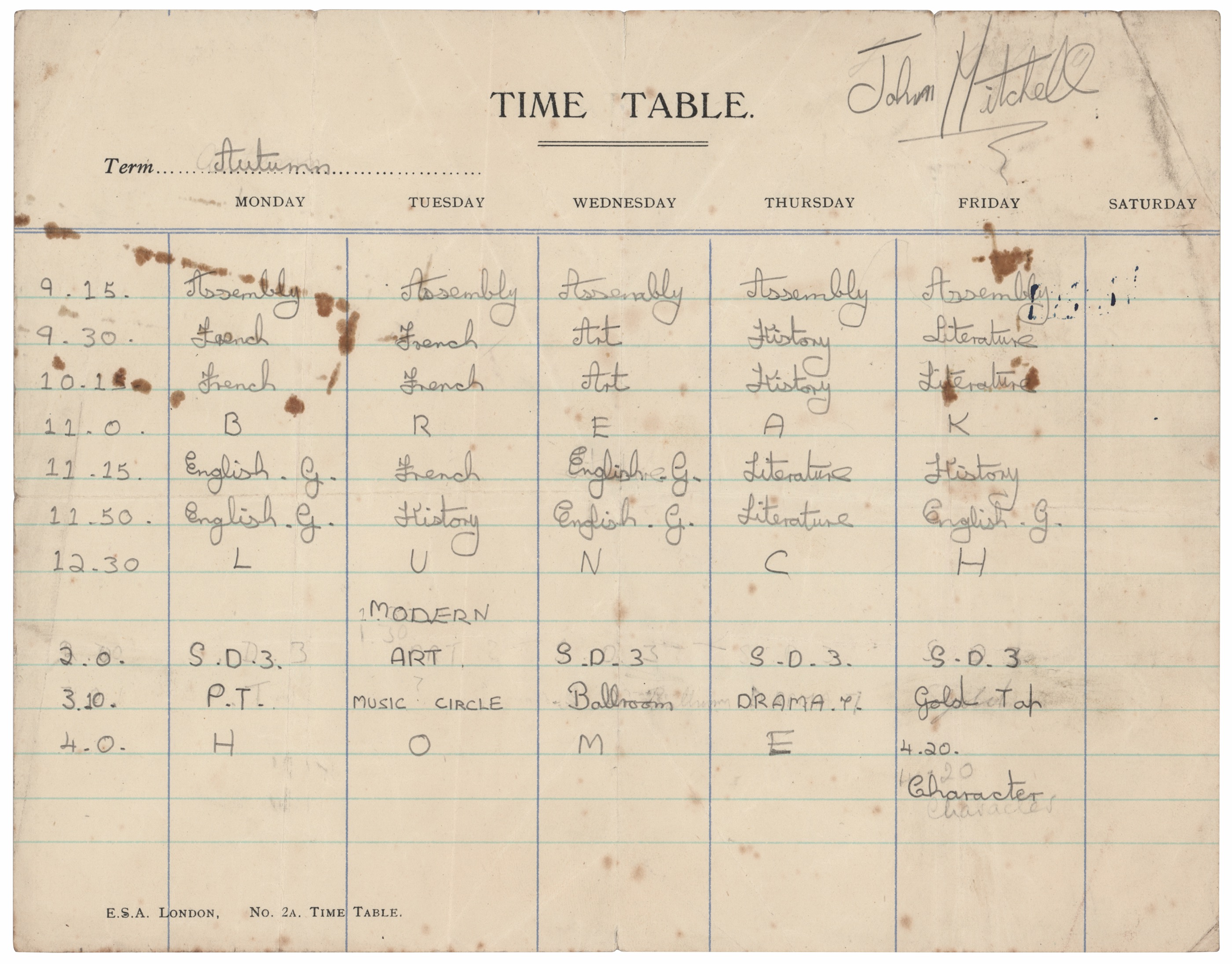 Mitch Mitchell’s circa 1950s original school ‘Time Table’ weekly class schedule, one page, 9 x 7, filled out in pencil by Mitchell, who has signed in the upper right corner with his given name, “John Mitchell.” Mitchell organizes his “Autumn” weekly schedule, listing classes like “French,” “English,” “History,” “Ballroom,” and “Music Circle.” In very good to fine condition, with light creasing and scattered stains. Accompanied by a certificate of authenticity from Tracks.