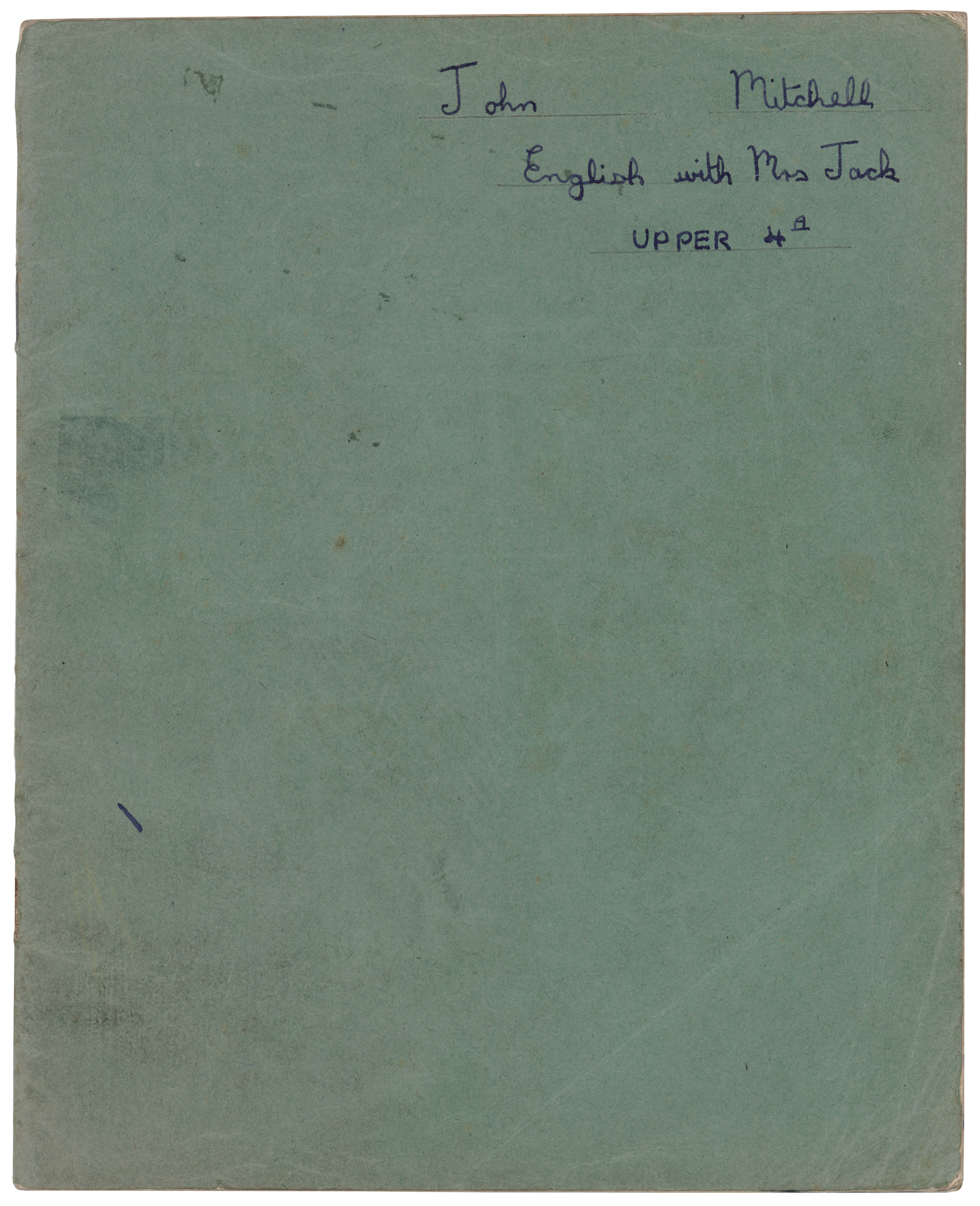 Mitch Mitchell’s circa 1950s original school notebook for English class, 36 pages, 6.5 x 8, signed on the front cover by Mitchell with his given name, “John Mitchell,” who adds below, “English with Mrs. Jack, Upper 4A.” The notebook contains 26 pages of handwriting from Mitchell, who completes a month-long chapter-by-chapter study on Jane Austen’s classic novel ​​Pride and Prejudice. Mitchell's teacher has added various edits and remarks in pink and red ink. In fine condition, with expected light wear. Accompanied by a certificate of authenticity from Tracks.