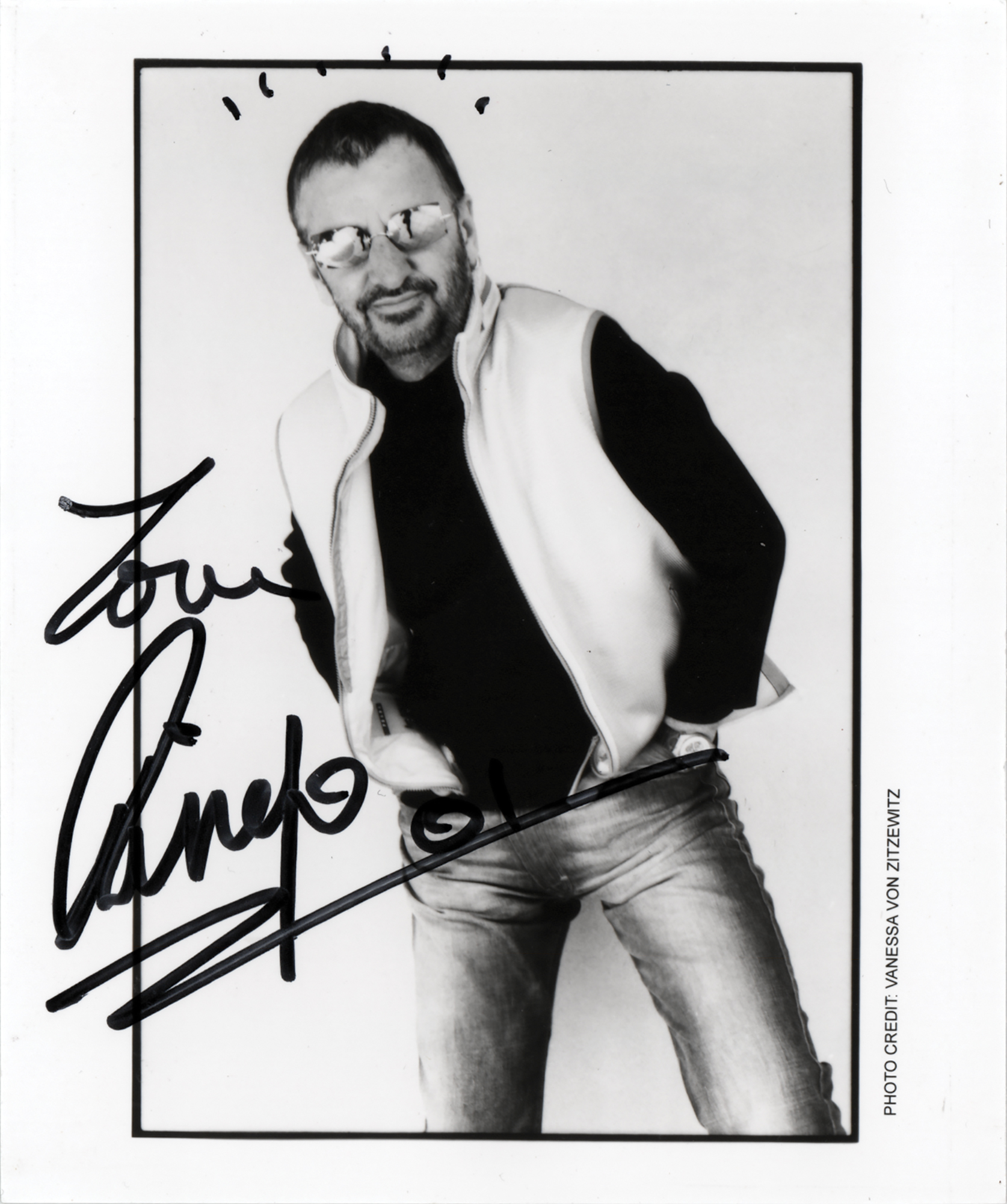 Semi-glossy 4.25 x 5 photo of Ringo Starr by German photographer Vanessa Von Zitzewitz, signed in black felt tip, “Love, Ringo,” who adds several lines above his head. In very fine condition. Accompanied by a certificate of authenticity from Tracks.