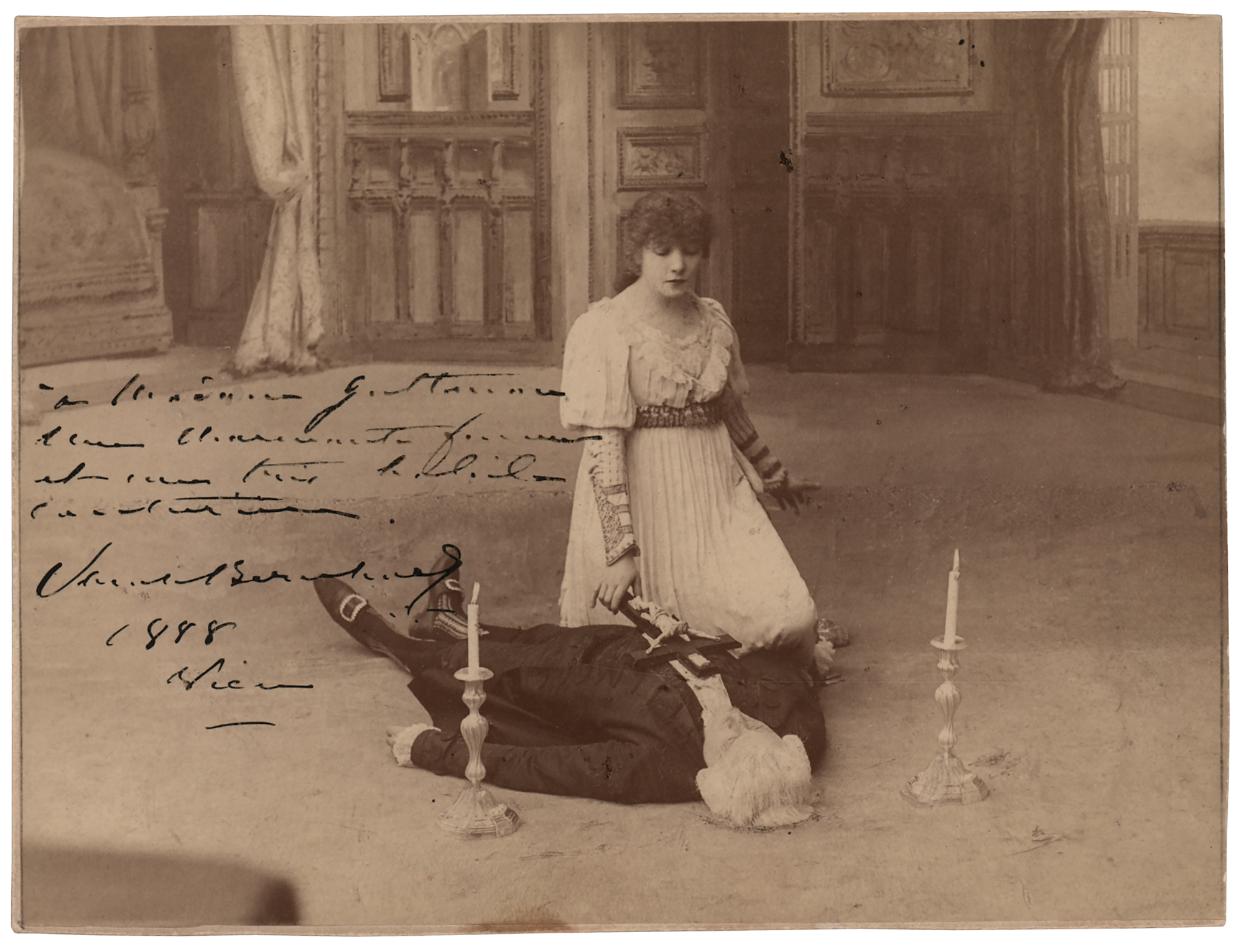 Uncommon 5.5 x 4.25 mounted albumen portrait of Sarah Bernhardt in character by Nadar, neatly signed and inscribed in ink by the acclaimed actress, and dated 1888. In fine condition, with slightly trimmed edges.