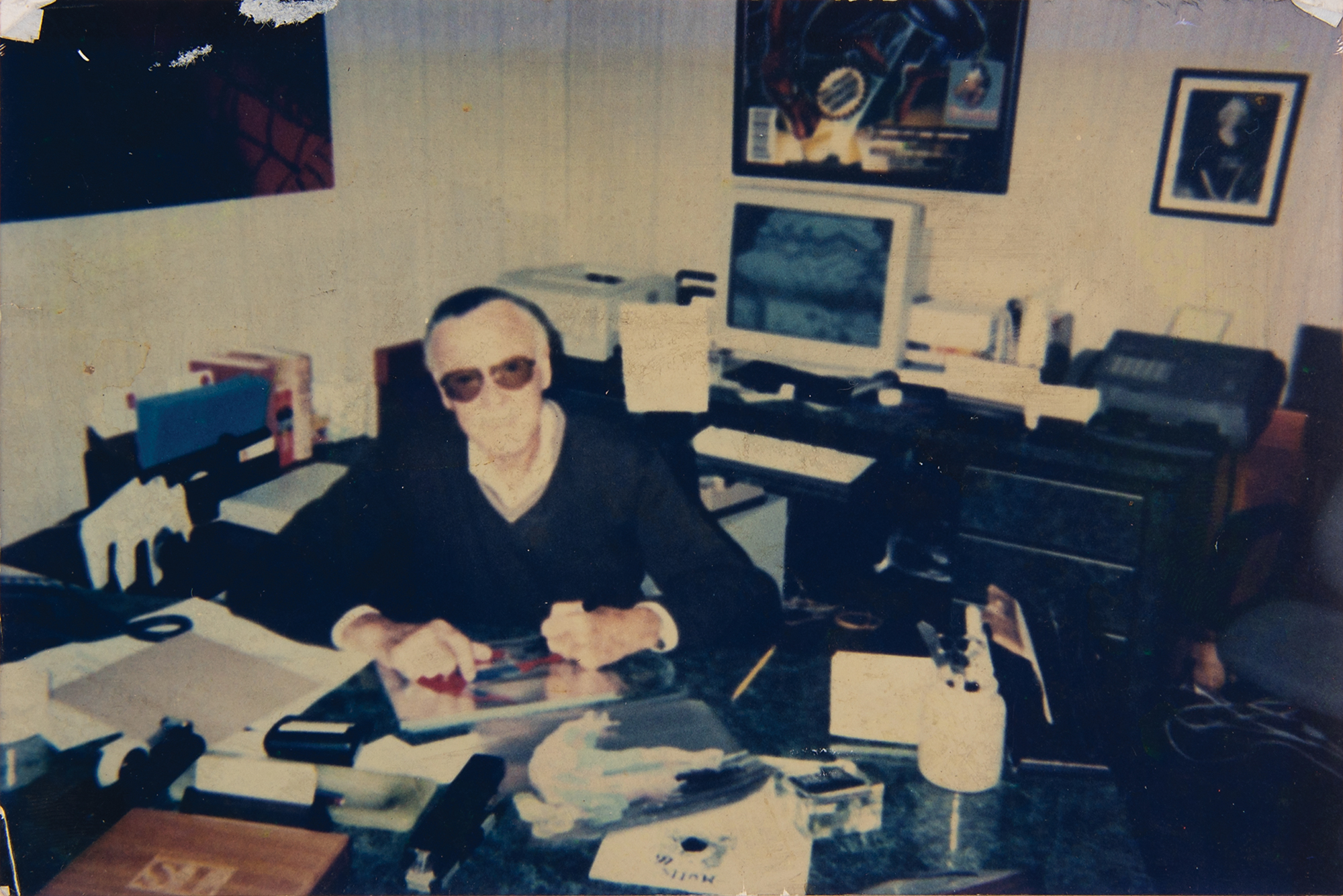 Appealing 9.5 x 7.5 sericel featuring a classic Spiderman image set against a color copy background, signed in the lower left corner in black felt tip by Stan Lee. The piece has a Marvel Studios seal to the lower right. Nicely matted and framed to an overall size of 15.5 x 12.5. In fine condition. Accompanied by a photo of Stan Lee taken during the autograph session.