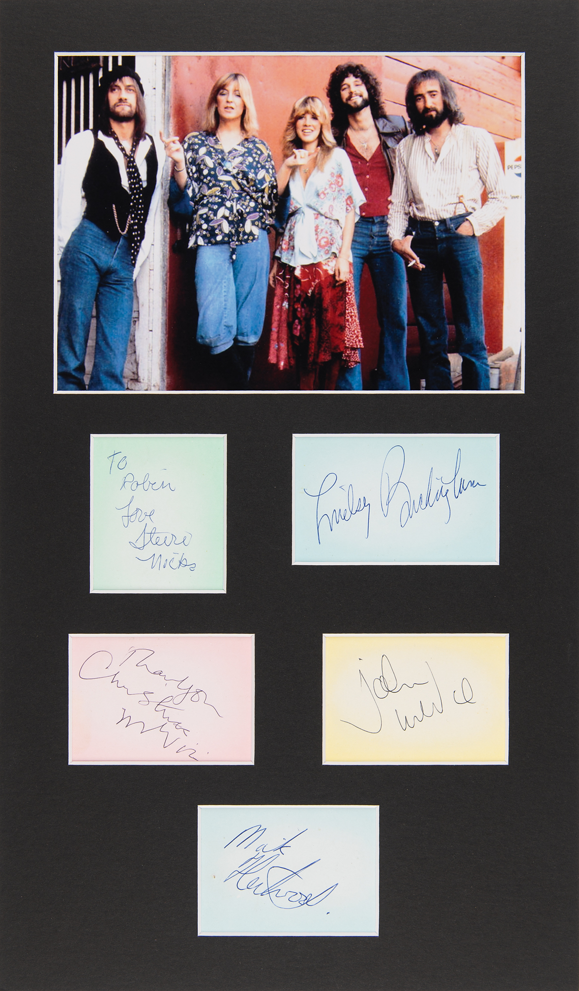 Vintage blue and black ballpoint signatures of Fleetwood Mac??Mick Fleetwood,? ?John McVie,? ?Lindsey Buckingham,? ?Thank you, Christine McVie,? and ?To Robin, love, Stevie Nicks??on five multi-colored sheets ranging in size from 3 x 2 and 2.25 x 2.5. Matted with a Rumours-era photo of the band to an overall size of 9.5 x 16.75. In overall fine condition. The consigner notes that the autographs were obtained in Australia in 1977, during the Australian leg of Fleetwood Mac?s Rumours Tour.