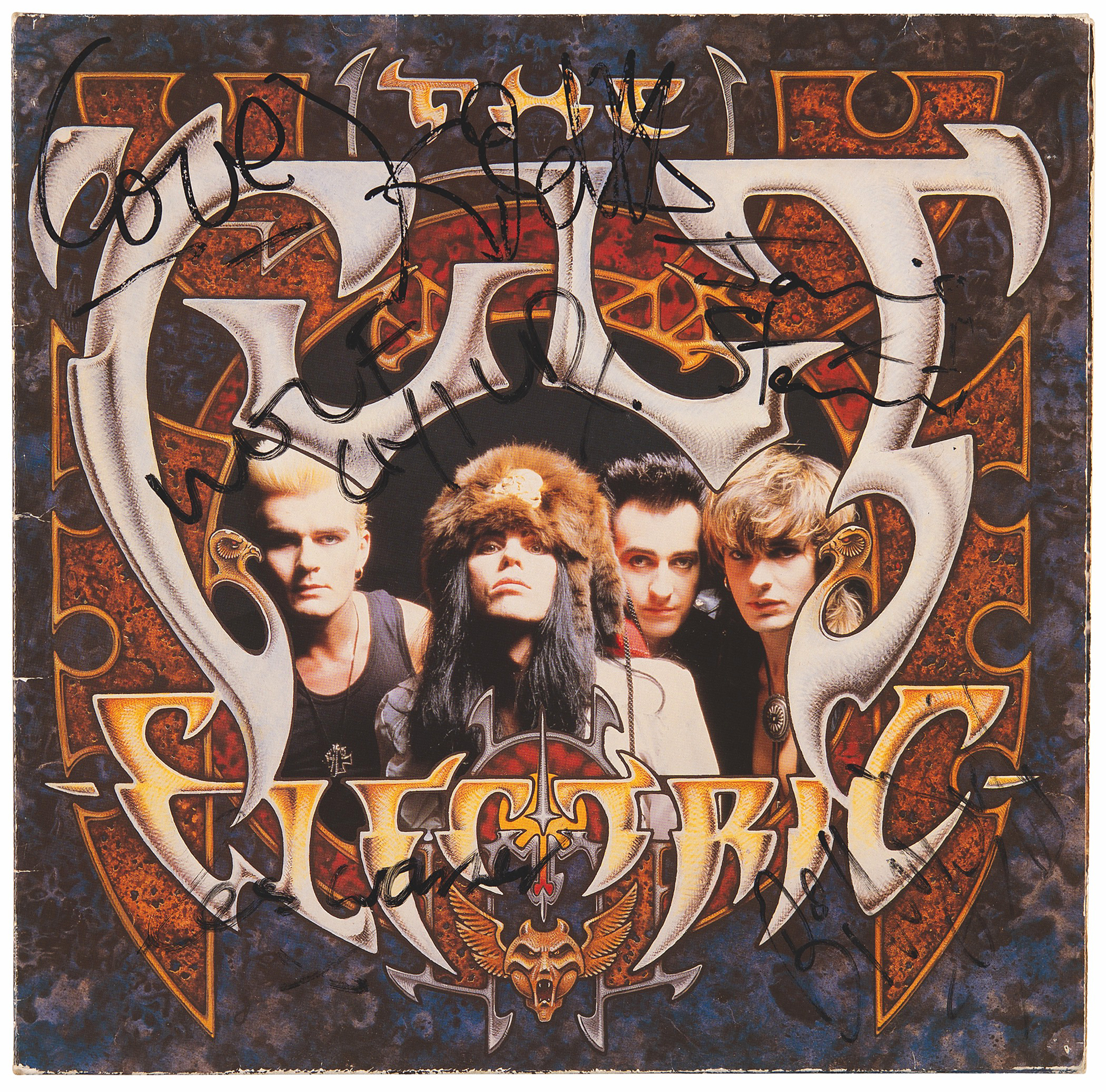Electric album by The Cult, signed on the front cover in black felt tip by Ian Astbury ("Wolf Child, x"), Billy Duffy, Jamie Stewart, Les Warner, and Kid Chaos. In fine condition. The record is not included. The consignor notes that the signatures were obtained in Australia in October 1987 during their 'Electric World Tour.'