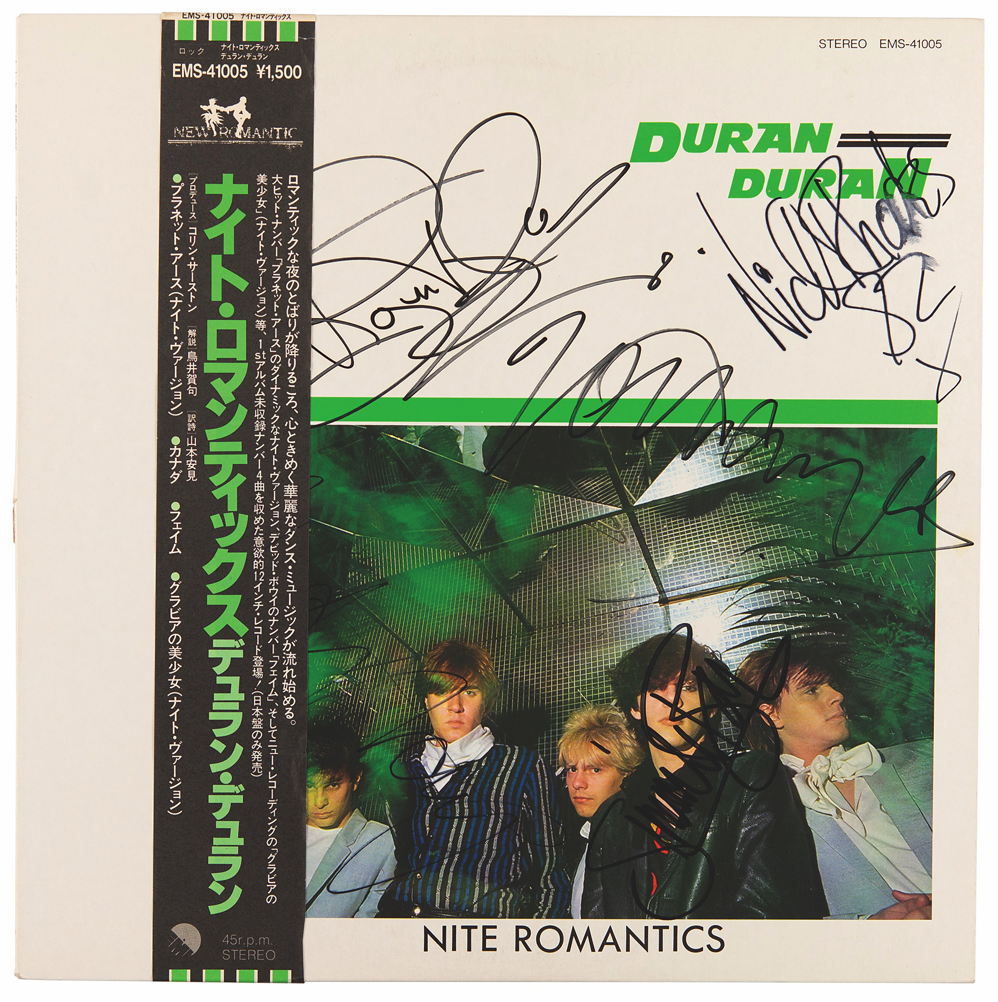 EMI Records Japanese pressing of Duran Duran’s Nite Romantics album signed on the front cover in black felt tip by Simon Le Bon, Roger Taylor, Nick Rhodes, Andy Taylor, and John Taylor. In fine condition, with a brush to Rhodes' last name. The record is included. The consignor notes that the signature was obtained on April 15, 1982, in Adelaide, Australia, during the band's 'Rio' tour.