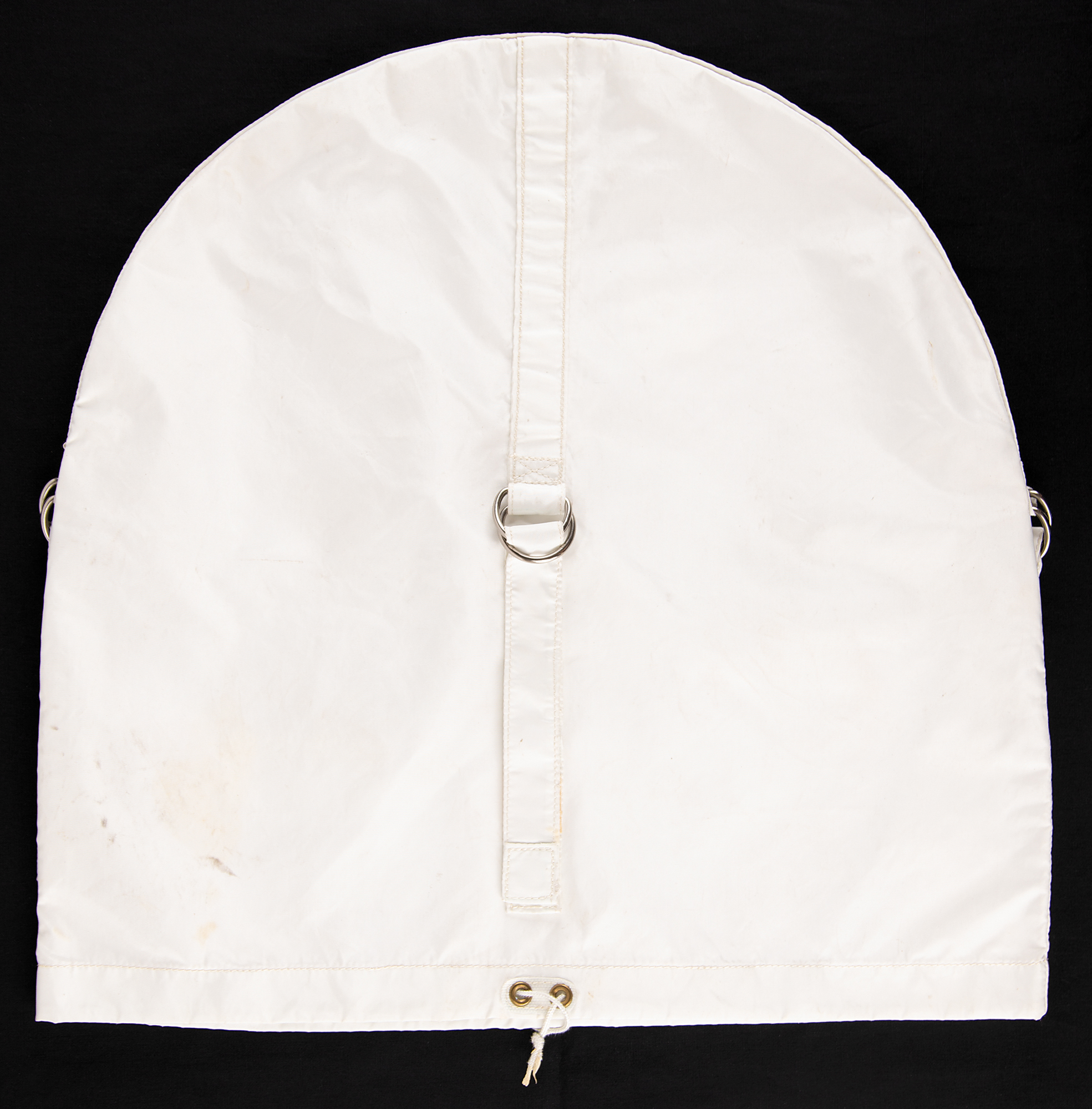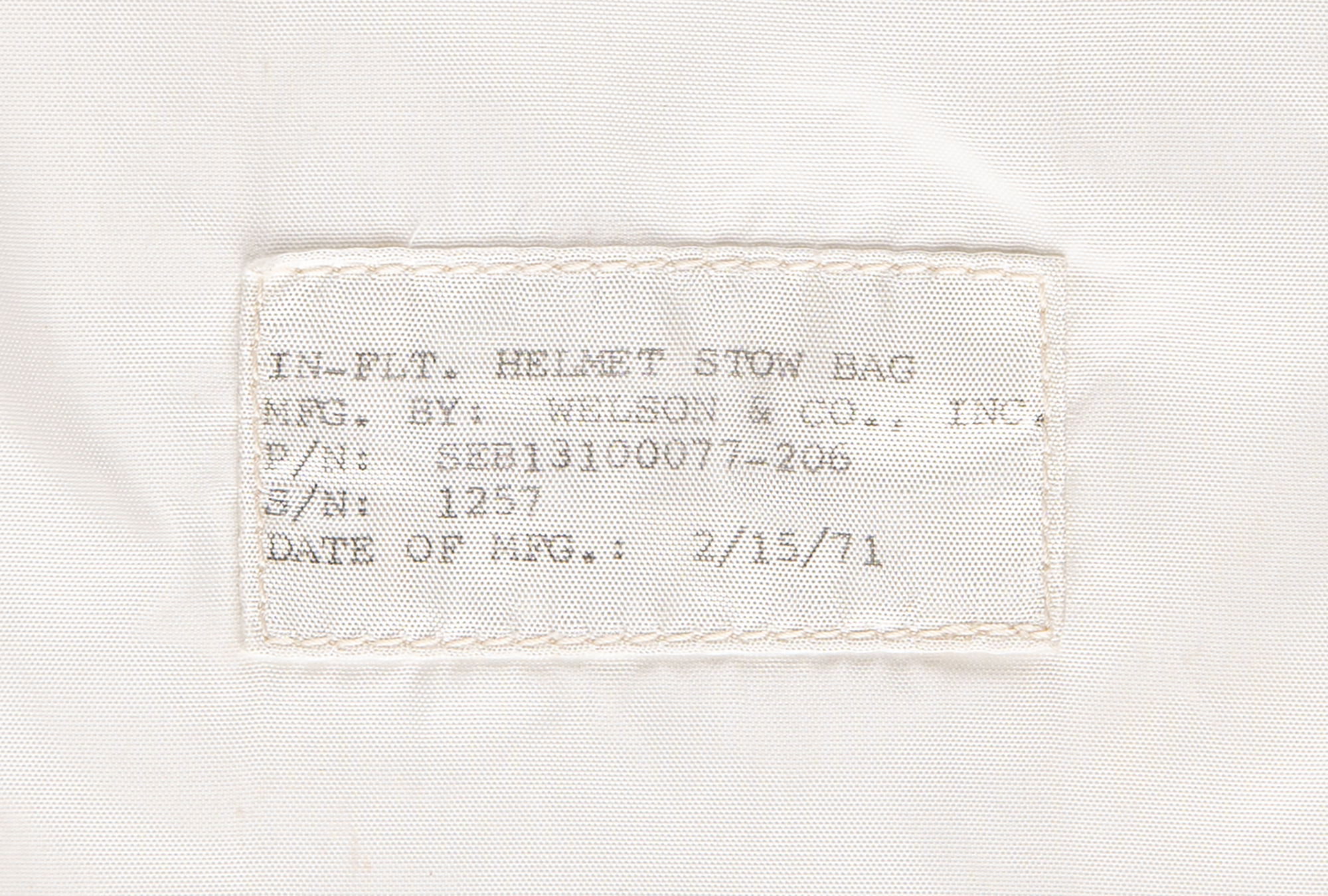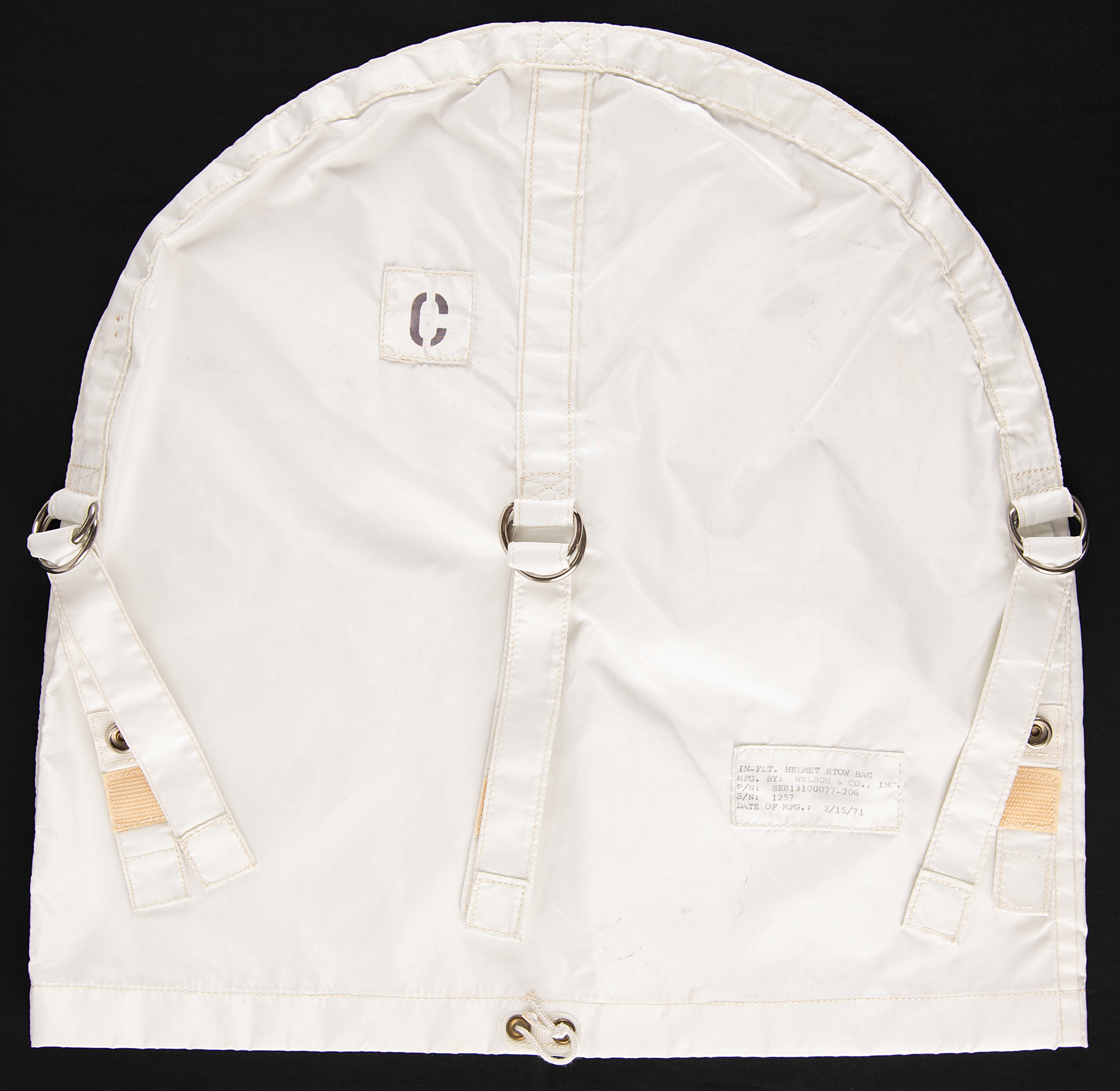 Rare Apollo Command Module In-Flight Helmet Stowage Bag (HSB), constructed from white Beta cloth and measuring approximately 18˝ x 18˝, with the manufacturer's tag sewn toward the bottom: "In-Flt. Helmet Stow Bag, Mfg. By: Welson & Co., Inc., P/N SEB13100077-206, S/N: 1257, Date of Mfg.: 2/15/71." The bag features four Velcro stowage straps with snaps, a drawstring at the base, and a "C" patch assigning it to the crewman in the 'Center' seat (the Command Module Pilot). The date and serial number of the stowage bag align it with the canceled Apollo 18, 19, and 20 flights, originally scheduled for 1973–74. In fine condition.
