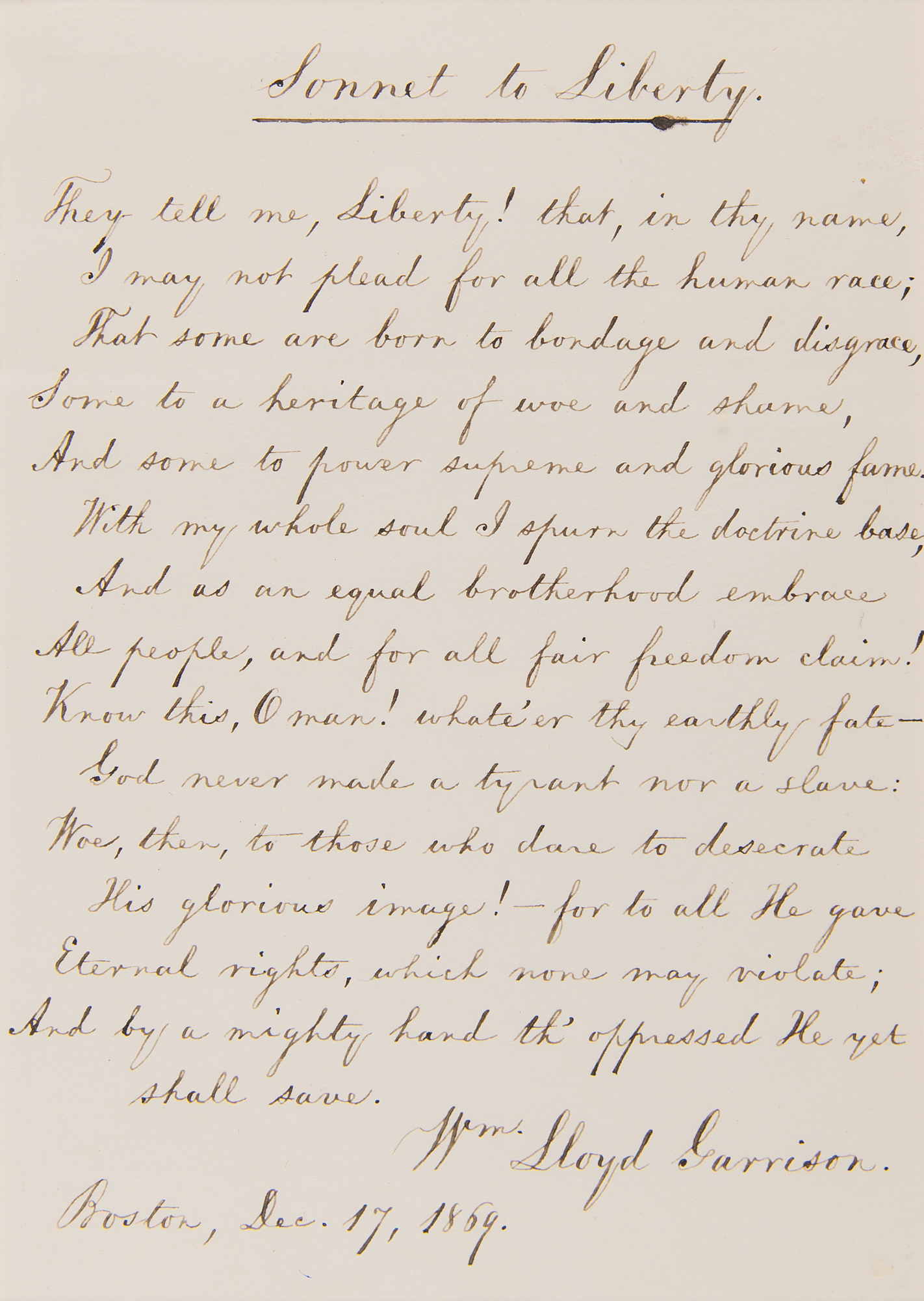 Journalist, editor, and social reformer (1805-1879) best known as one of the most influential abolitionists in the decades leading up to the Civil War. Two outstanding autographs of William Lloyd Garrison: an ALS signed "Wm. Lloyd Garrison," one page, 5 x 7, December 17, 1869, in part: "In compliance with your request, I send you my autograph; copying, for this purpose, on the third page of this sheet, one of the Sonnets that I wrote during the Anti-Slavery struggle. How signally the truth, prophetically expressed in the concluding lines, has been fulfilled in our national career of oppression within the last ten years!"; and the enclosed "Sonnet to Liberty," signed "Wm. Lloyd Garrison," one page, 5 x 7, concluding: "Know this, O man! whate'er thy earthly fate— / God never made a tyrant nor a slave: / Woe, then, to those who dare to desecrate / His sacred image!—for to all He gave / Eternal rights, which none may violate; / And by a mighty hand th' oppressed He yet shall save." Attractively matted and framed together with an engraved portrait of Garrison (featuring his facsimile signature) to an overall size of 20 x 11; the frame's backing bears an affixed Goodspeed's Book Shop label. In overall fine condition.