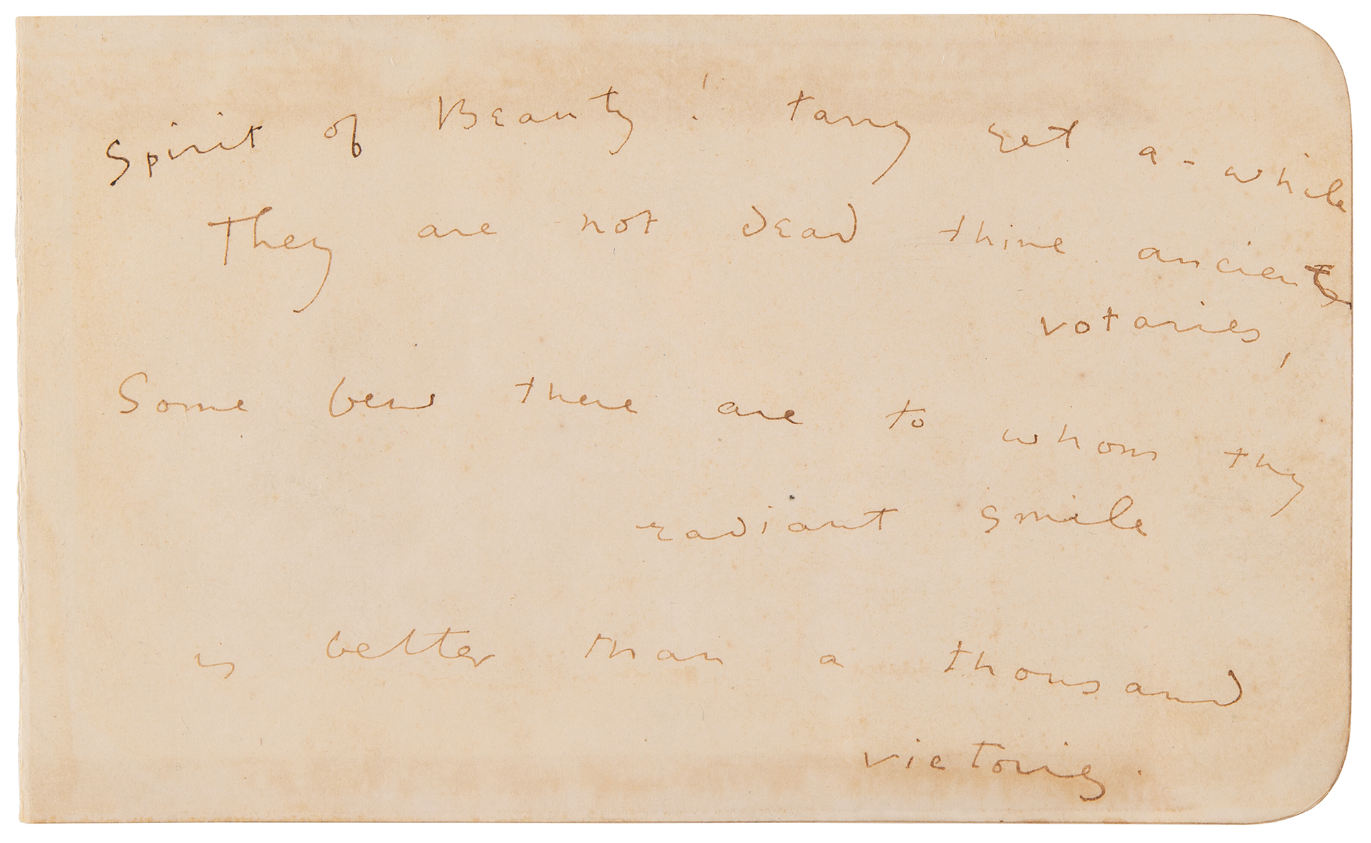 AQS signed "Oscar Wilde," on two off-white 6.5 x 4 album pages adjoined at the center, June 26, 1882. Wilde quotes a stanza from his poem 'The Garden of Eros,' in full: "Spirit of Beauty! tarry yet a-while, / They are not dead, thine ancient votaries, / Some few there are to whom thy radiant smile / Is better than a thousand victories." In fine condition, with light show-though from old mounting residue along the back edges.