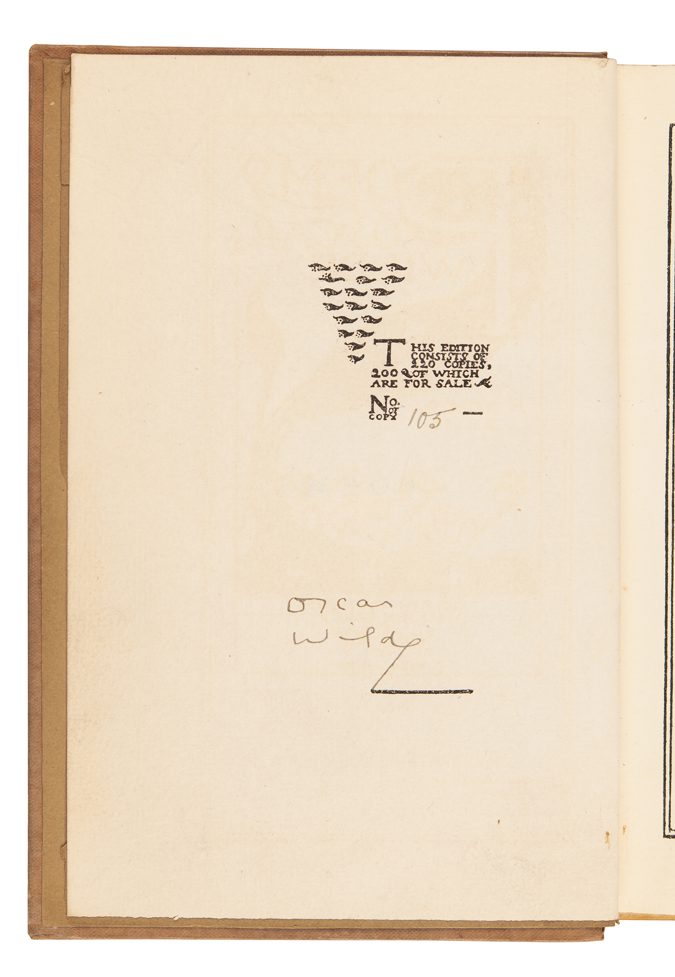 Signed book: Poems by Oscar Wilde. Limited edition, numbered 105/220. London: Elkin Mathews and John Lane, 1892. Hardcover bound in the original gilt-blocked cloth, top edge gilt, 5.25 x 7.5, 234 pages. Neatly signed on the colophon in ink, "Oscar Wilde." Autographic condition: fine. Book condition: VG/None, with chipping to edges of endpapers, minor wear to the bottom of the spine, and a bookplate ("F. Wyndham Goldie") affixed inside the front cover. Accompanied by a custom-made clamshell presentation case.