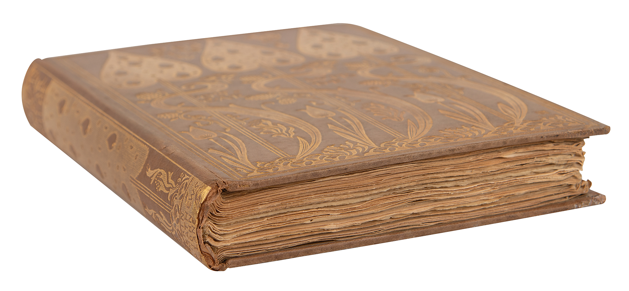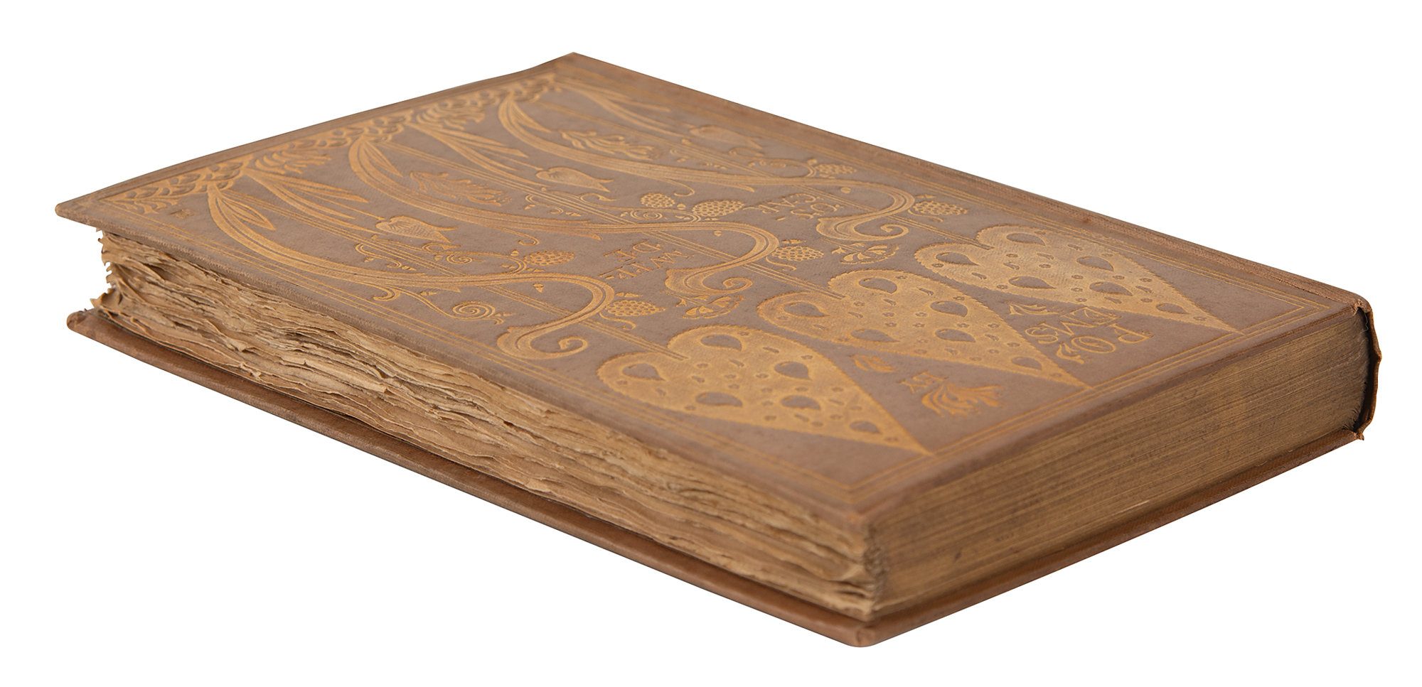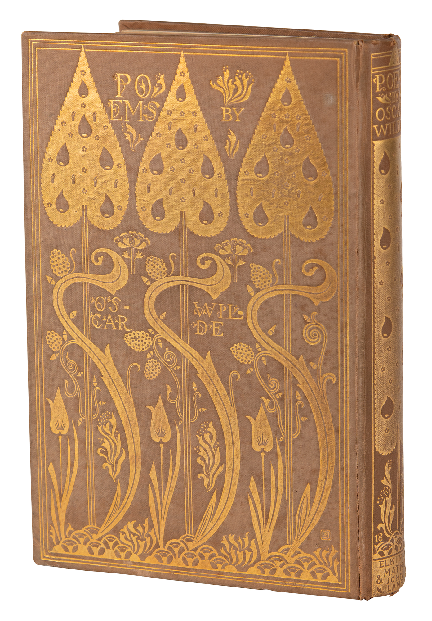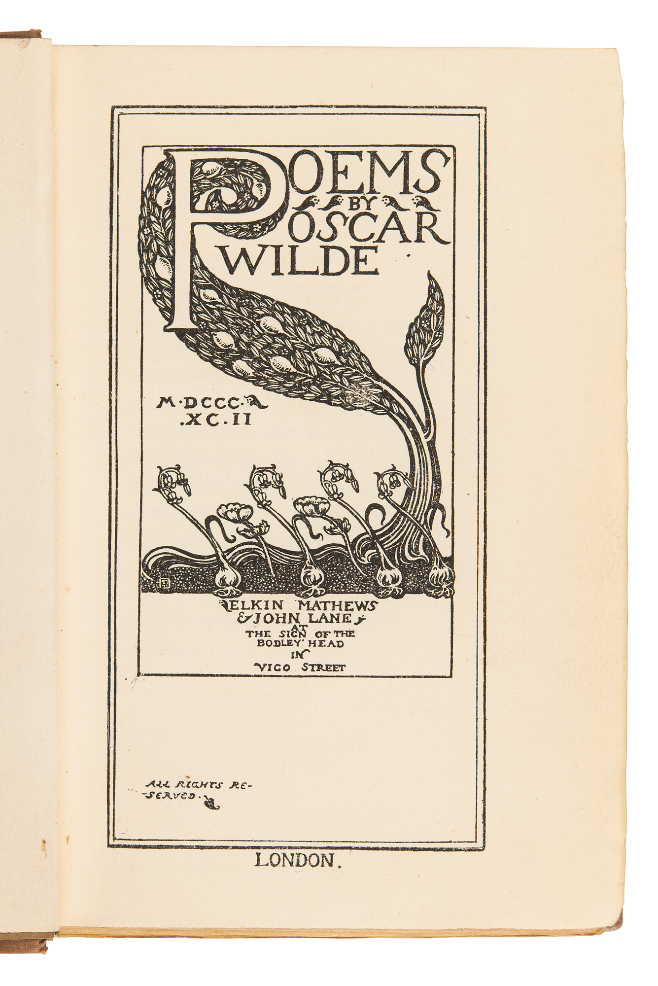 This edition of Wilde's Poems used the sheets of David Bogue's fifth edition of 1882—which incorporated several substantive additions and amendments (cf. Mason 308)—with a cancellans bifolium designed by Ricketts and bearing the half-title, limitation statement, and title. The penultimate leaf Q6, which bore Bogue's advertisements, was excised. A binding design ('The Seven Trees,' in gold on Iris cloth, Mason 309) was also commissioned from Ricketts, and the book was published on May 26, 1892, at 15 shillings.