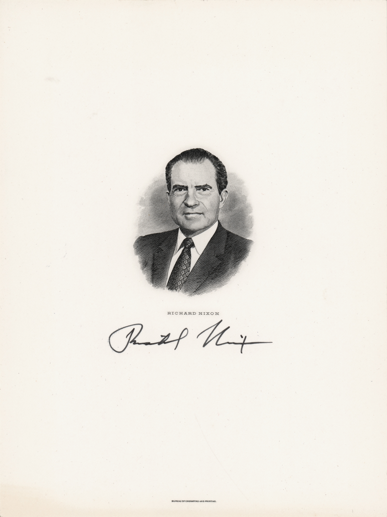 Engraved portrait of Richard Nixon by the Bureau of Engraving and Printing, 6 x 8, signed below in black felt tip. In very fine condition.