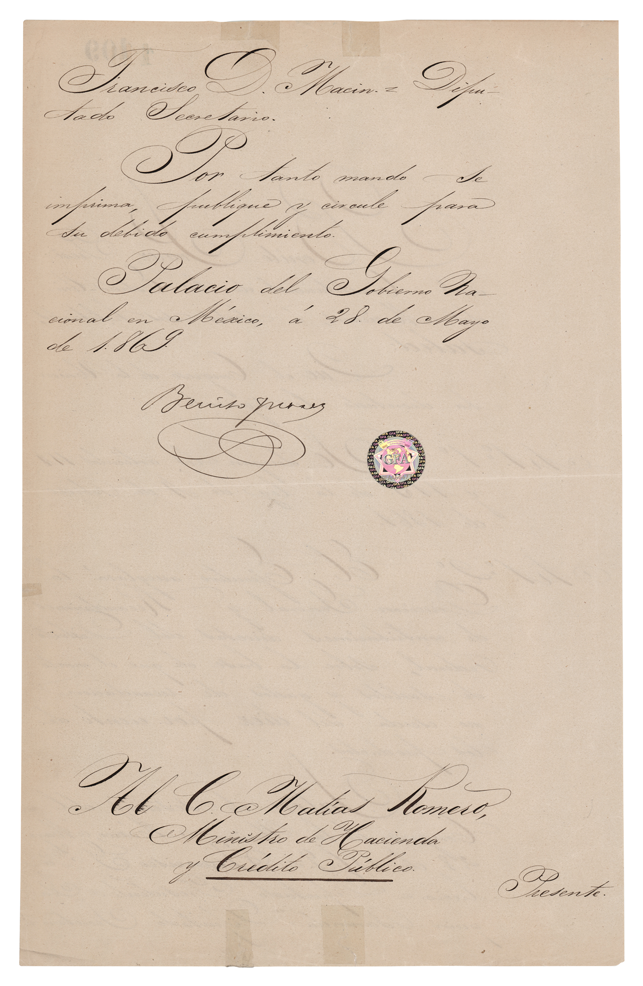 Indigenous Mexican statesman (1806-1872) who served as the country's president from 1858 until his death. Document, signed by Juarez as president of Mexico, to Matias Romero, Minister of Finance and Public Credit, announcing the decisions of the Congress of the Union. In part, "The Executive Power will arrange for the…collection of direct taxes of the Federal District to determine that the basis of the total amount of salaries and expenses collected should be no more than 10% of the value of the products." In fine condition, with an authenticity label affixed next to Juarez's signature.