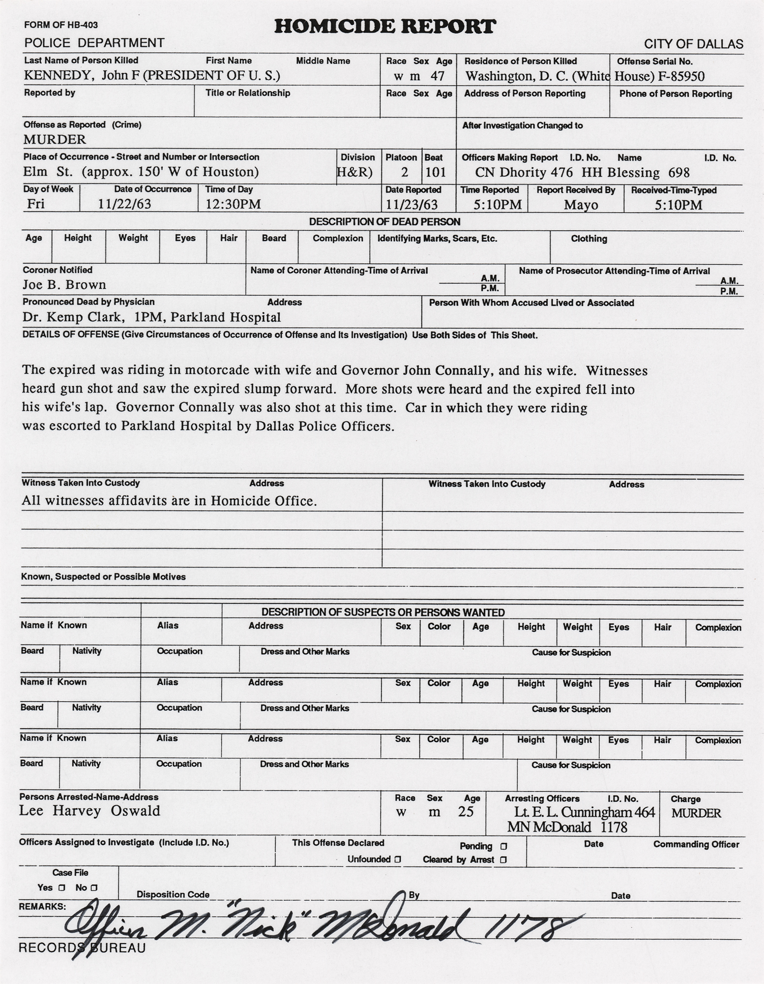Souvenir facsimile copy of the Dallas Police Department homicide report for President John F. Kennedy, one page, 8.5 x 11, dated November 22, 1963, the day that Oswald was arrested for shooting President John F. Kennedy and Police Officer J. D. Tippit. The lower section lists Lee Harvey Oswald as the arrested suspect and “MN McDonald, 1178” as the arresting officer. Signed in the lower border in black felt tip, “Officer M. ‘Nick’ McDonald, 1178.” In very fine condition.