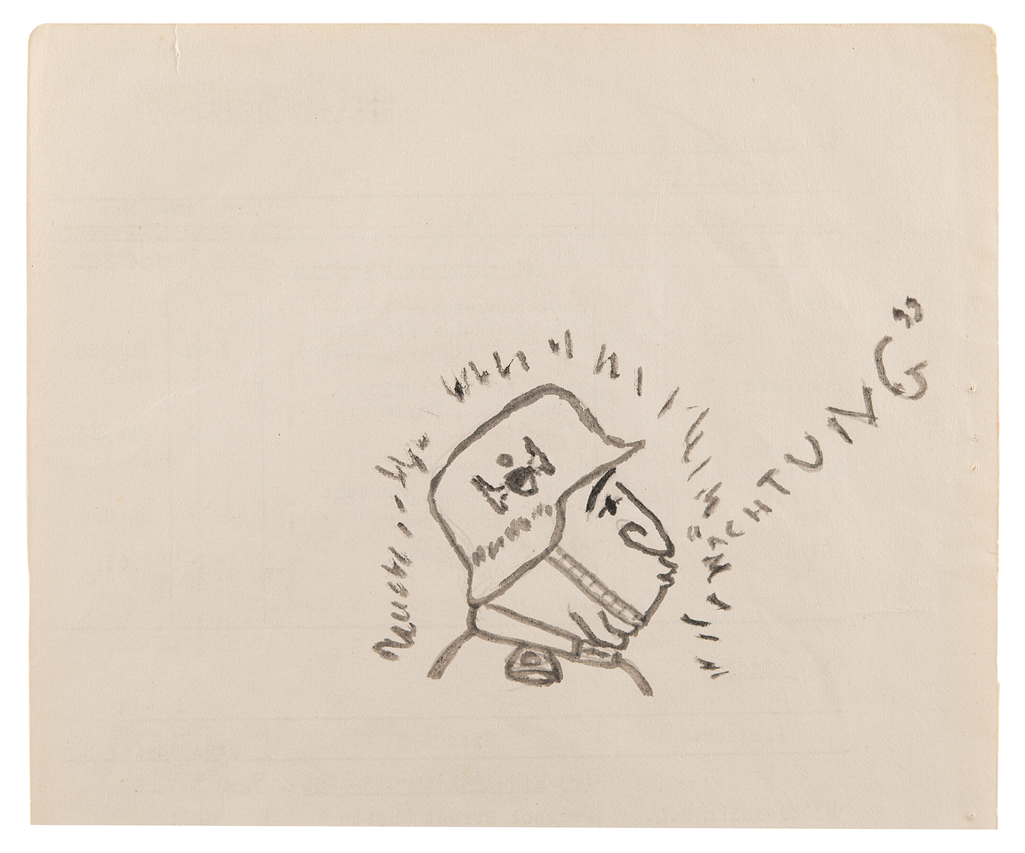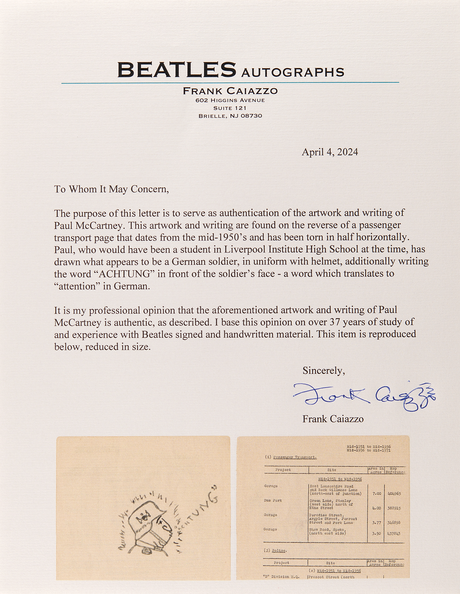 Original sketch by Paul McCartney as a student at the Liverpool Institute High School for Boys in the mid-1950s. Accomplished in black ink on the reverse of an off-white 8 x 6.5 trimmed ‘Passenger Transport’ sheet, the drawing depicts a German soldier in profile, with McCartney adding the word “ACHTUNG” near the soldier's mouth. In fine condition. Accompanied by a letter of authenticity from noted Beatles expert Frank Caiazzo.